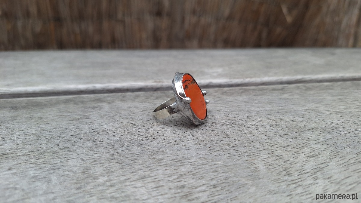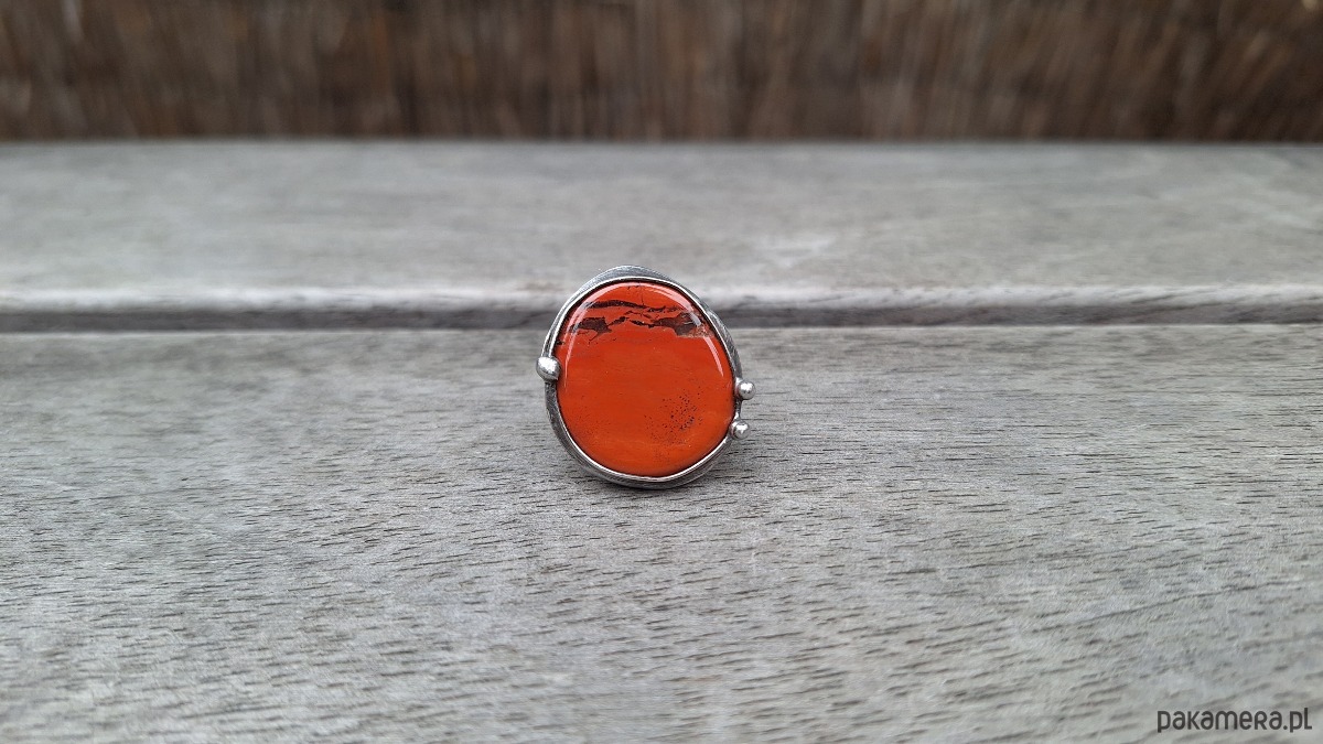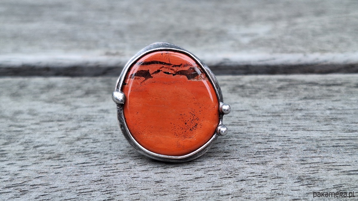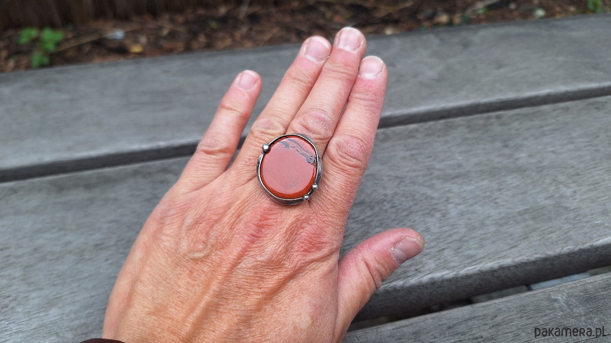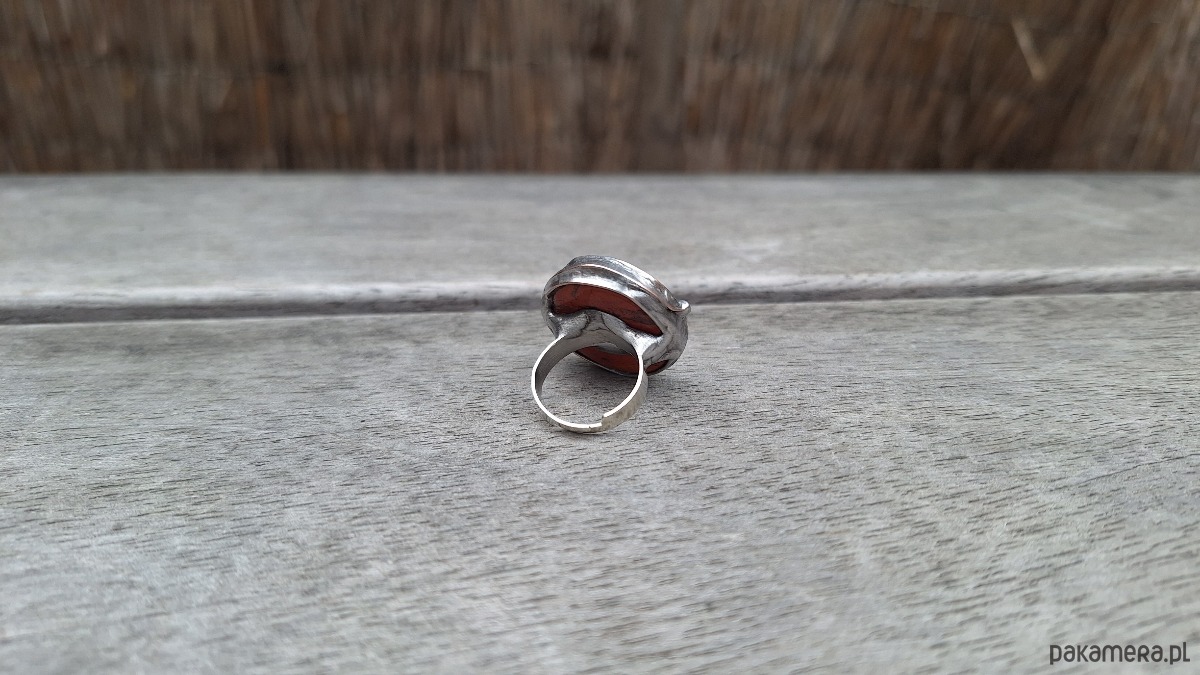 Pierścionek wykonany z miedzi, cyny i jaspisu. Wymiary ok. 3 na 2.5 cm. Regulowany. Nie jest ciężki.