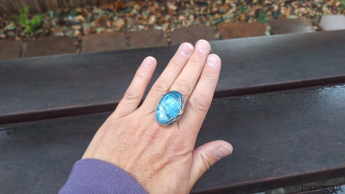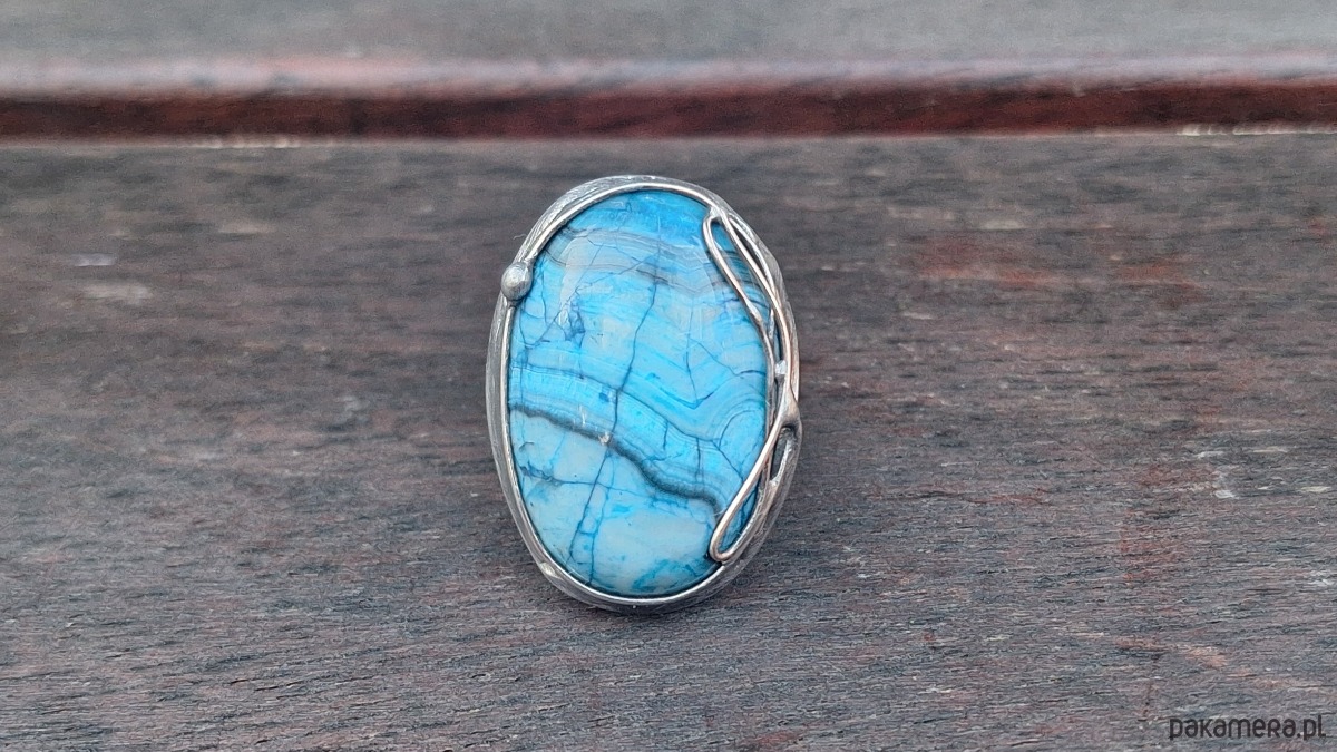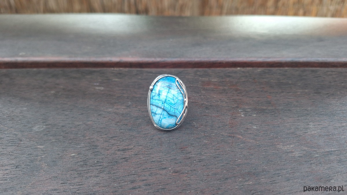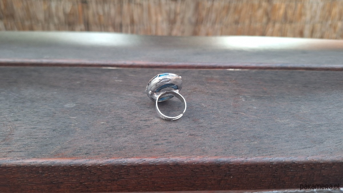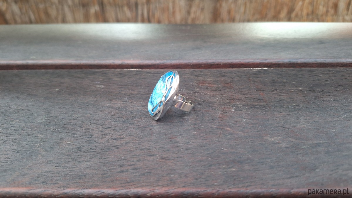 Pierścionek wykonany z miedzi, cyny i jaspisu. Wymiary ok. 3 na 2 cm. Regulowany. Nie jest ciężki.