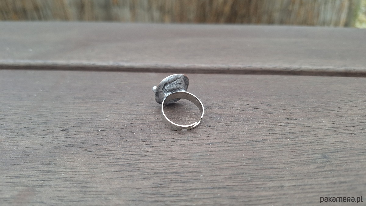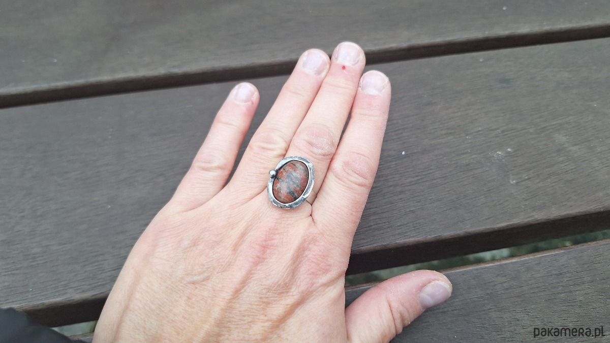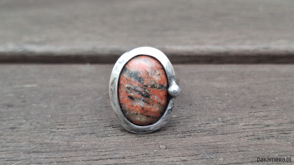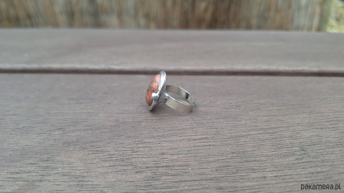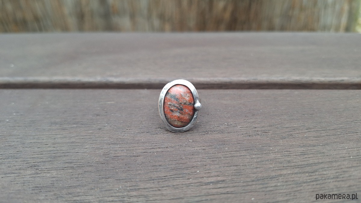 Pierścionek wykonany z miedzi, cyny i jaspisu. Wymiary ok. 2 na 1.5 cm. Regulowany. Nie jest ciężki.