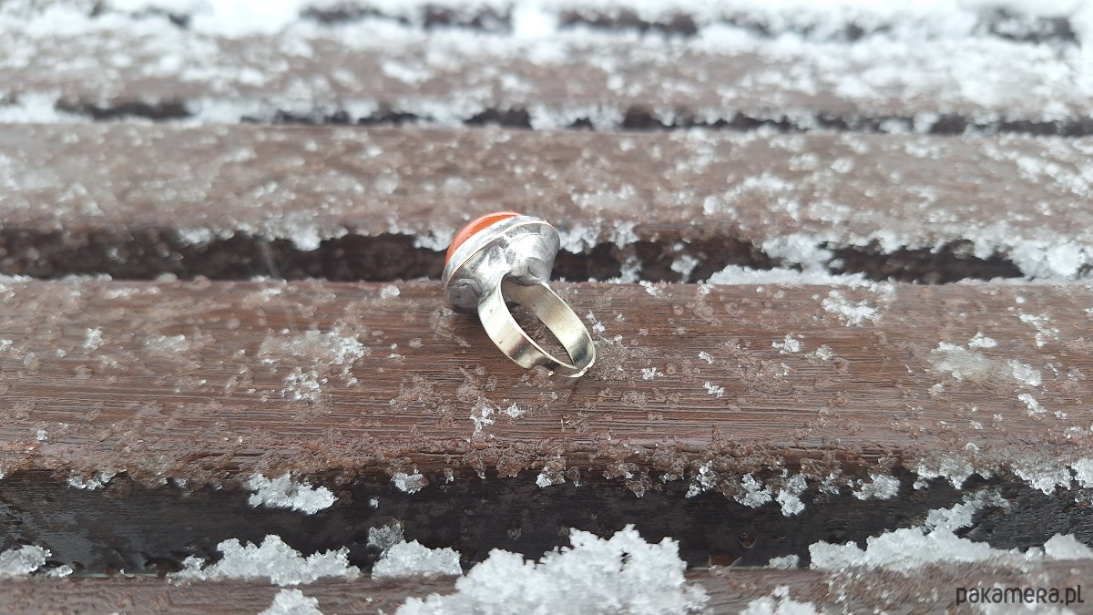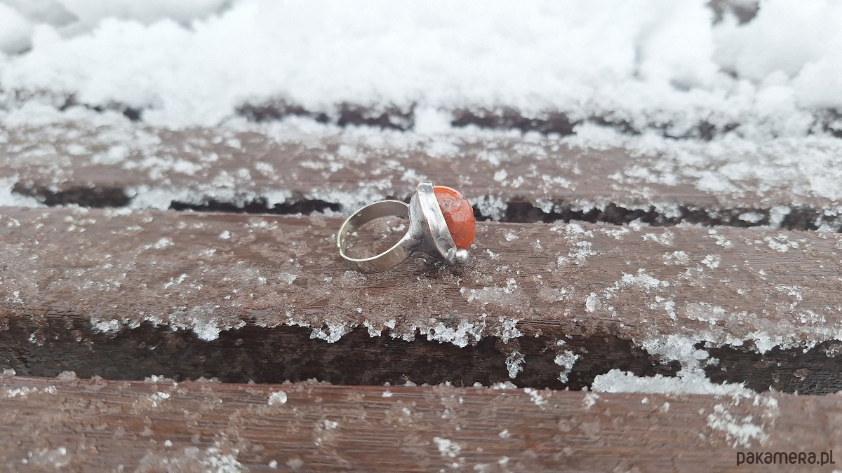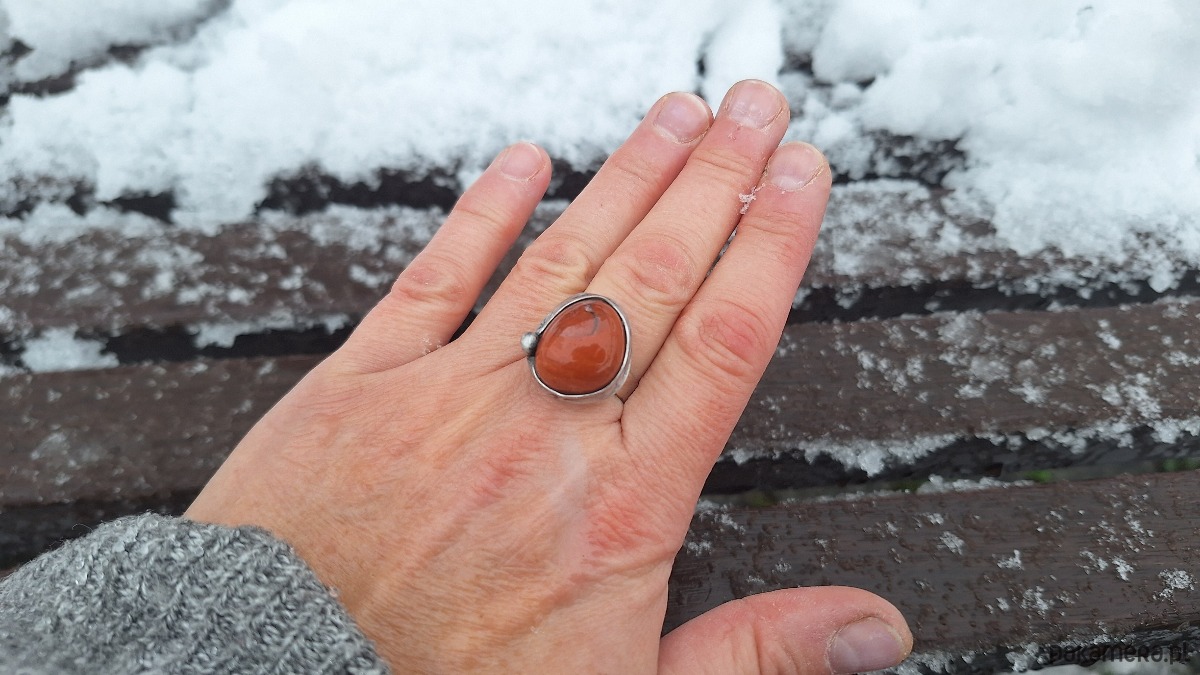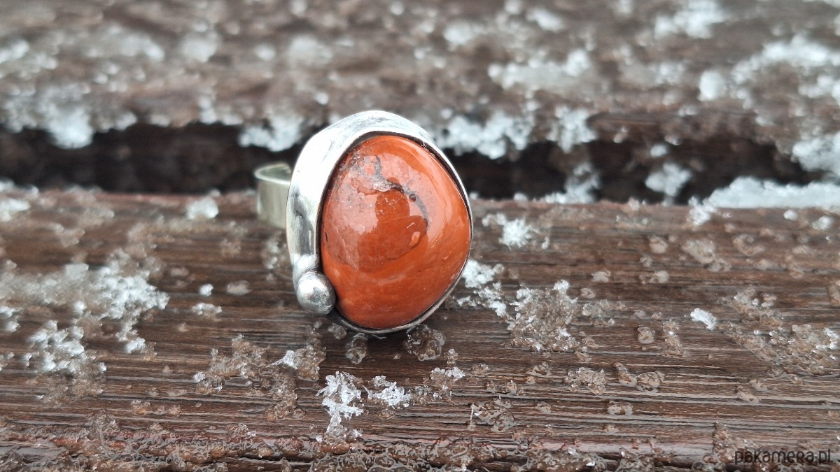 Pierścionek wykonany z miedzi, cyny i jaspisu. Wymiary ok. 1.8 na 1.6 cm. Regulowany. Nie jest ciężki.
