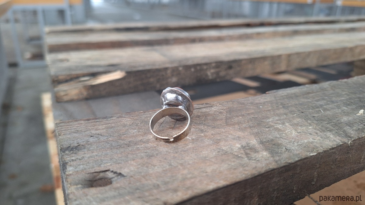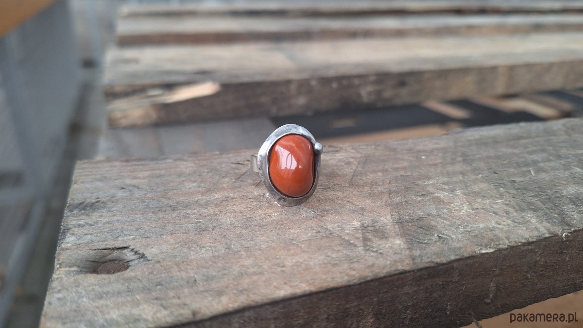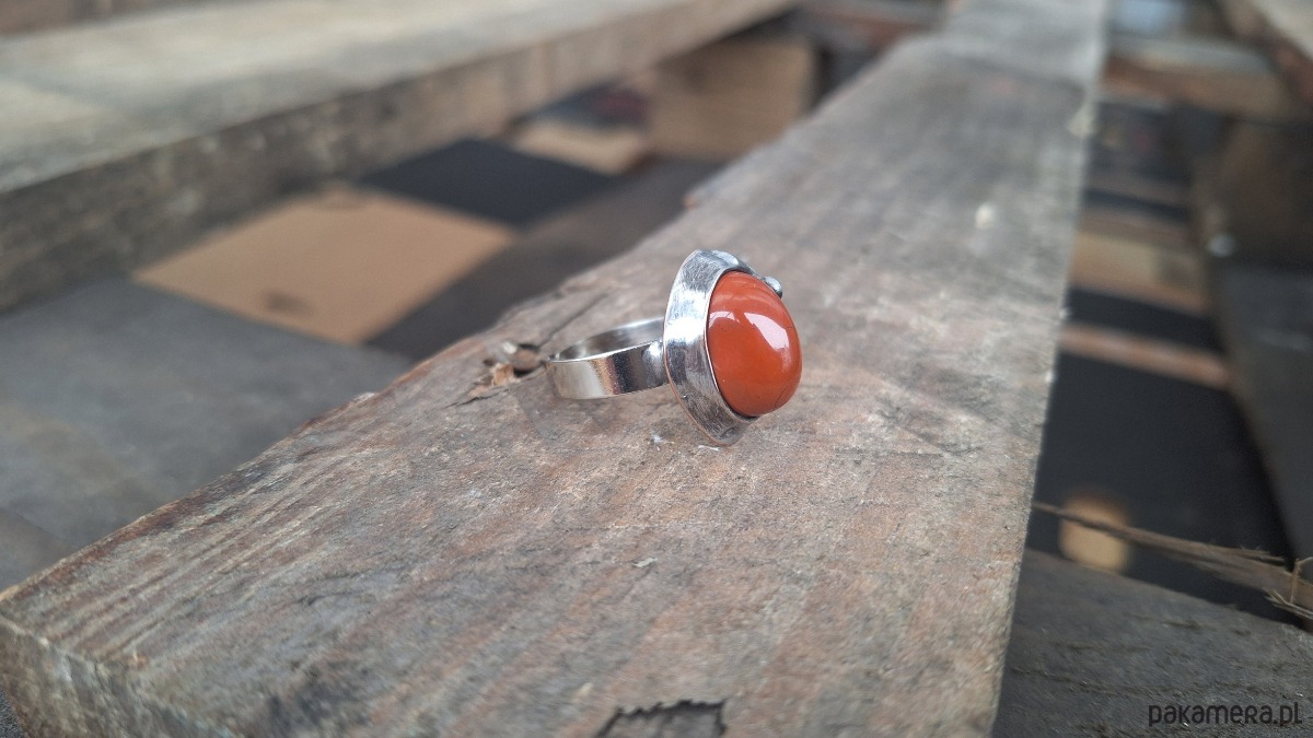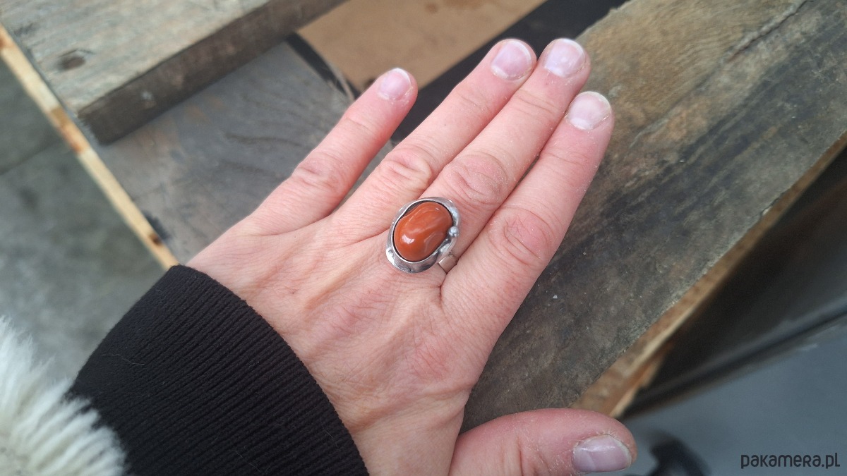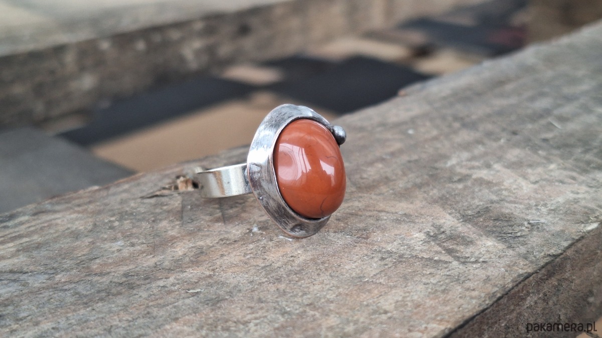 Pierścionek wykonany z miedzi, cyny i jaspisu. Wymiary ok. 2 na 1.3 cm. Regulowany. Nie jest ciężki.