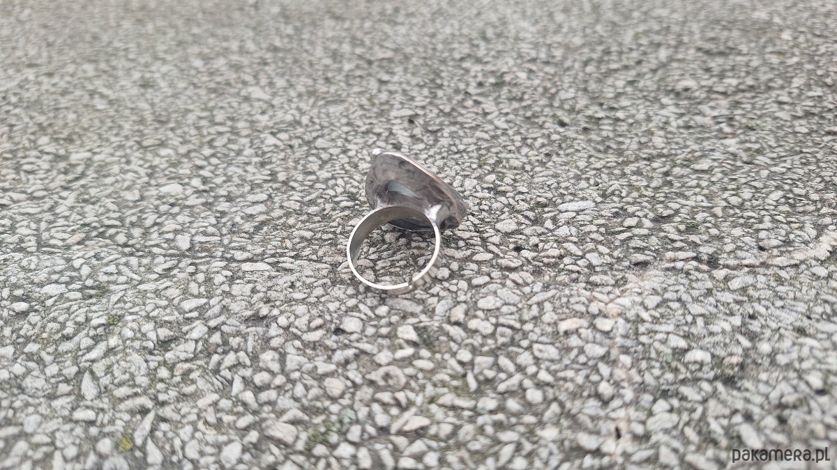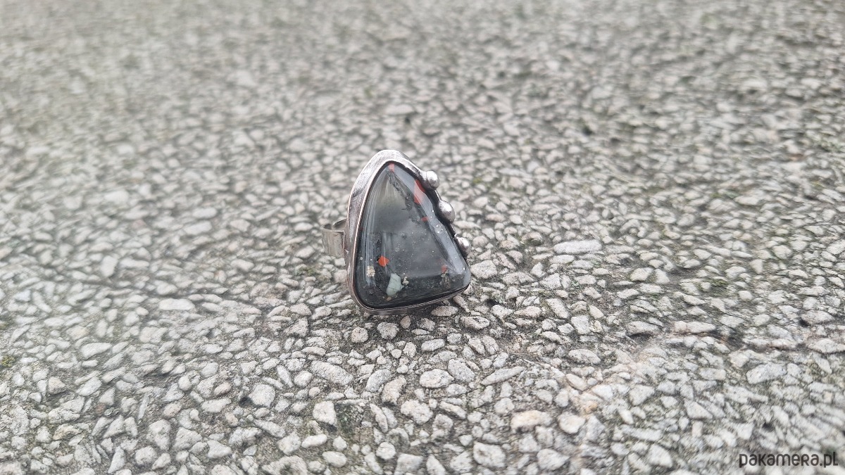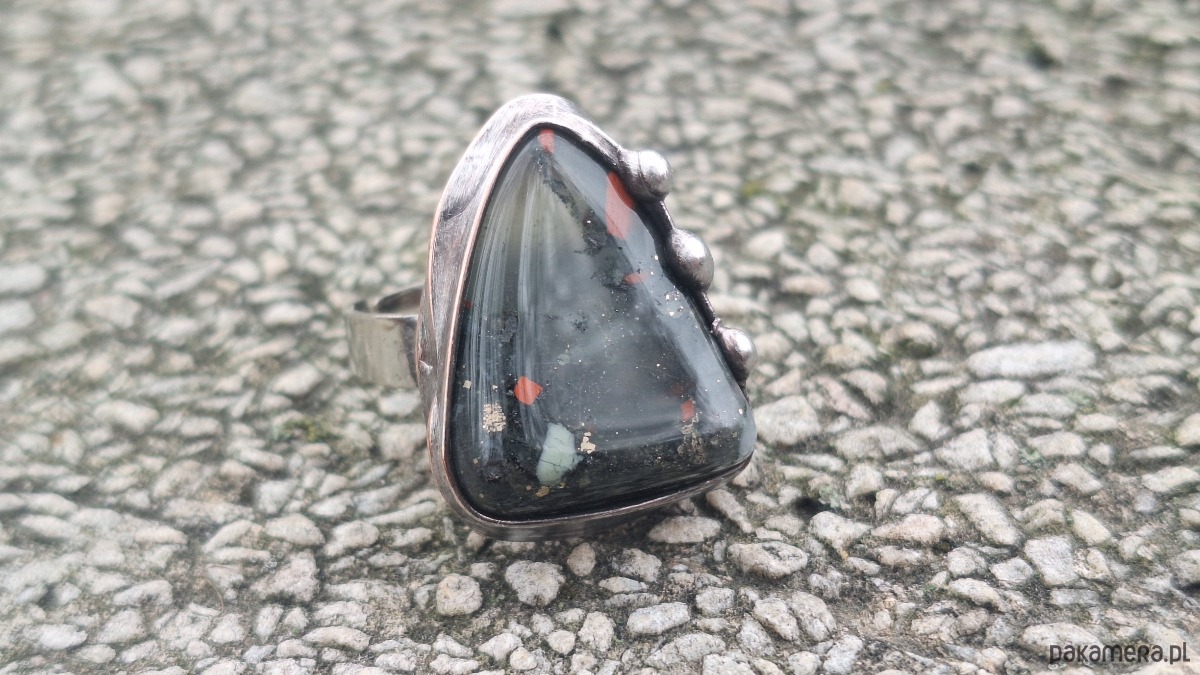 Pierścionek wykonany z miedzi, cyny i jaspisu. Wymiary ok. 2.5 na 1.8 cm. Regulowany. Nie jest ciężki.