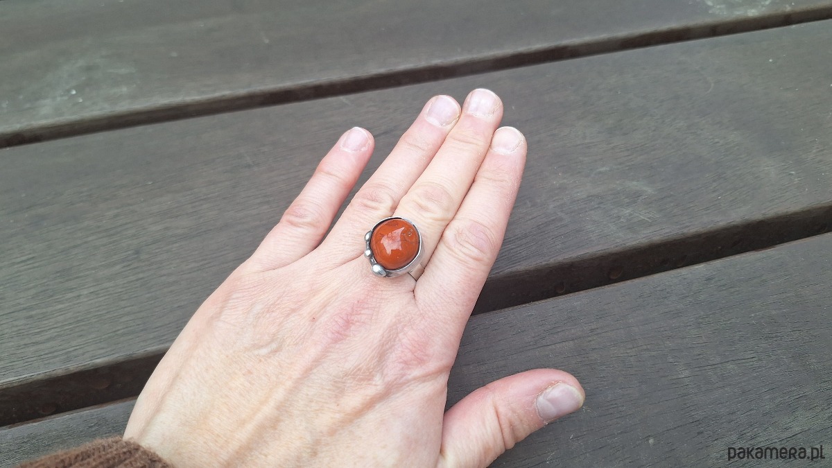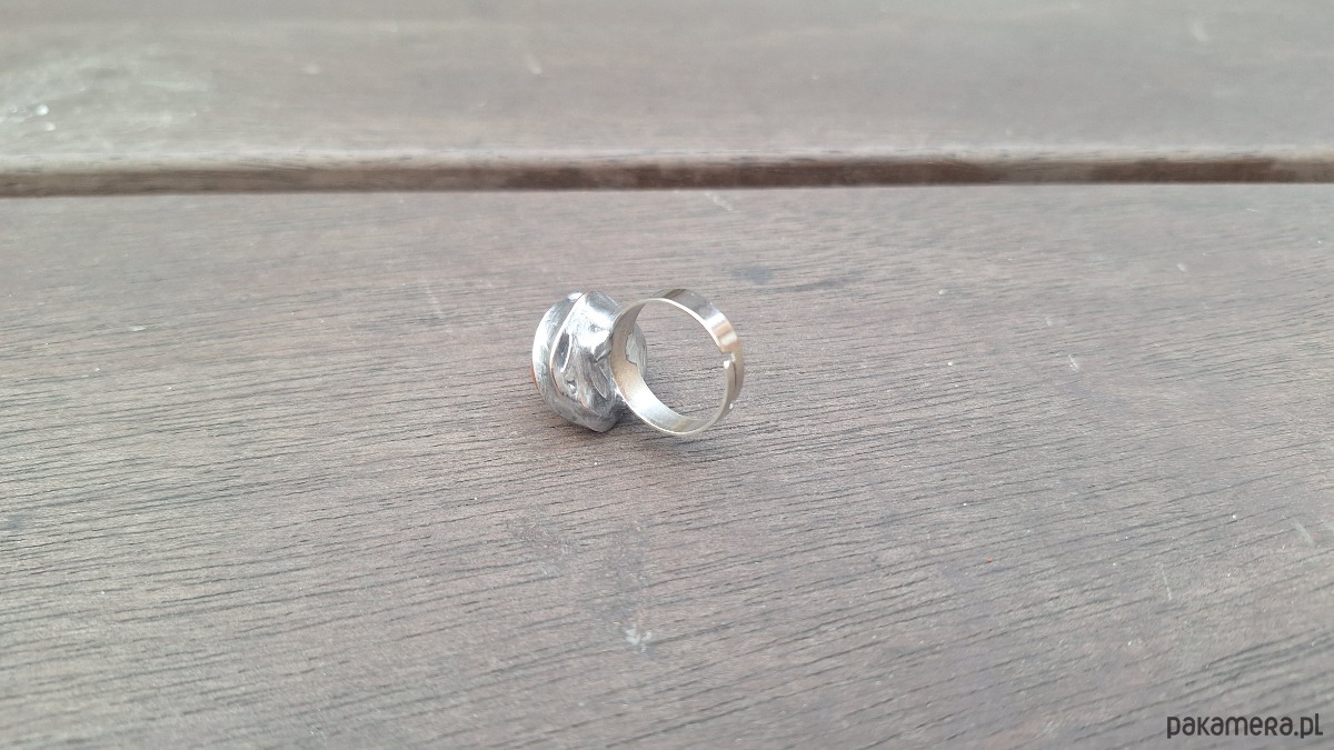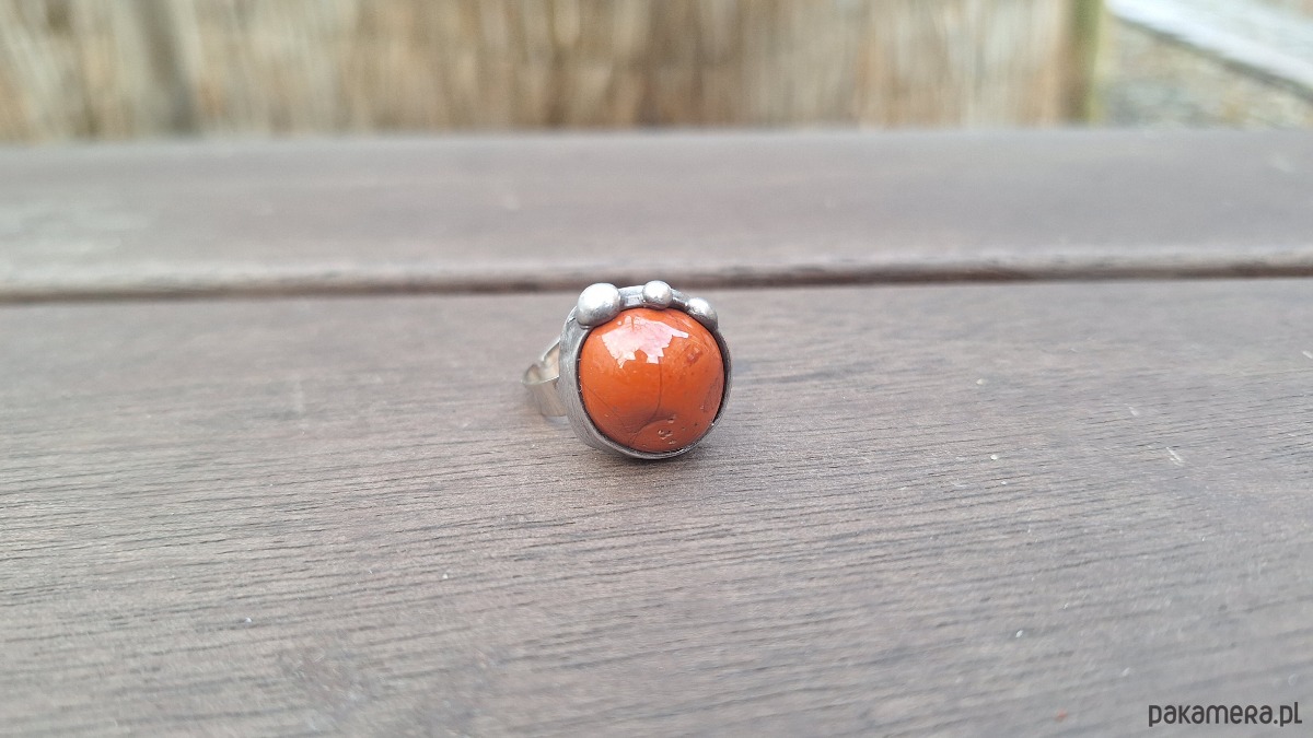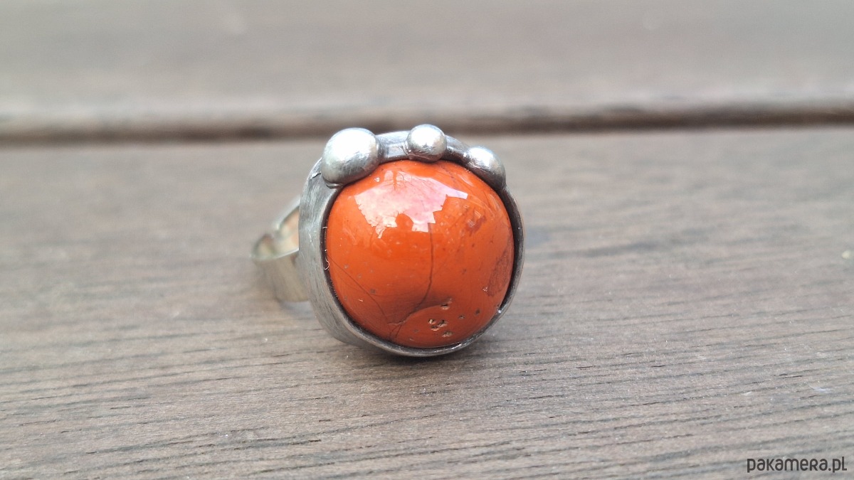 Pierścionek wykonany z miedzi, cyny i jaspisu. Wymiary ok. 1.8 na 1.8 cm. Regulowany. Nie jest ciężki.