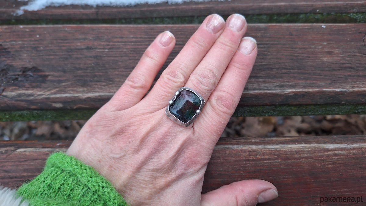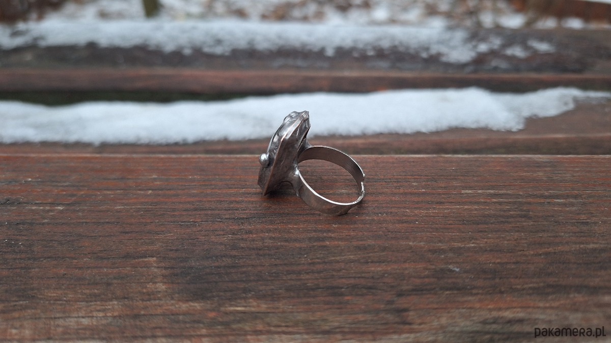 Pierścionek wykonany z miedzi, cyny i jaspisu. Wymiary ok. 2 na 1.6 cm. Regulowany. Nie jest ciężki.