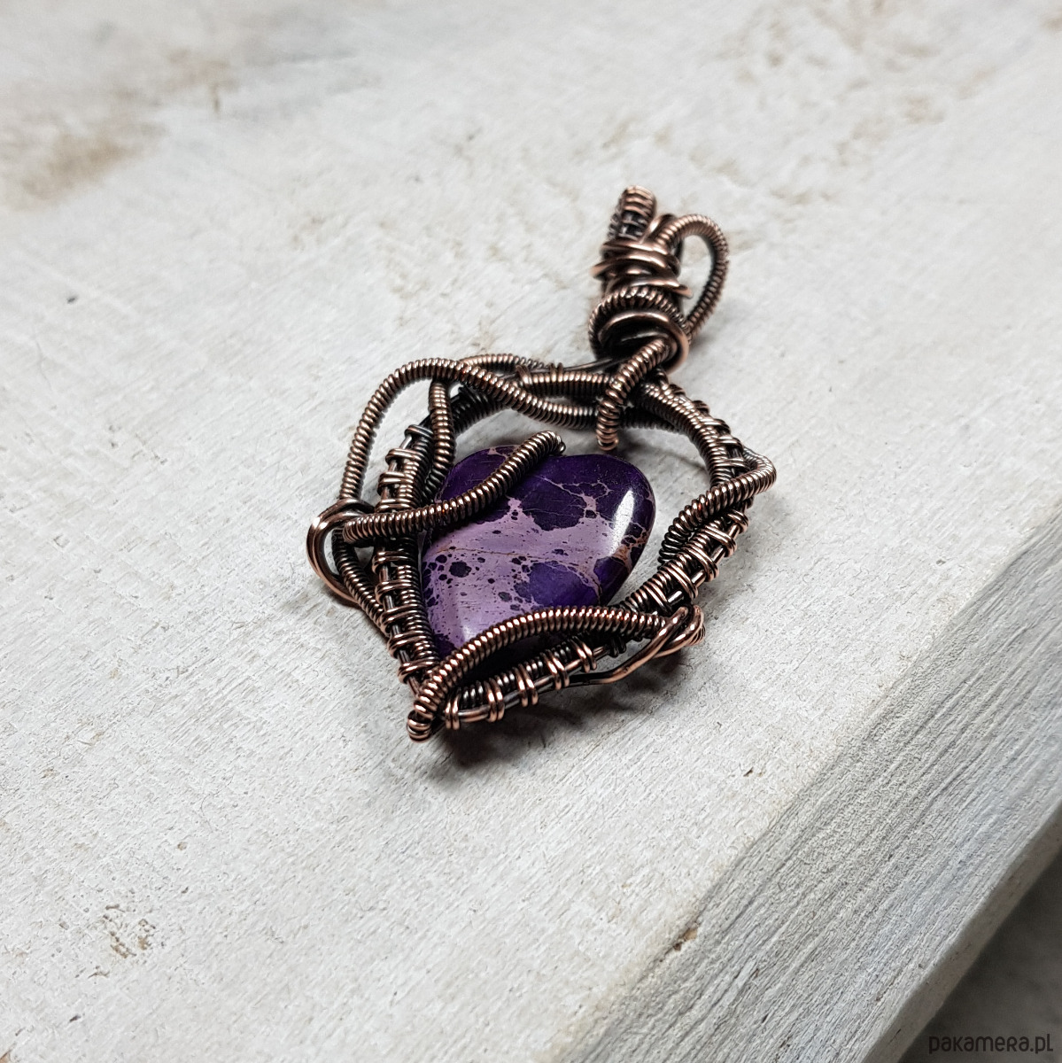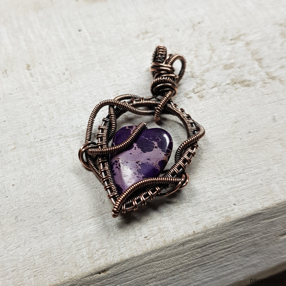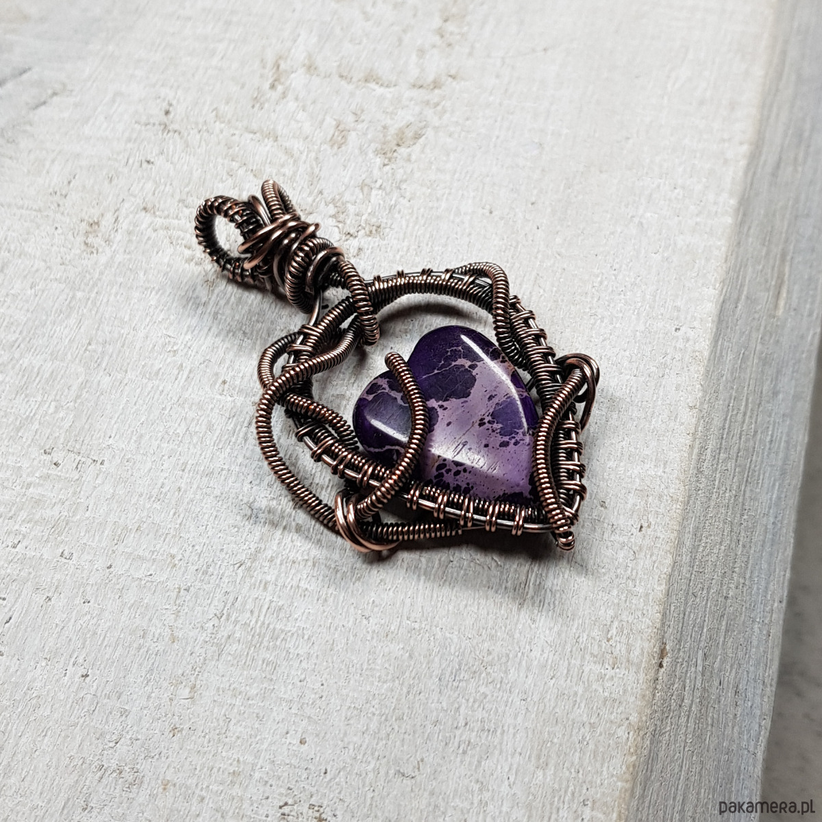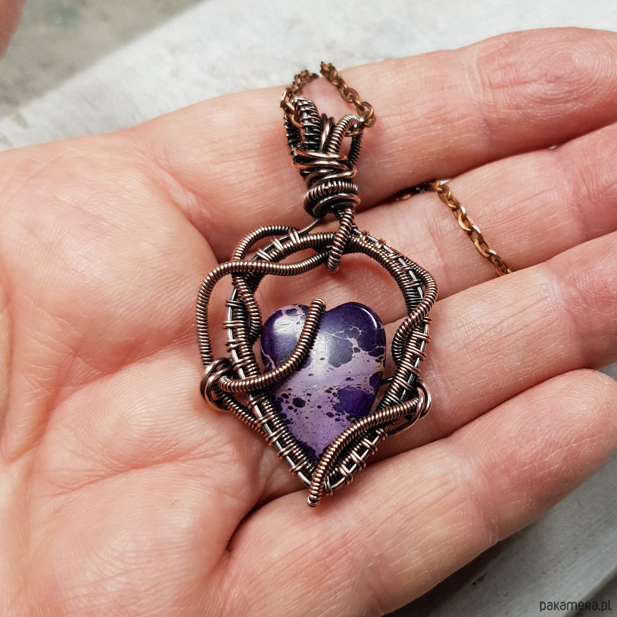 Zawieszka wykonana ręcznie metodą wire-wrappingu której głównym elementem jest naturalny jaspis w kształcie serduszka w kolorze fioletu. Do wykonania wisiorka użyłam drutu miedzianego, który następnie zaoksydowałam i wypolerowałam w celu uzyskania efektu szlachetnego postarzenia. Wymiary zawieszki 50x29mm z łańcuszkiem długości około 45-50 cm. Wisiorek ma bardzo ładne, wymyślne sploty, natomiast dzięki barwie i asymetrii jest nowoczesny.
