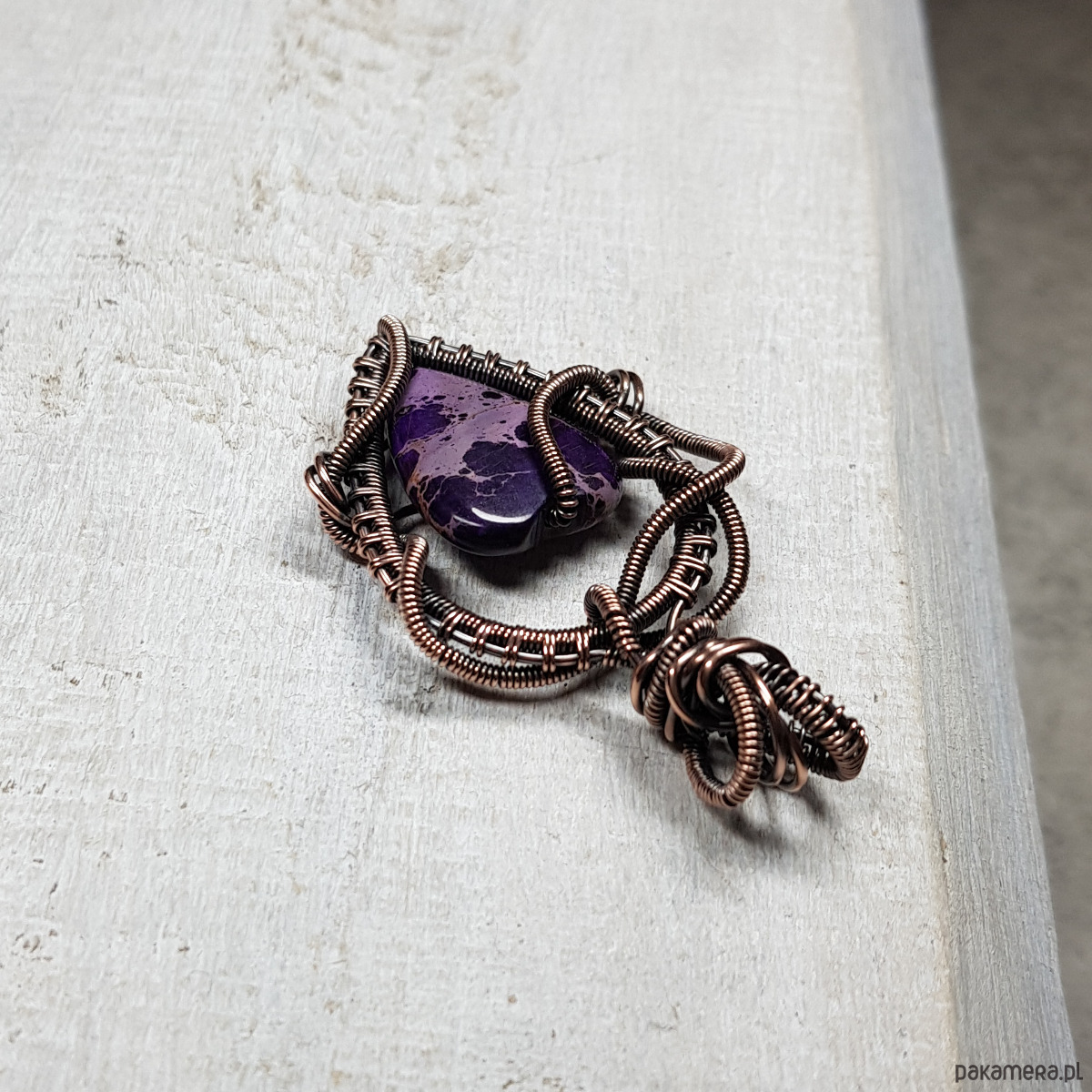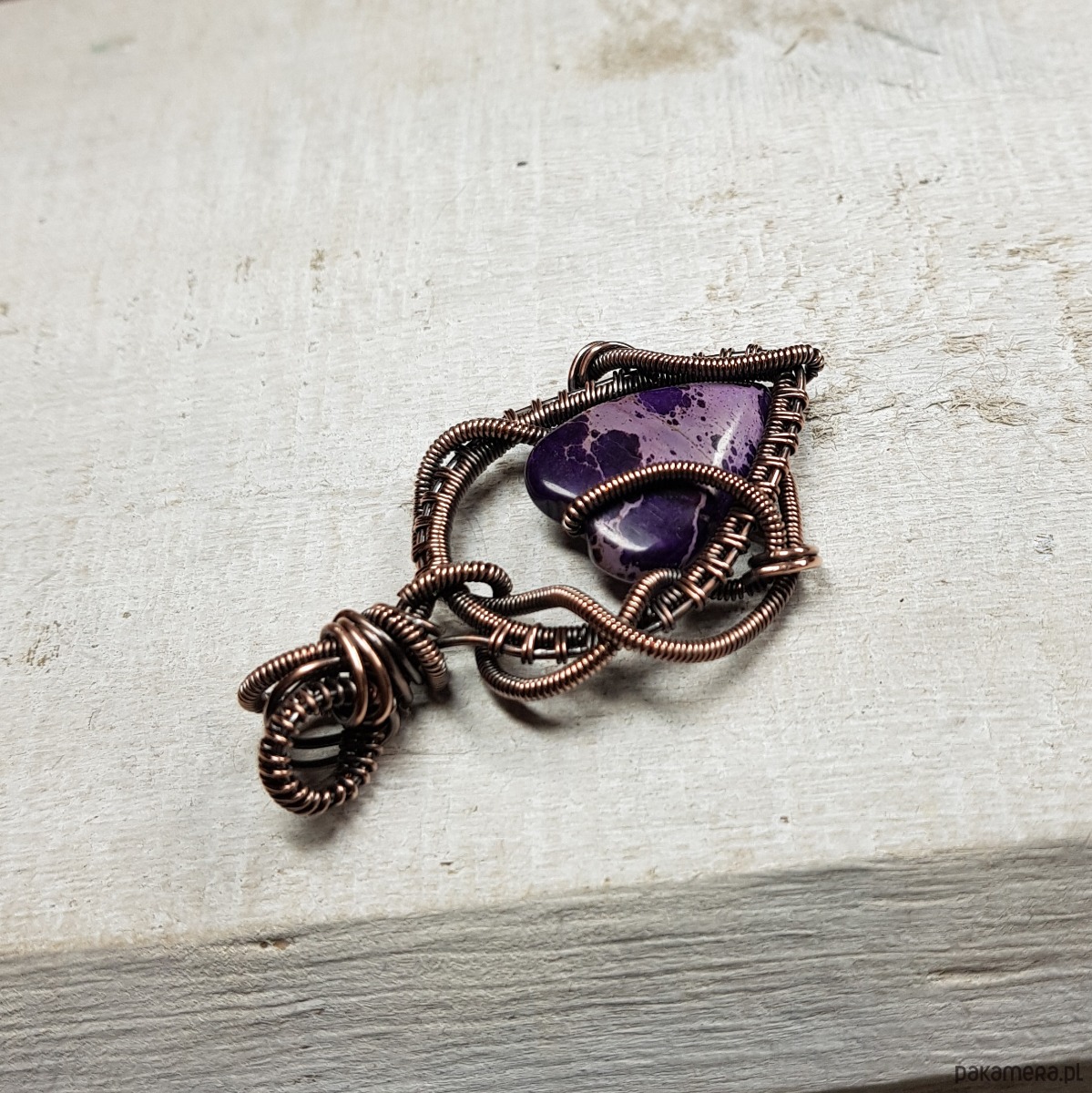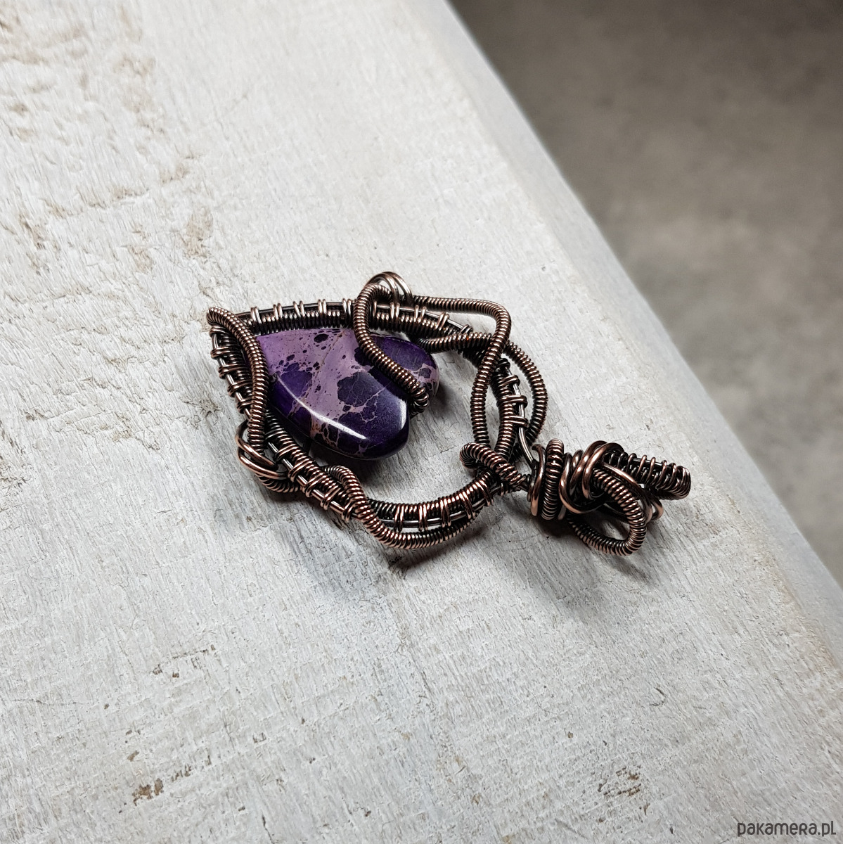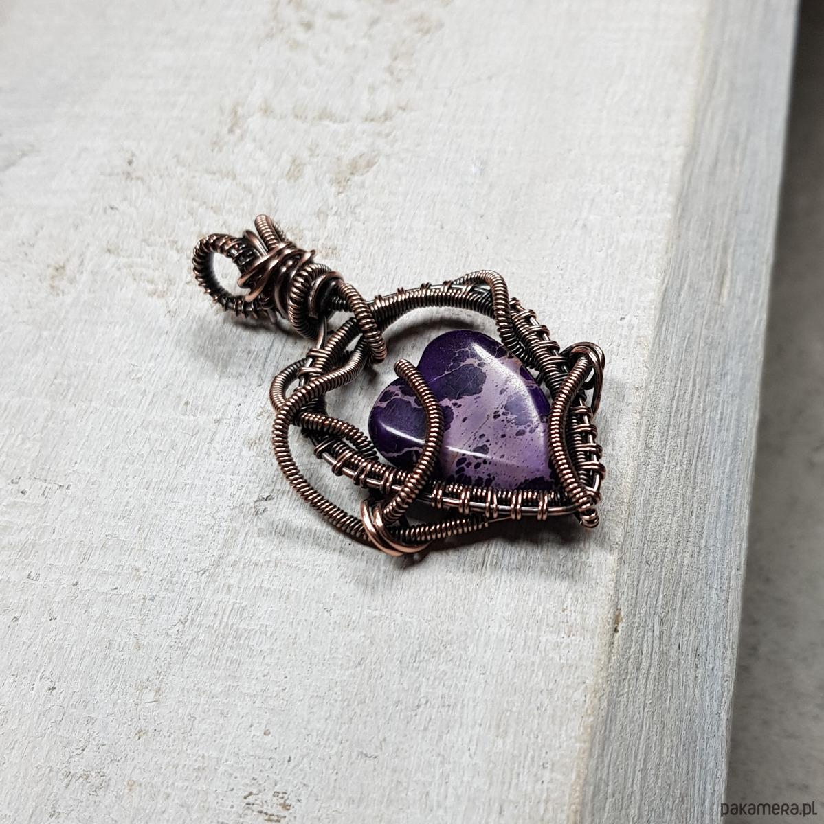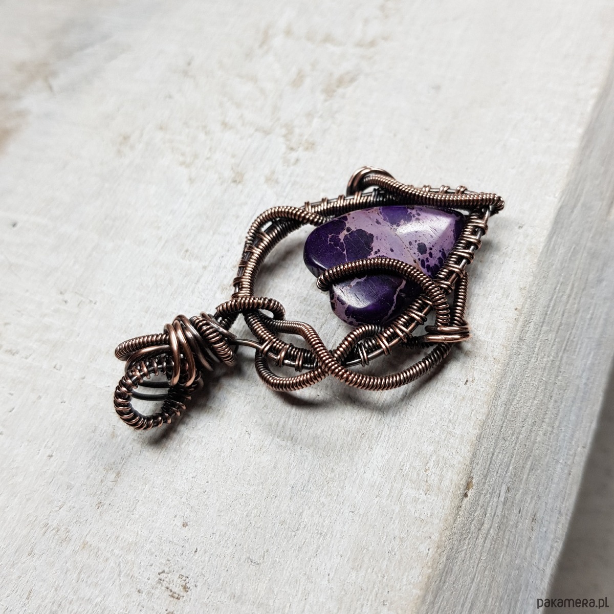Zawieszka wykonana ręcznie metodą wire-wrappingu której głównym elementem jest naturalny jaspis w kształcie serduszka w kolorze fioletu. Do wykonania wisiorka użyłam drutu miedzianego, który następnie zaoksydowałam i wypolerowałam w celu uzyskania efektu szlachetnego postarzenia. Wymiary zawieszki 50x29mm z łańcuszkiem długości około 45-50 cm. Wisiorek ma bardzo ładne, wymyślne sploty, natomiast dzięki barwie i asymetrii jest nowoczesny.