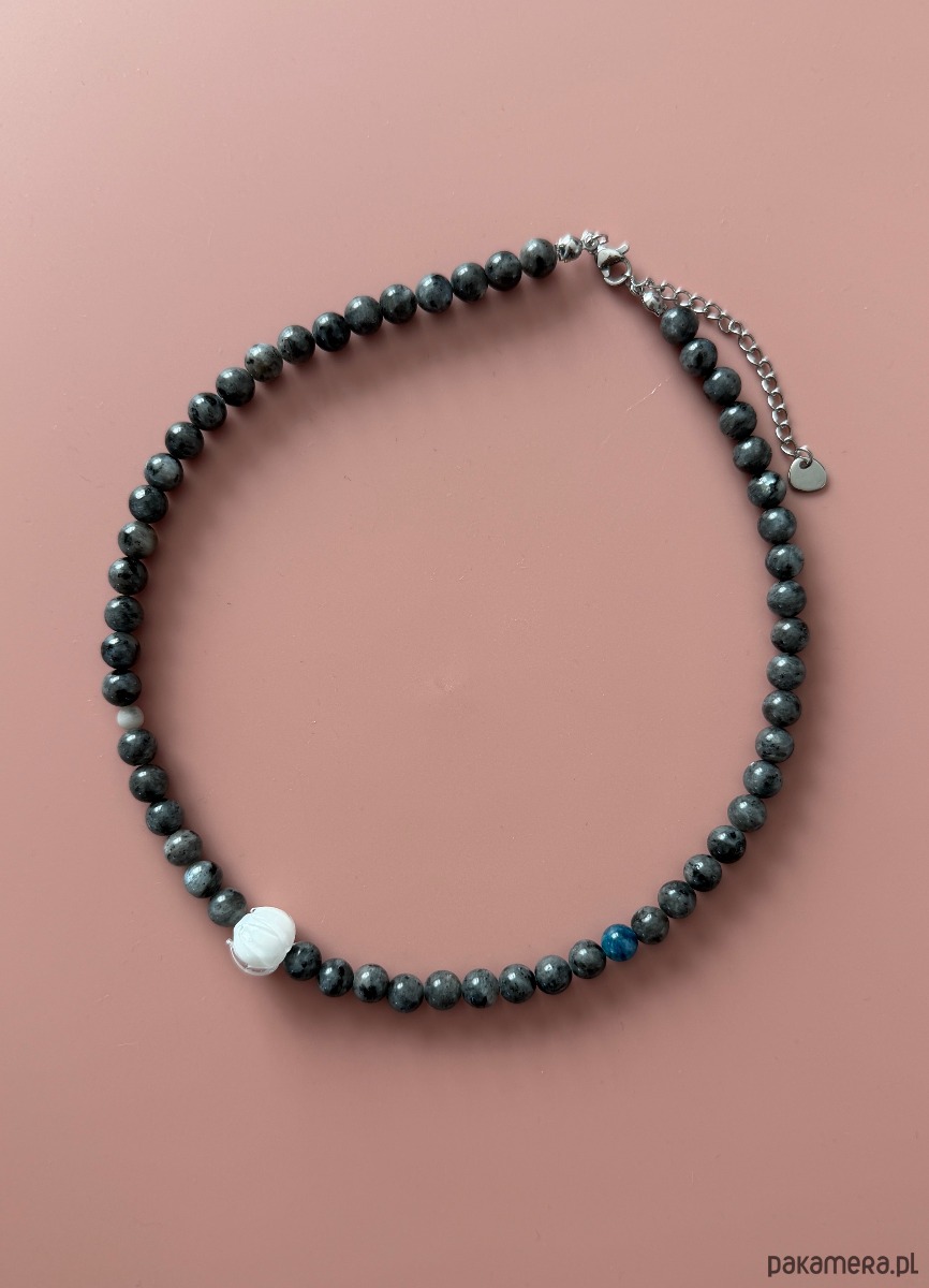 Naszyjnik z szarego jaspisu ze szklanym kwiatkiem. Wielkość kamieni 6mm