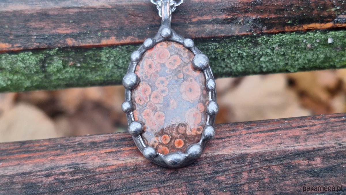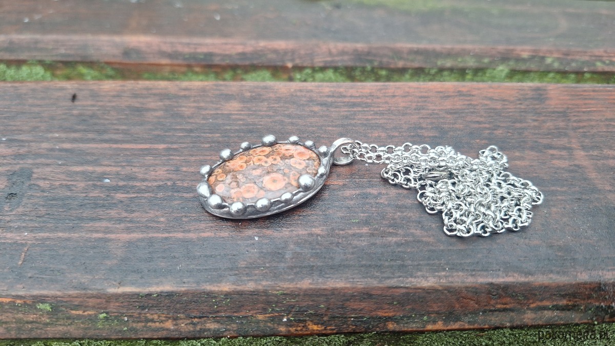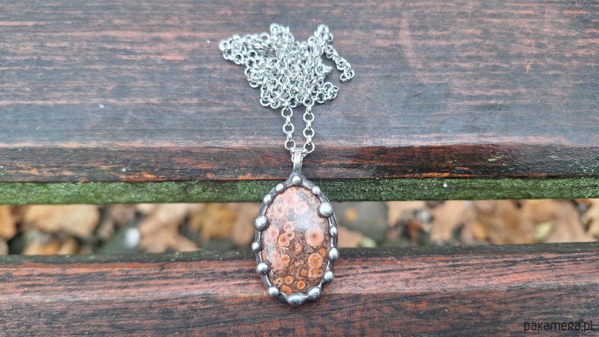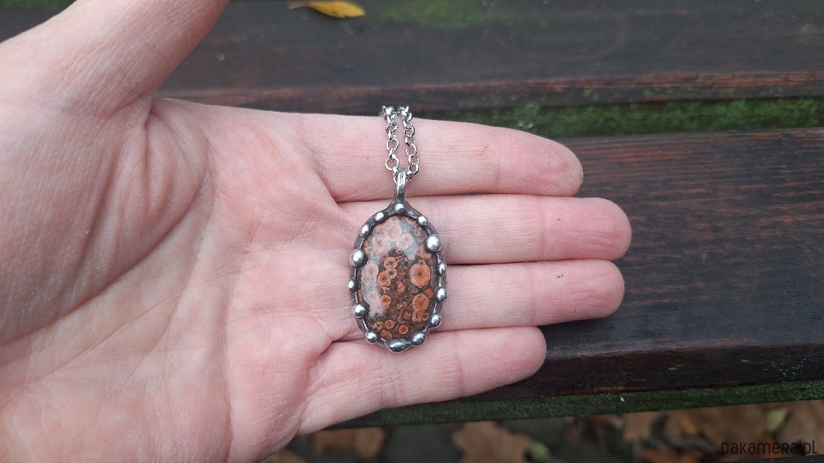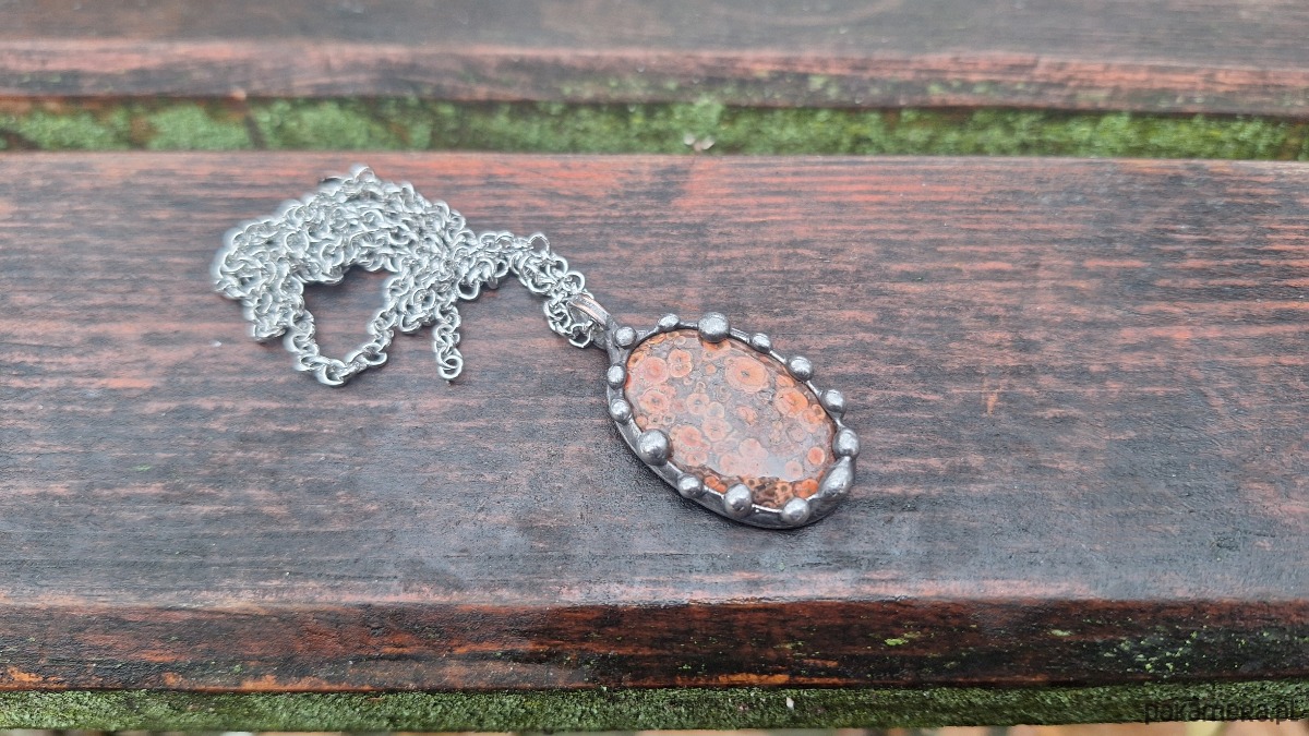 Wisiorek wykonany z miedzi, cyny i jaspisu. Wymiary ok. 3.5 na 2 cm. Zawieszony na łańcuszku o długości ok. 50 cm.