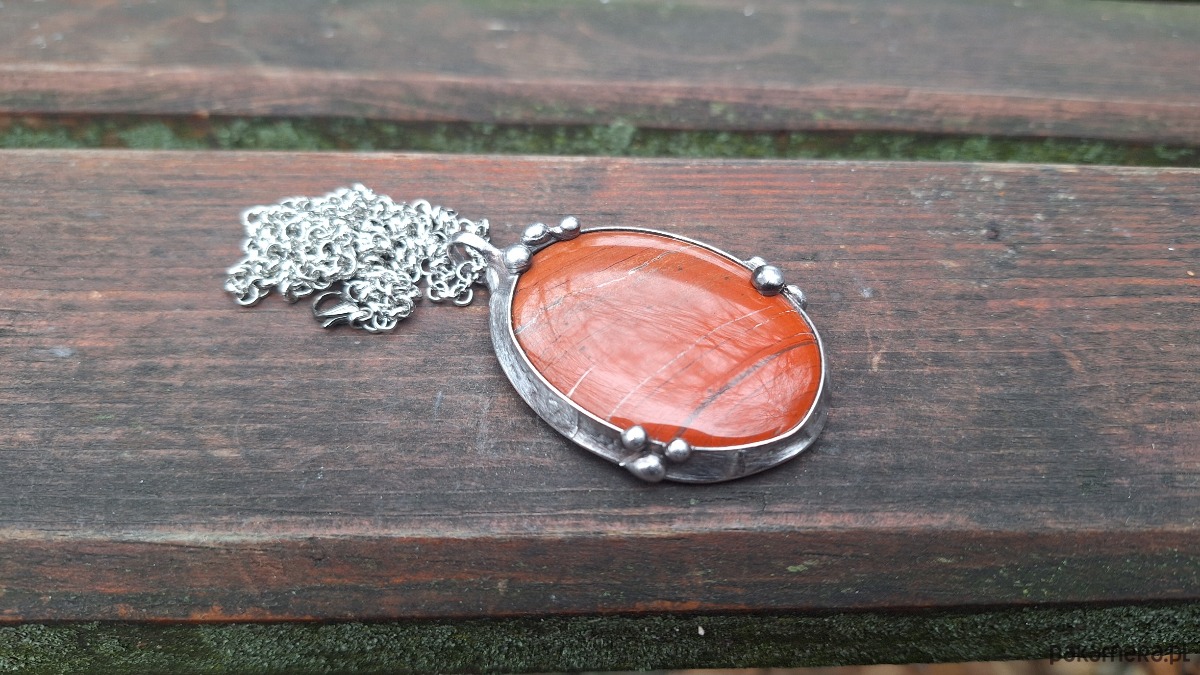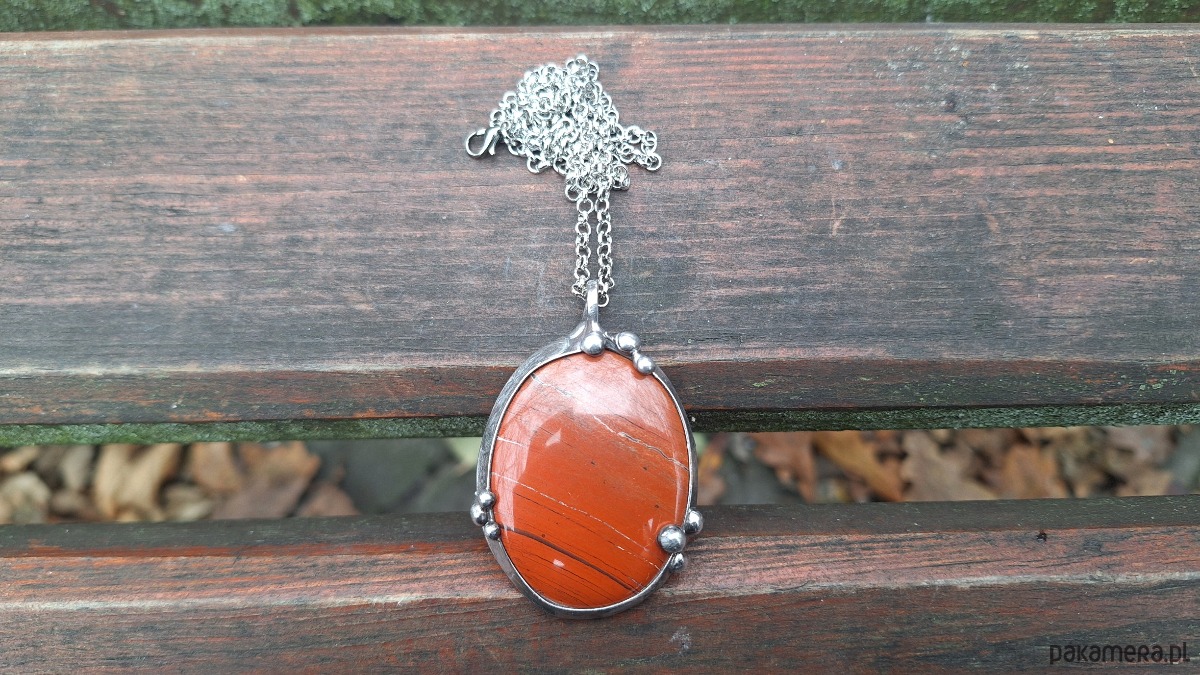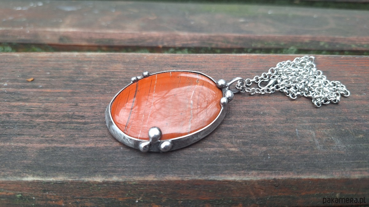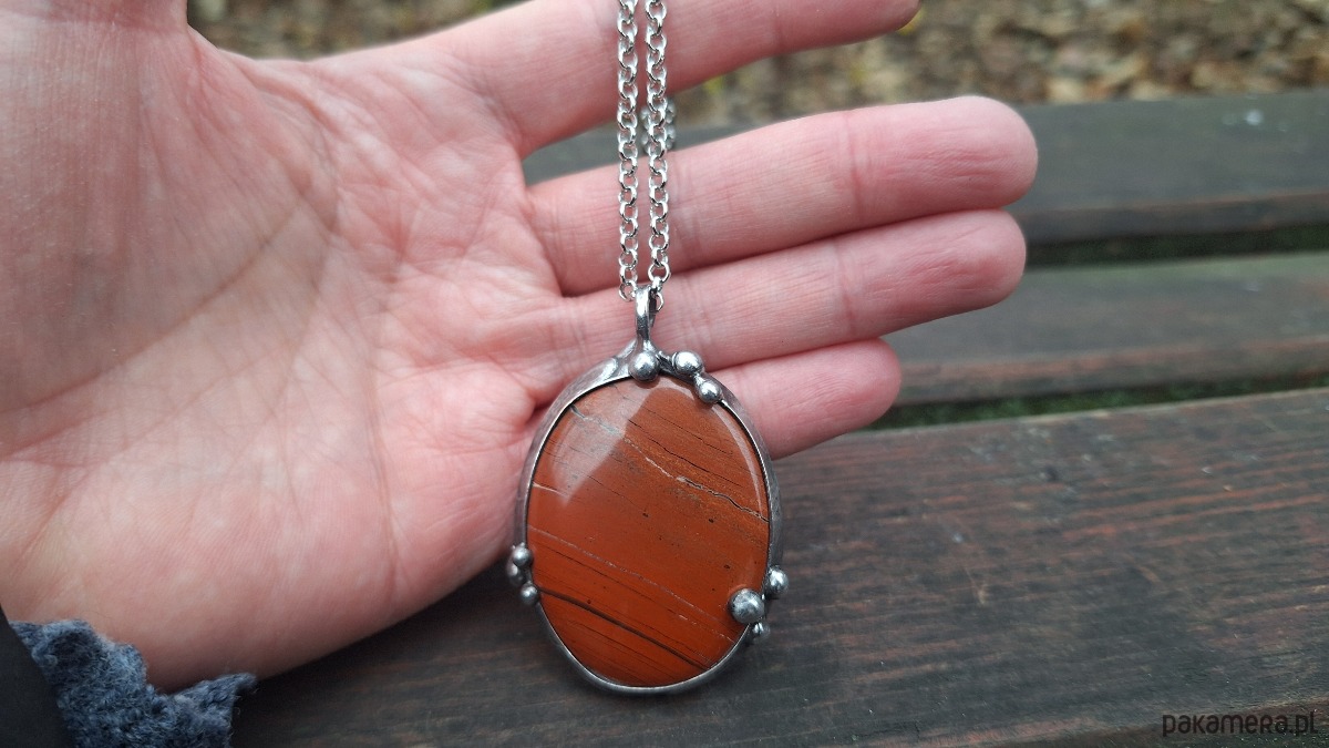 Wisiorek wykonany z miedzi, cyny i jaspisu. Wymiary ok. 5 na 3.5 cm. Zawieszony na łańcuszku o długości ok. 50 cm.