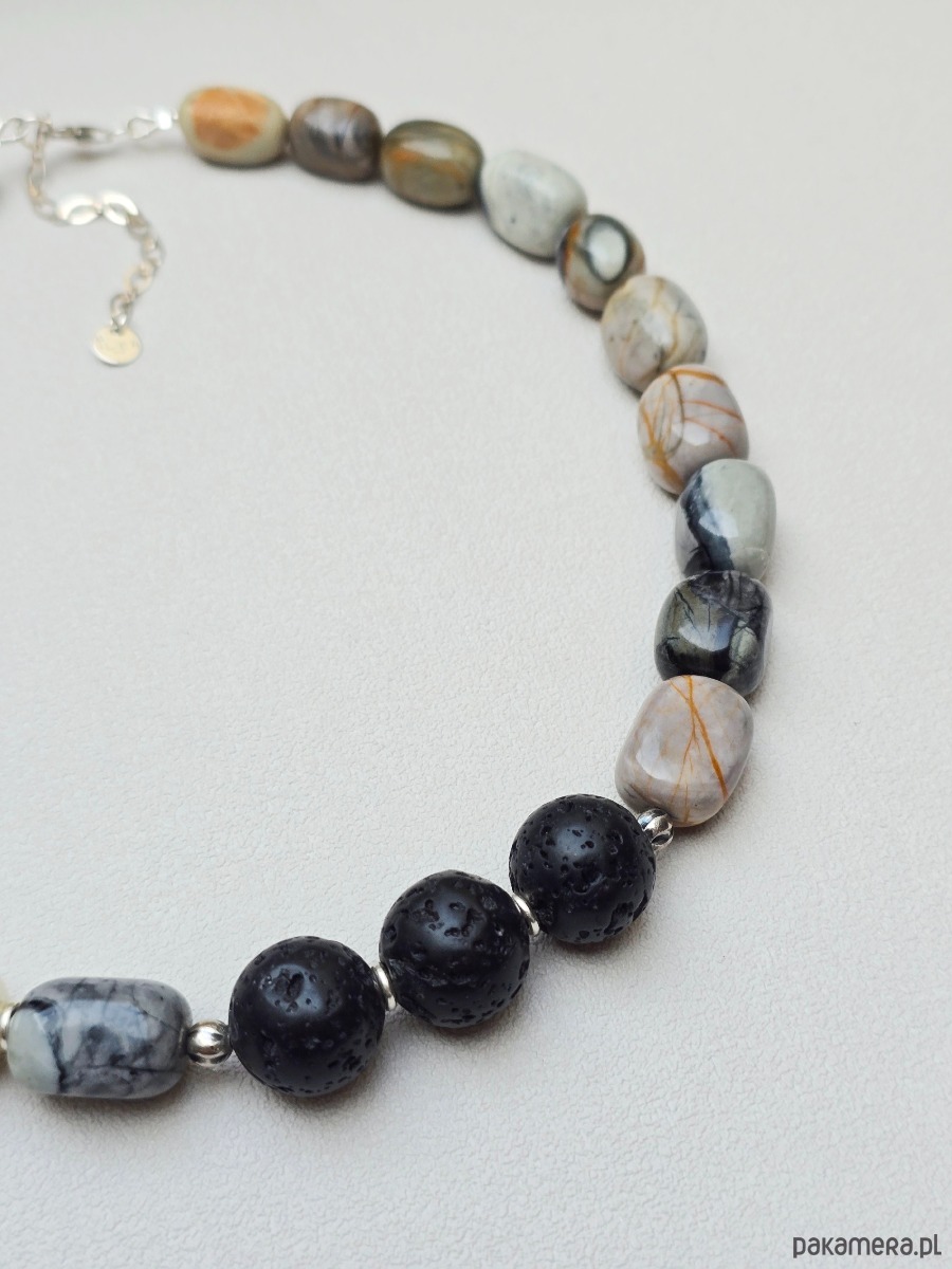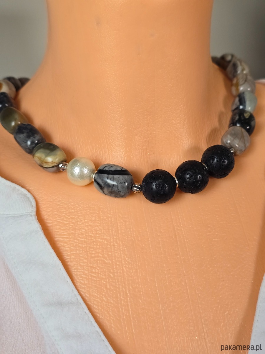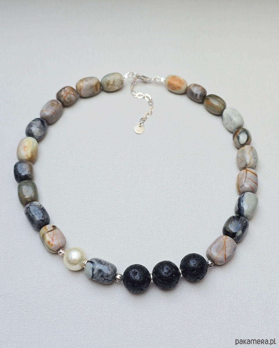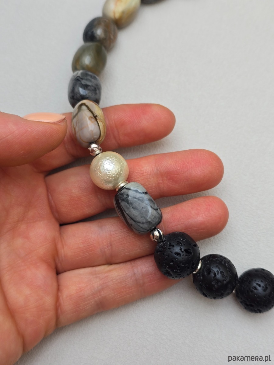 Unikatowe, duże korale z baryłek jaspisu Picasso i lawy wulkanicznej z dużą 14 mm perłą majorca.