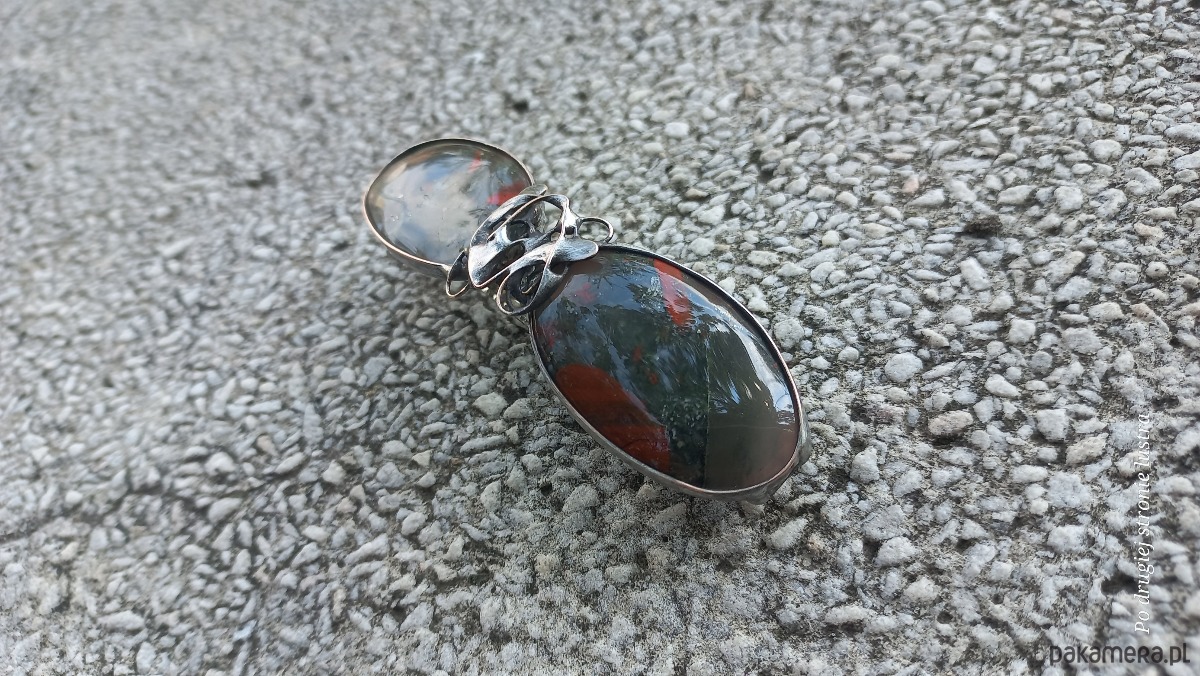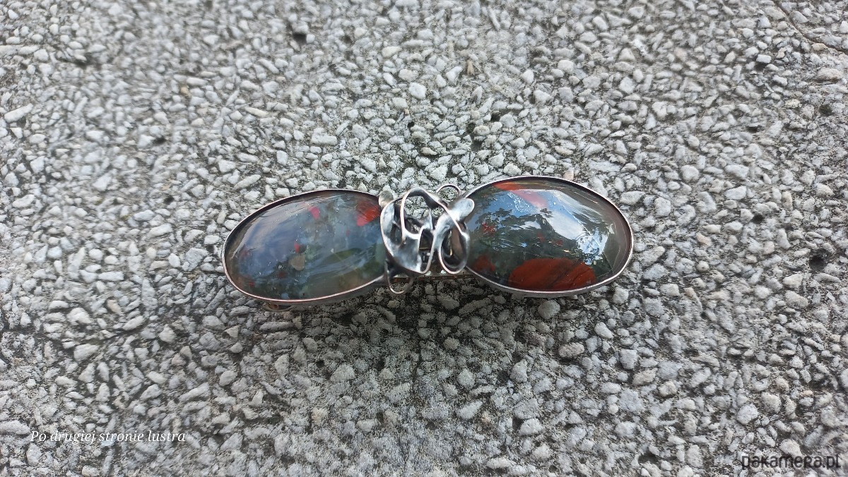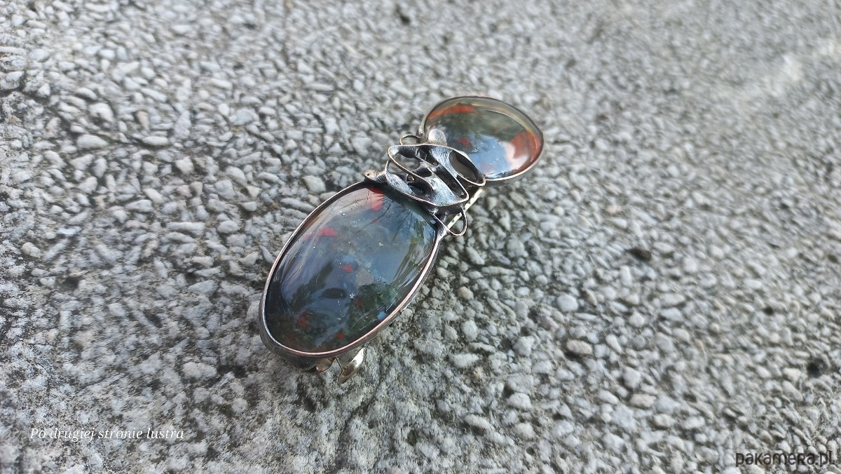 Klamra do włosów, wykonana z miedzi, cyny i jaspisów. Metalowe, automatyczne zapięcie. Wymiary ok. 8 na 2.3 cm. Element zapinający ma 6 cm.