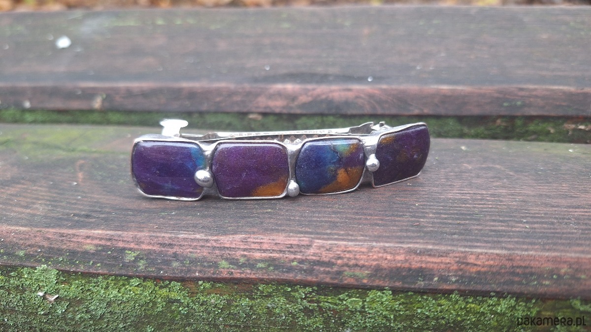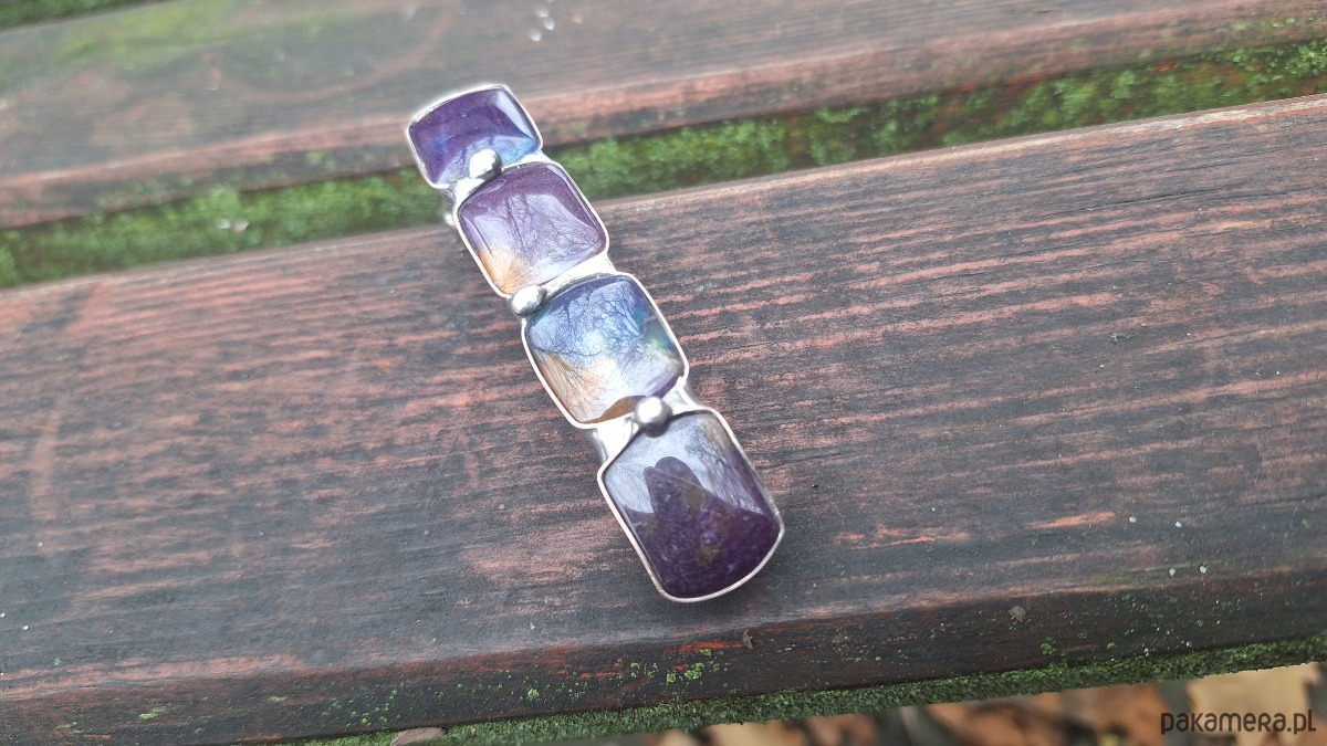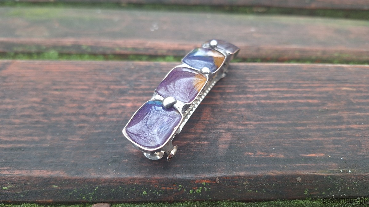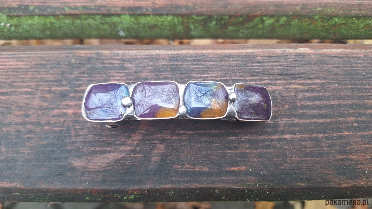 Klamra do włosów, wykonana z miedzi, cyny i jaspisów. Wymiary ok. 8 na 1.5 cm. Zapięcie 6 cm, metalowe.