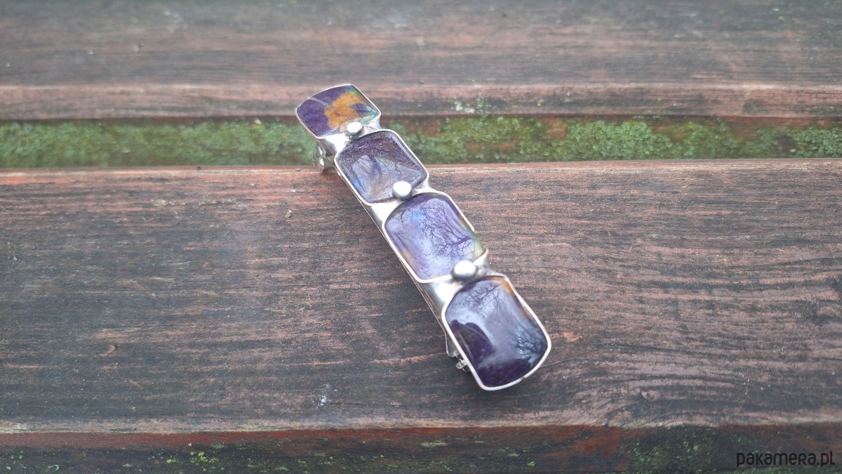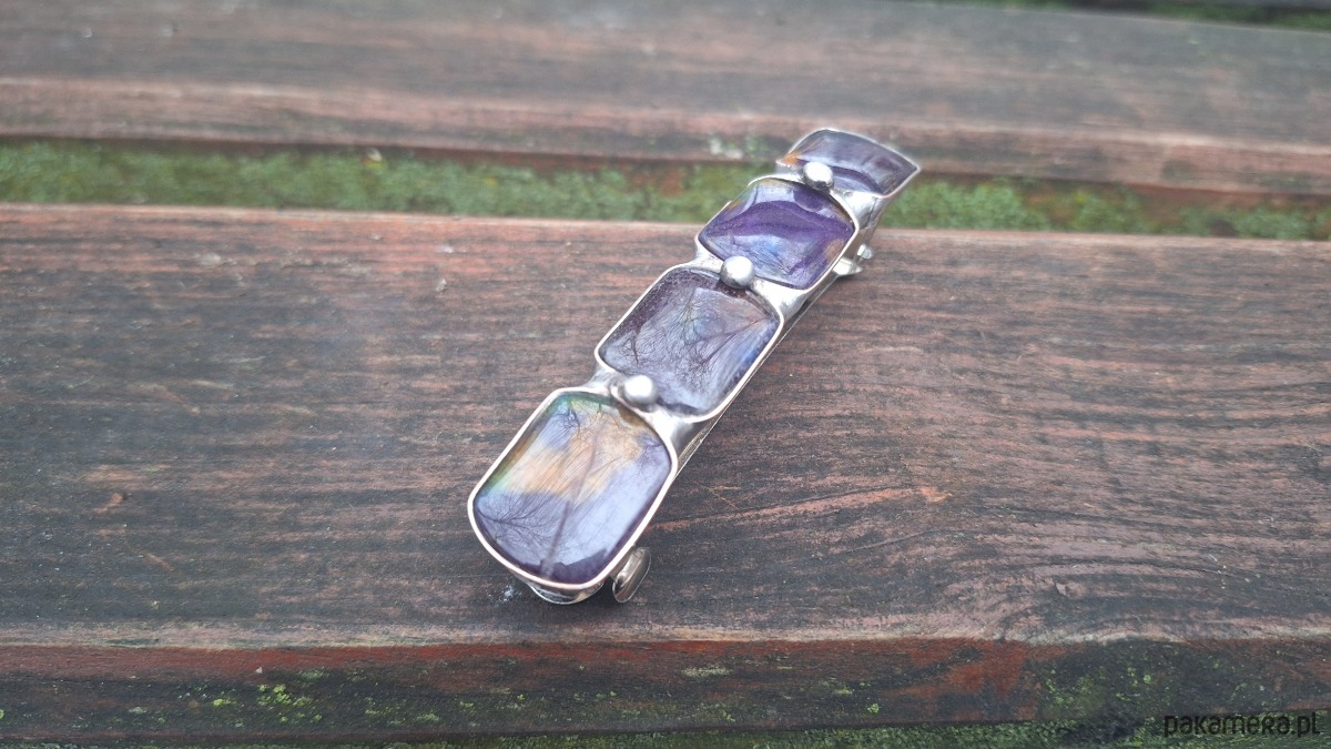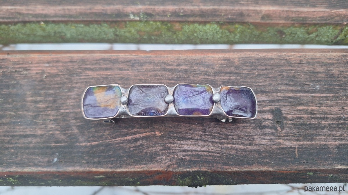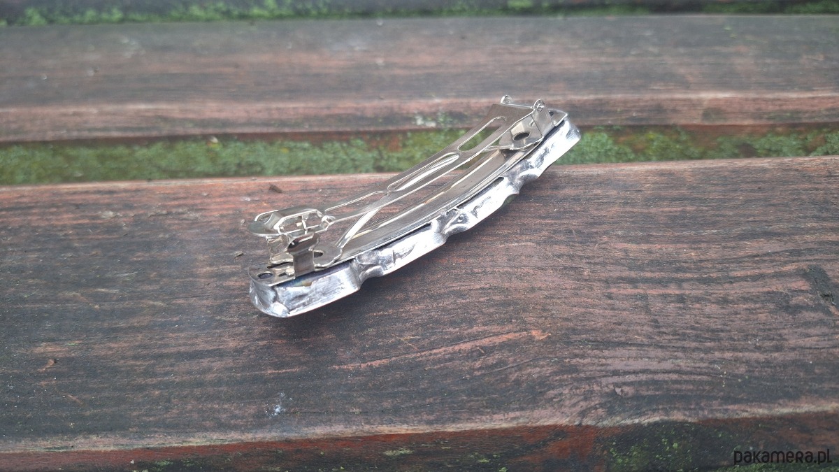 Klamra do włosów, wykonana z miedzi, cyny i jaspisów. Wymiary ok. 8 na 1.5 cm. Zapięcie 6 cm, metalowe.
