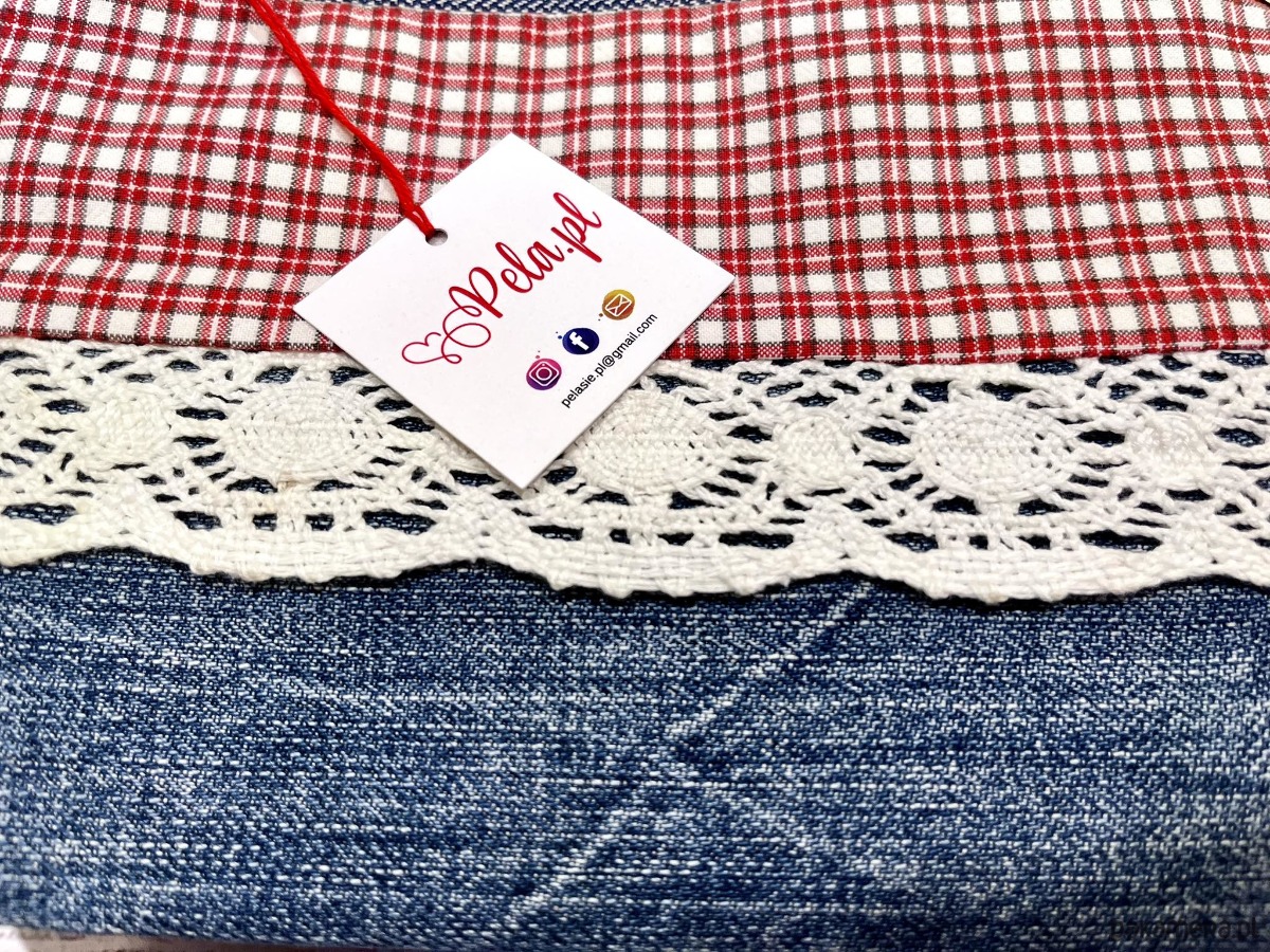 Miss o wymiarach 13 cm ( wysokość) x 28 cm ( długość) posiada zapięcie na zamek błyskawiczny, podszewkę w czerwono-białą krateczkę oraz czerwony rzemyczek na szczęście.
