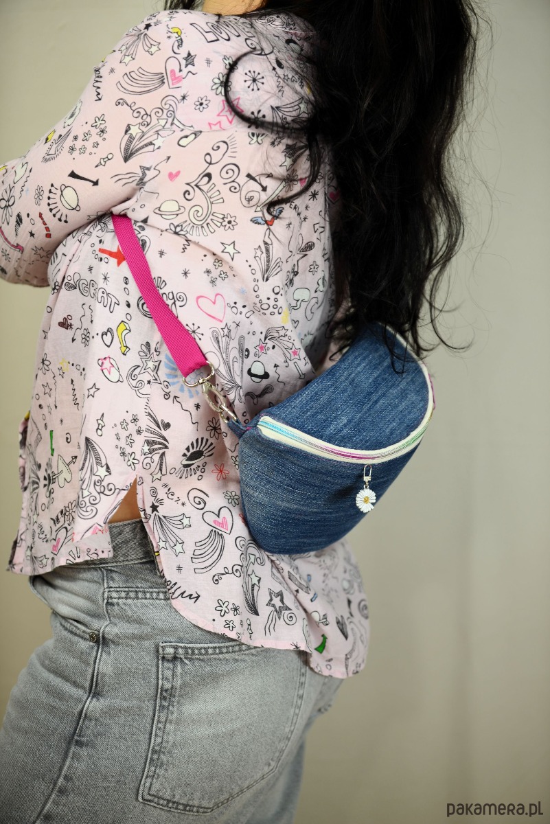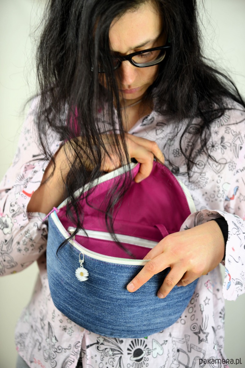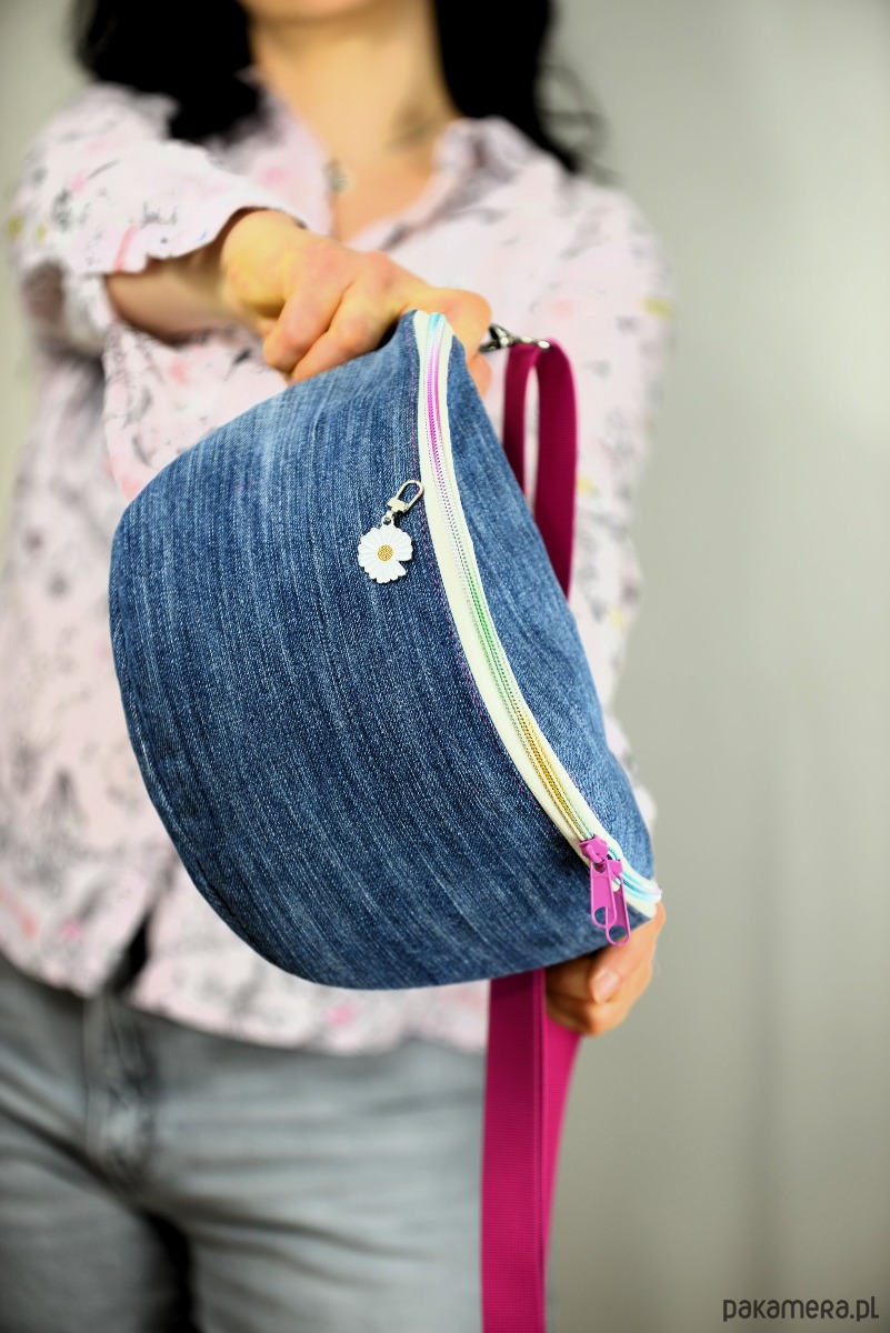 🔸Energetyczne detale: Klasyczny niebieski jeans przełamałam odważnymi akcentami. Amarantowe suwaki, taśma oraz urocza zawieszka w kształcie stokrotki nadają jej radosnego, miejskiego charakteru.