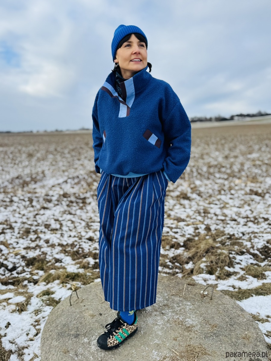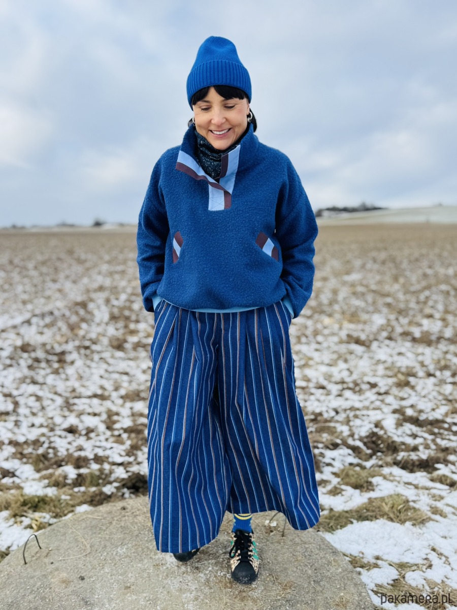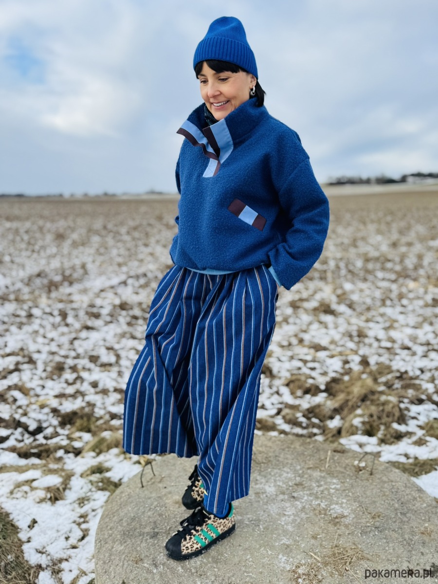 Luźne, szerokie spodnie o kroju kulotów z grubego denimu w kolorze ciemnego granatu, ozdobione paskami. Dzięki trzem zakładkom spodnie zyskują objętość i pięknie układają się w ruchu, a wszyta w pasie gumka zapewnia wygodę i dopasowanie. To model, który łączy miejską energię z komfortem.