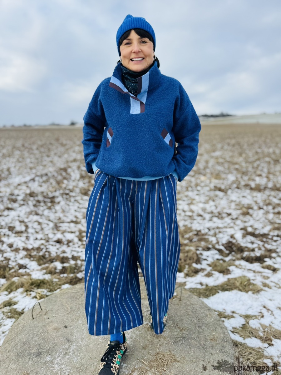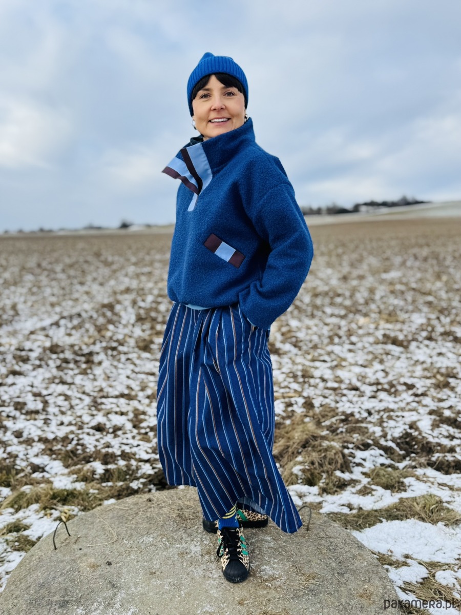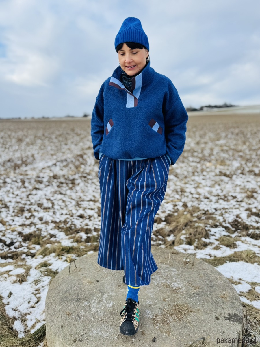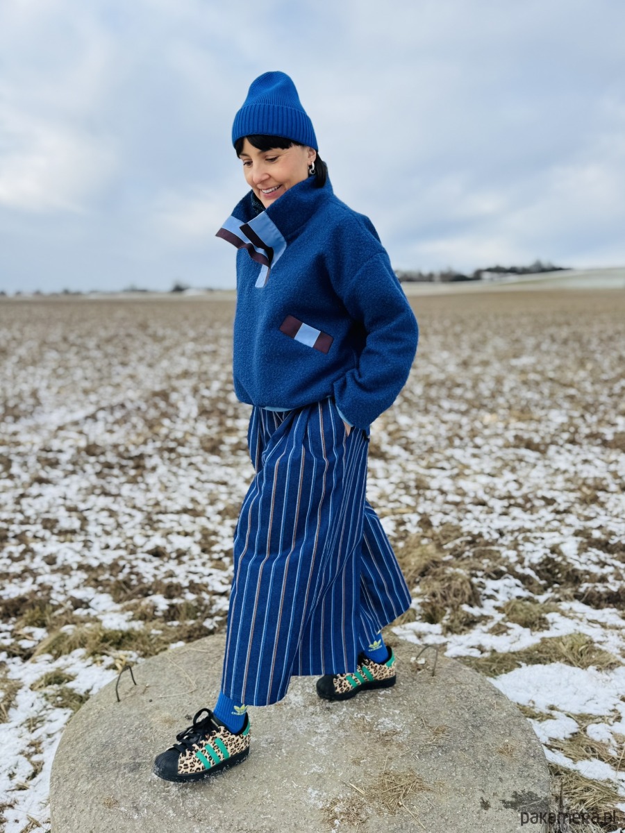 Luźne, szerokie spodnie o kroju kulotów z grubego denimu w kolorze ciemnego granatu, ozdobione paskami. Dzięki trzem zakładkom spodnie zyskują objętość i pięknie układają się w ruchu, a wszyta w pasie gumka zapewnia wygodę i dopasowanie. To model, który łączy miejską energię z komfortem.
