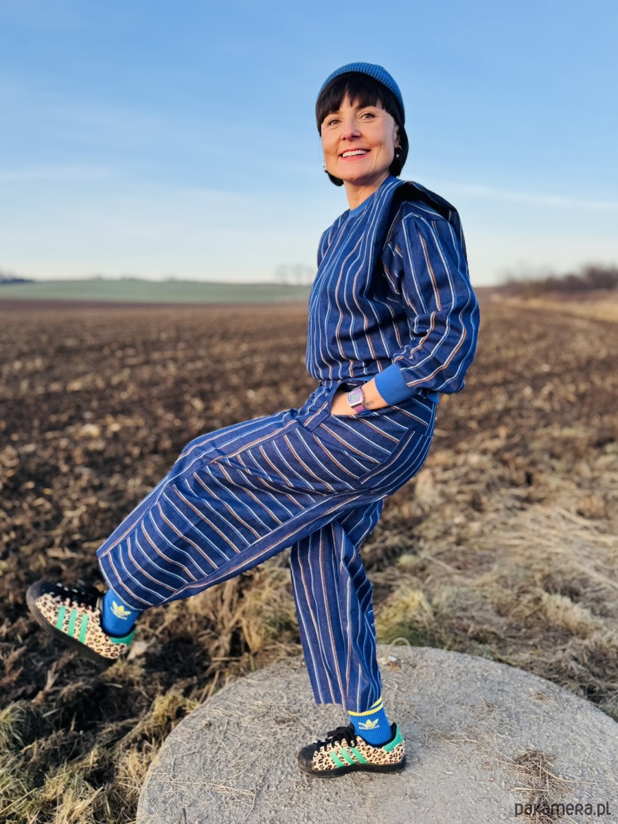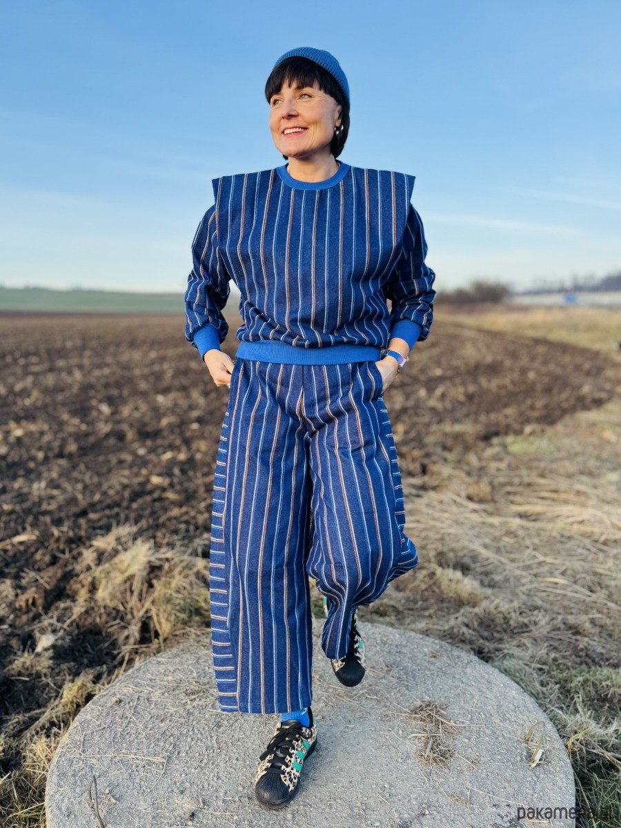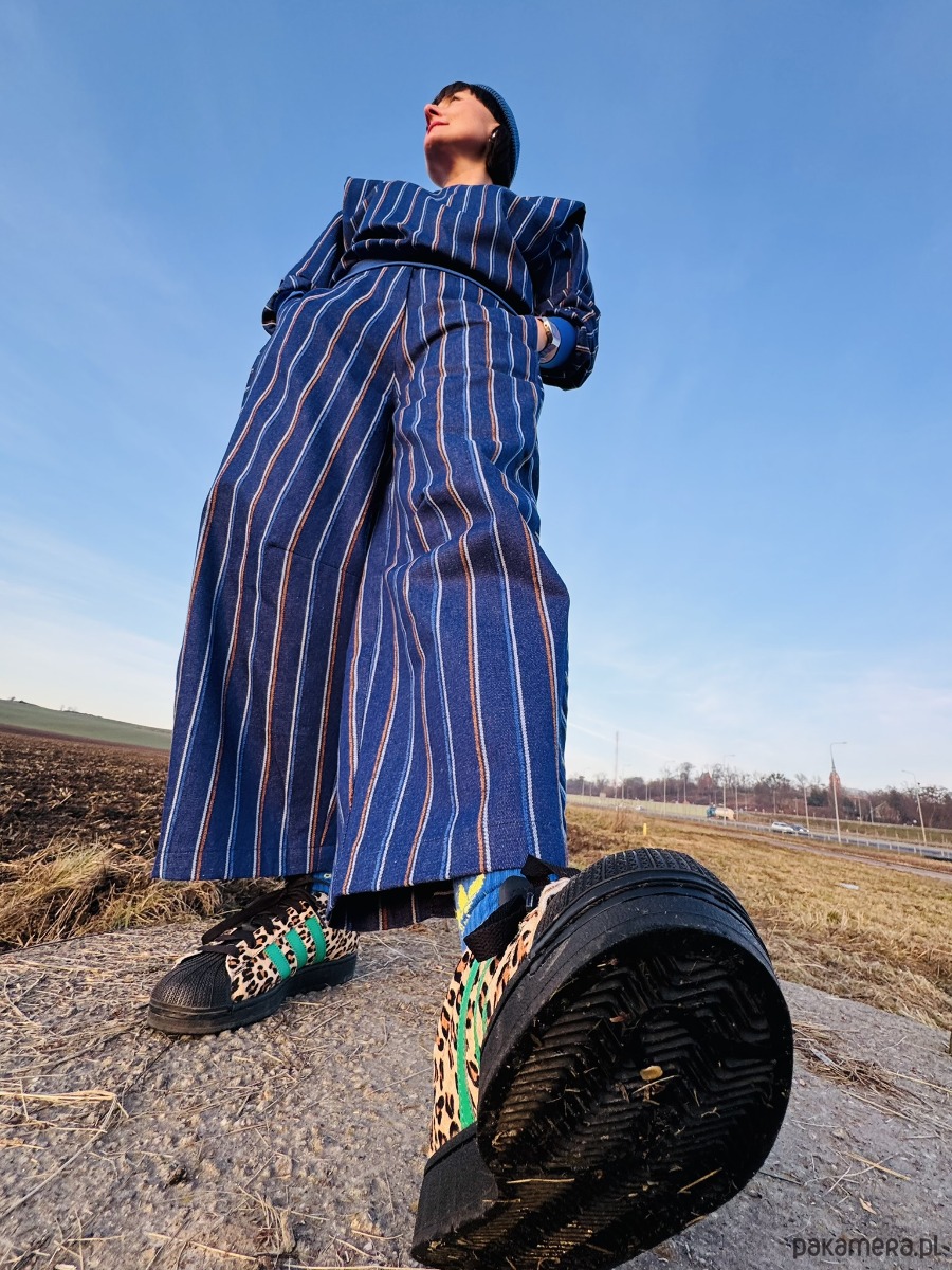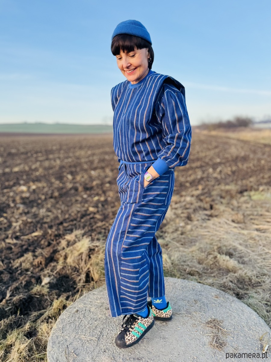 Luźny, beczkowy krój (barrel leg) tworzy nietuzinkową linię nogawek, która łączy swobodę ruchu z wyrazistym fasonem. Nogawka została zaprojektowana z trzech części, dzięki czemu zewnętrzna jej część jest skrojona tak, aby paski układały się poziomo, co dodatkowo podkreśla formę i nadaje spodniom oryginalnego charakteru.