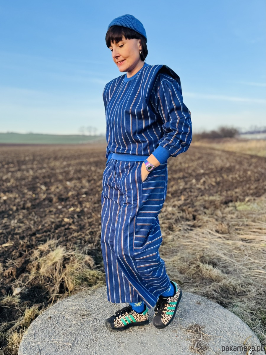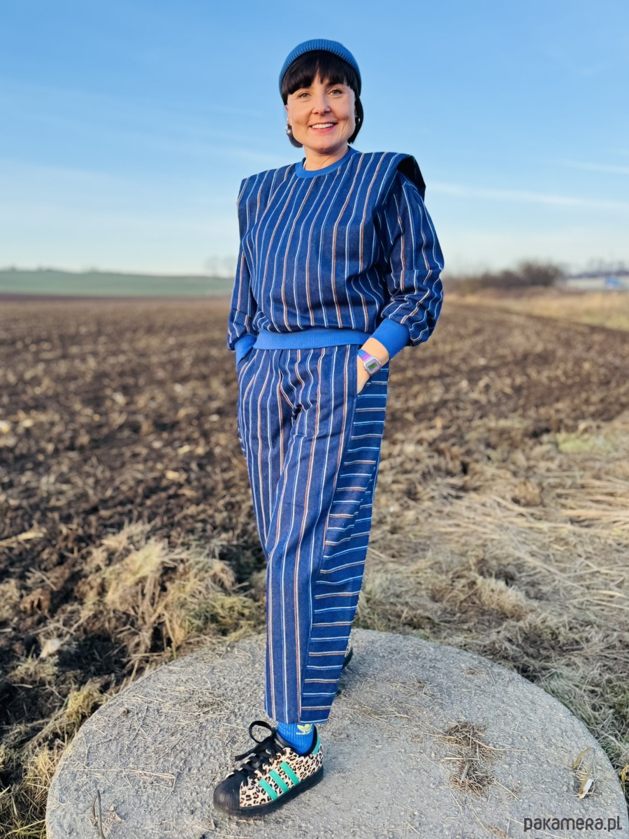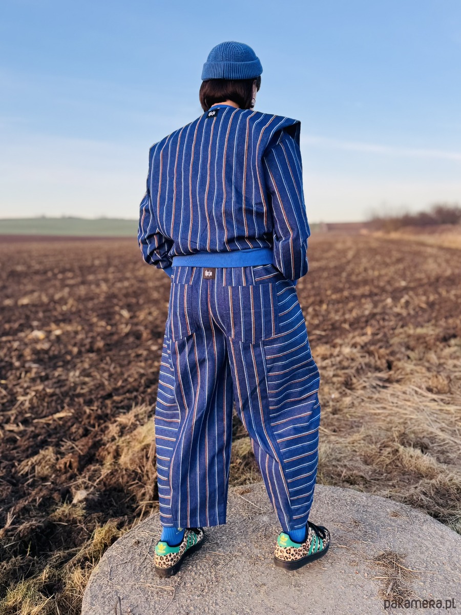 Luźny, beczkowy krój (barrel leg) tworzy nietuzinkową linię nogawek, która łączy swobodę ruchu z wyrazistym fasonem. Nogawka została zaprojektowana z trzech części, dzięki czemu zewnętrzna jej część jest skrojona tak, aby paski układały się poziomo, co dodatkowo podkreśla formę i nadaje spodniom oryginalnego charakteru.