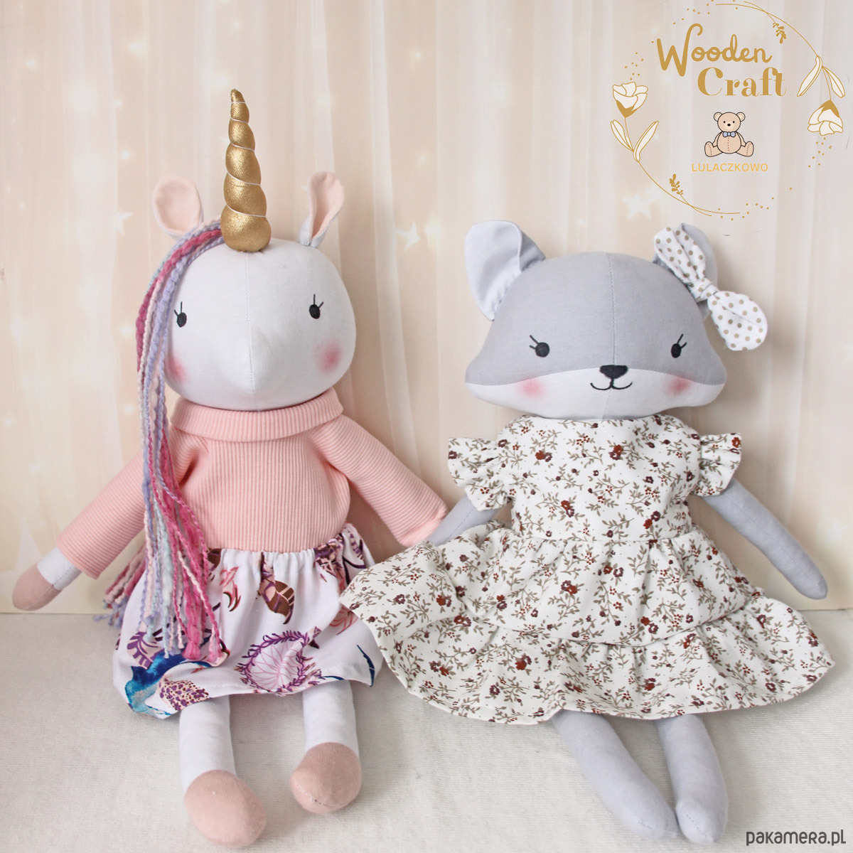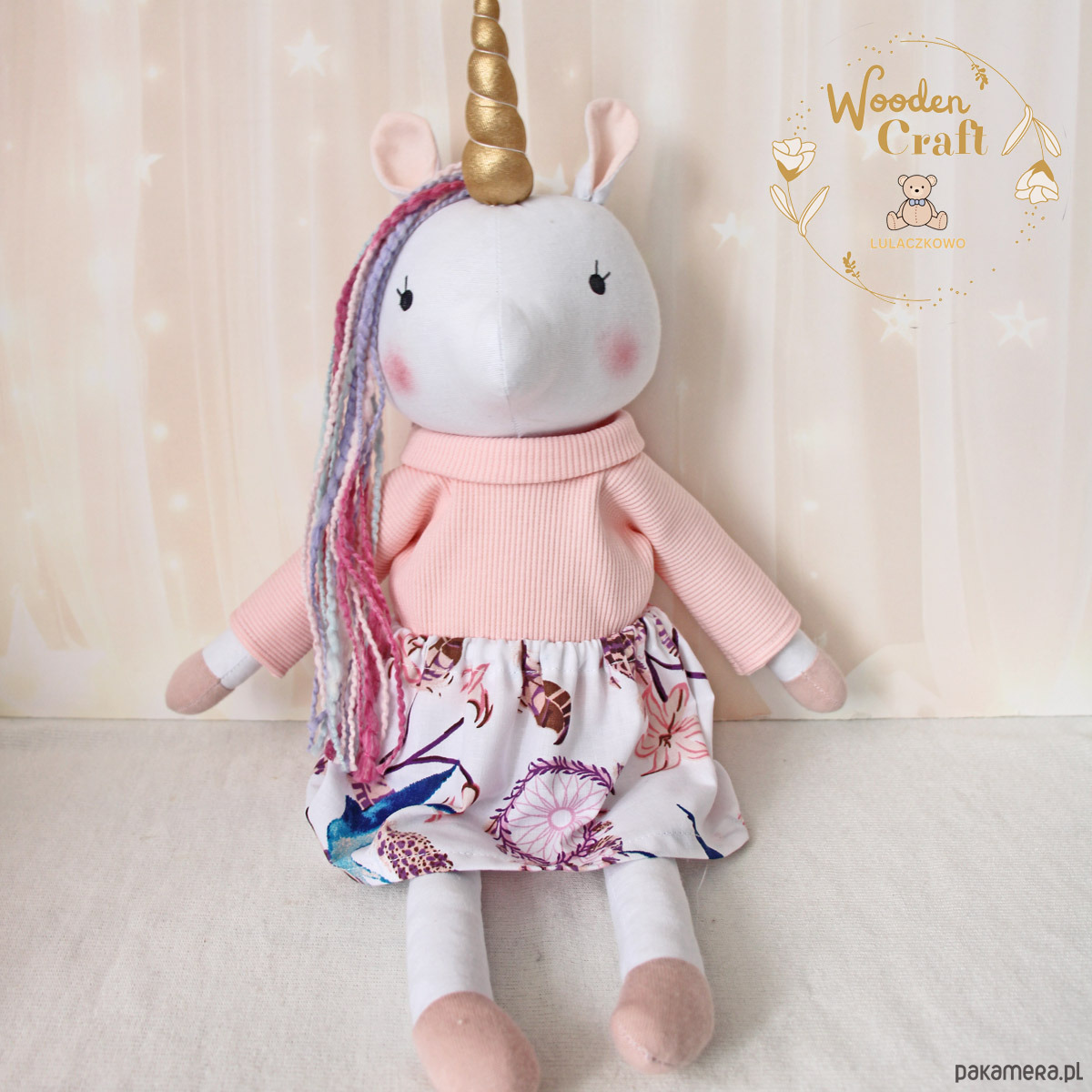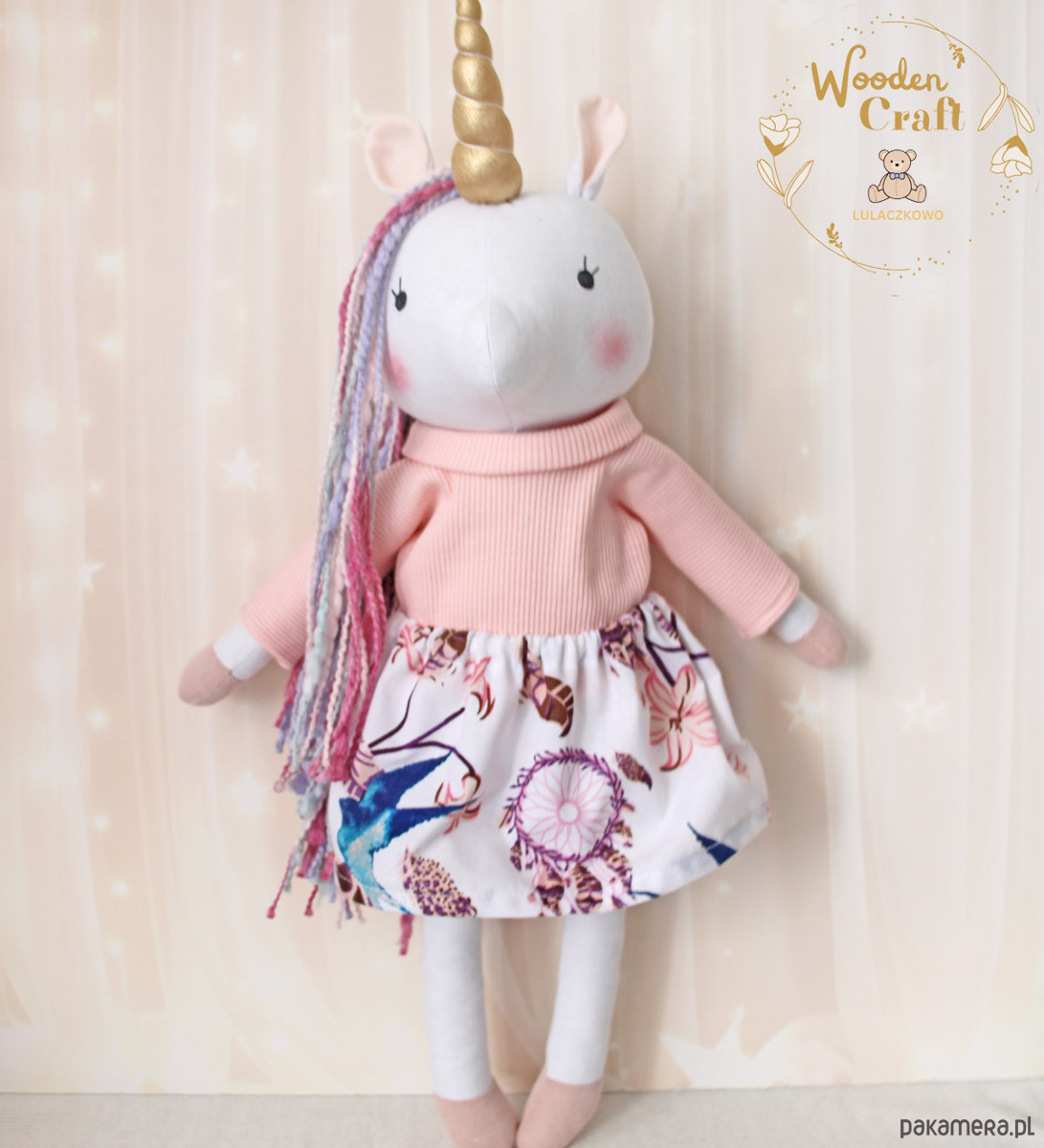 Przeurocza przytulanka, jednorożec, uszyty ręcznie z najwyższą starannością, ubrany w pudrowo-różowy sweterek i białą spódniczkę z motywem łapaczy snów. Wykonany ze 100% bawełny, wypełniony antyalergiczną kulką silikonową. Oczka malowane wodoodpornym markerem, włosy z cieniowanej włóczki, róg uszyty w miękkiej połyskującej tkaniny. Spódniczkę i sweterek można swobodnie zdejmować, posiadają gumeczki. Górne i dolne łapki układają się luźno, jednorożec siedzi z podparciem.