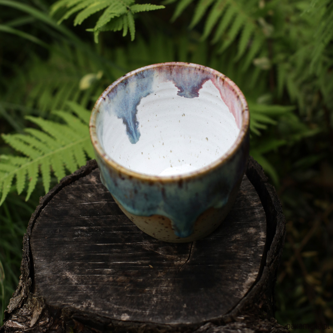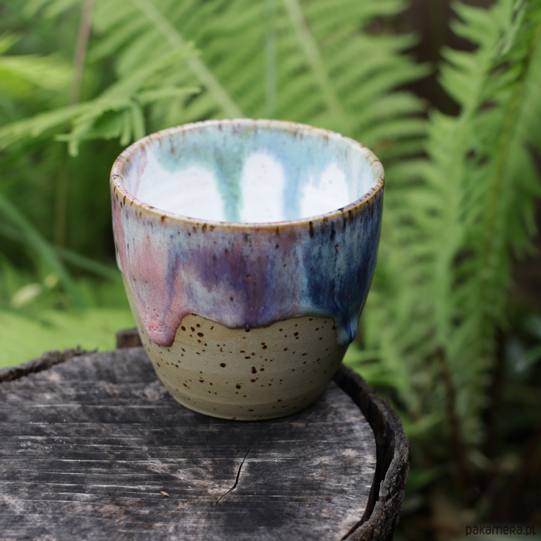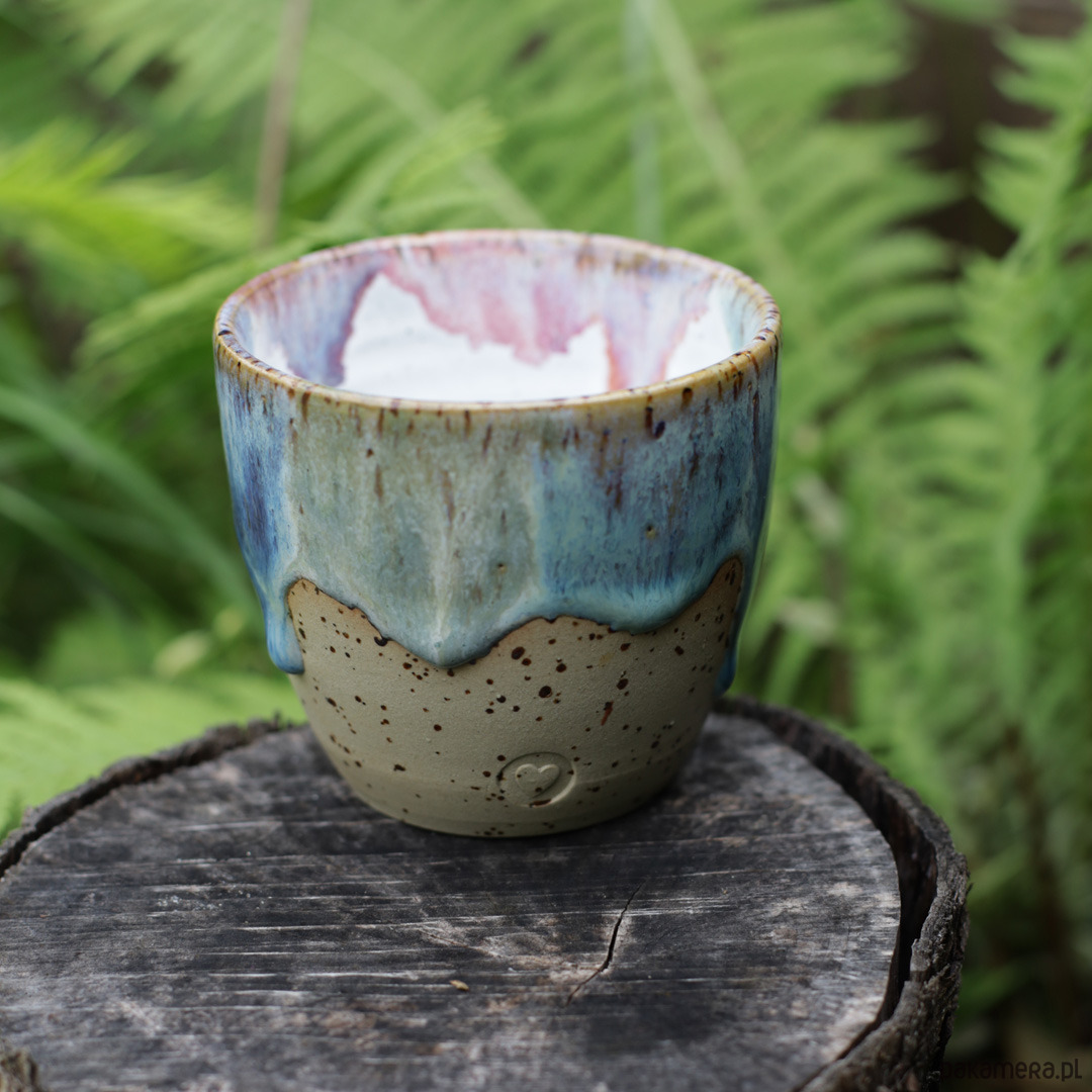 Czarka toczona ręcznie na kole garncarskim. Glina w kolorze beżowym w kropeczki. Szkliwiona szkliwem autorską mieszanką 11 szkliw, które tworzą słodką, jednorożcową kompozycję kolorystyczną.
