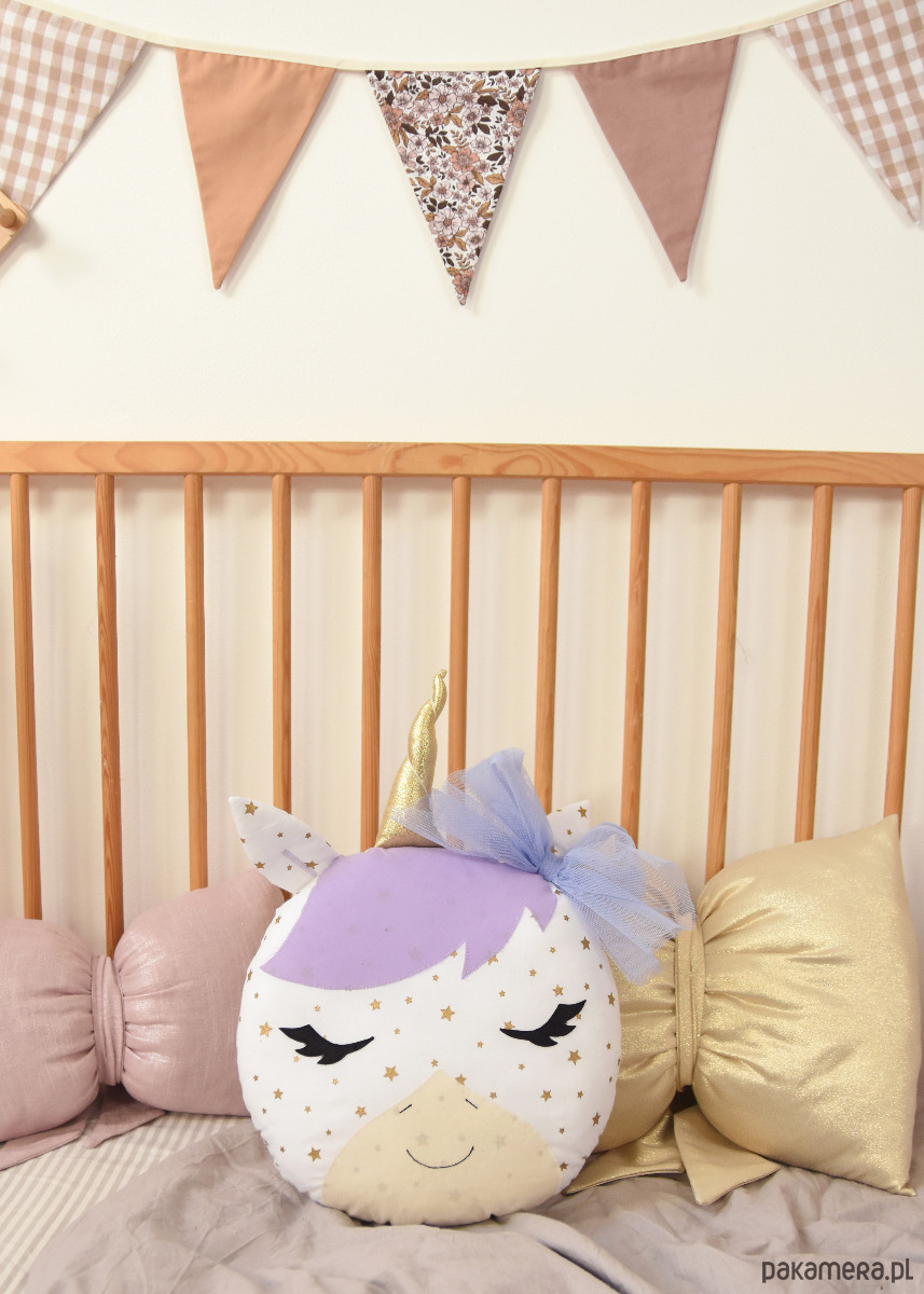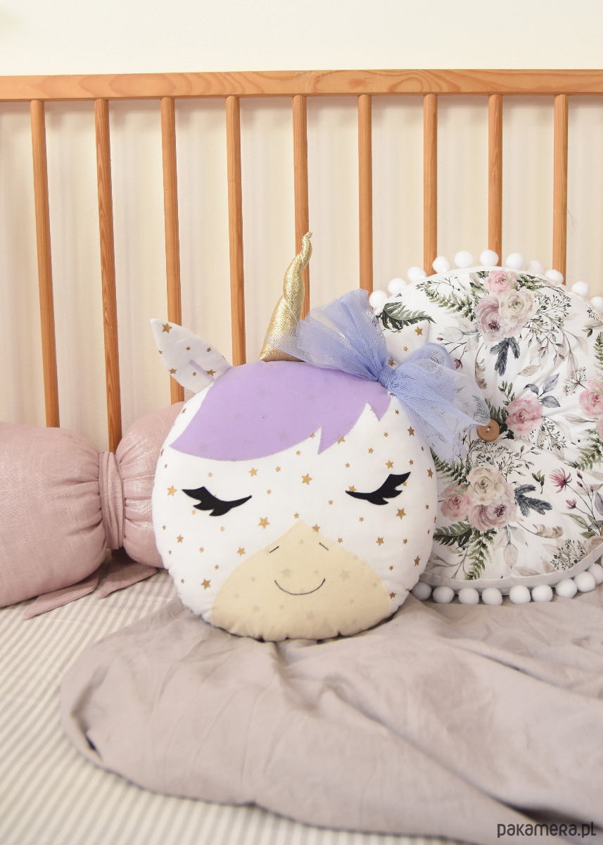 Poduszka w kształcie jednorożca uszyta z bawełnianych tkanin, tiulu oraz filcu. Całość solidnie wypełniona antyalergiczną kulką silikonową.