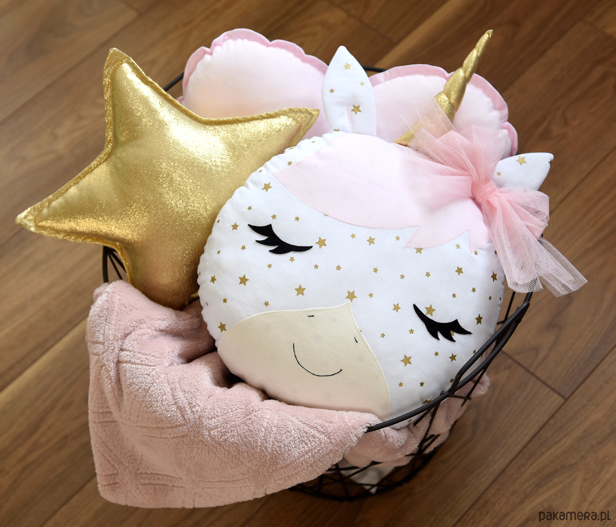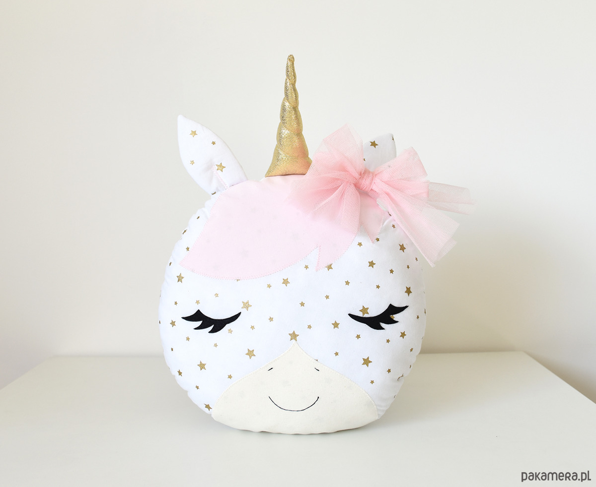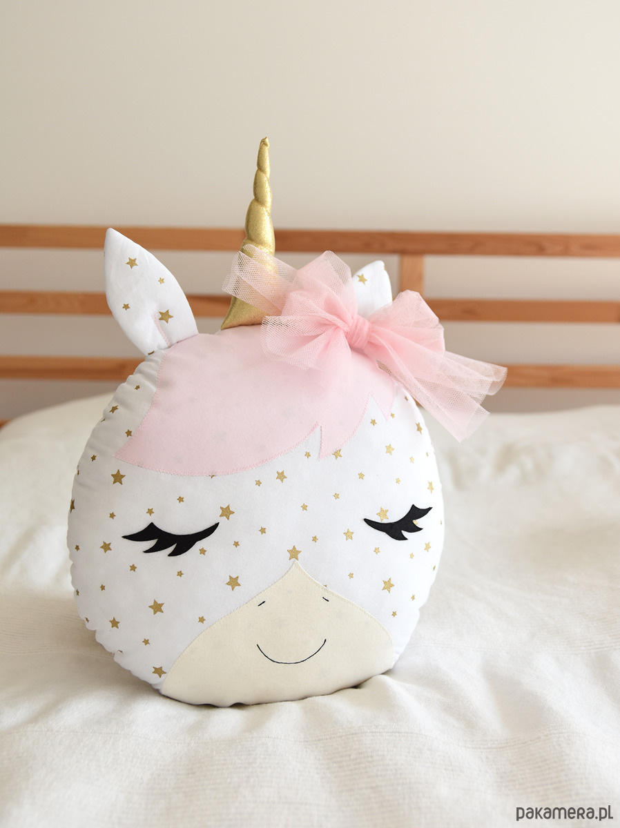 Poduszka w kształcie jednorożca uszyta z bawełnianych tkanin, tiulu oraz filcu. Całość solidnie wypełniona antyalergiczną kulką silikonową.