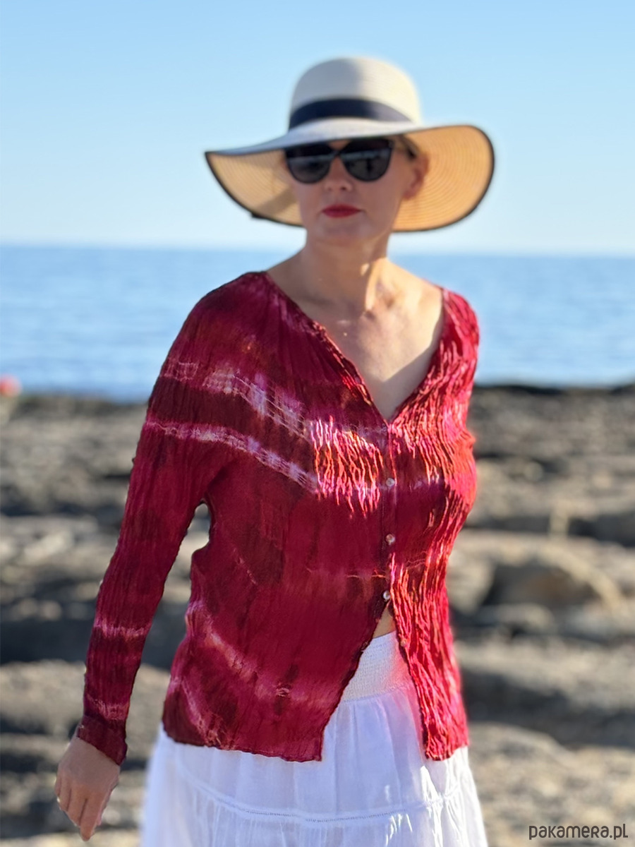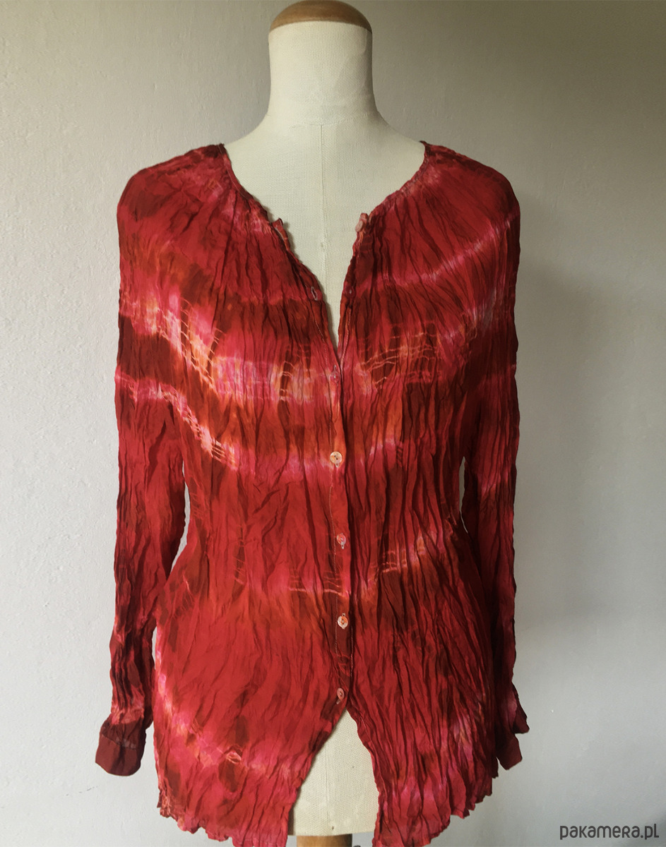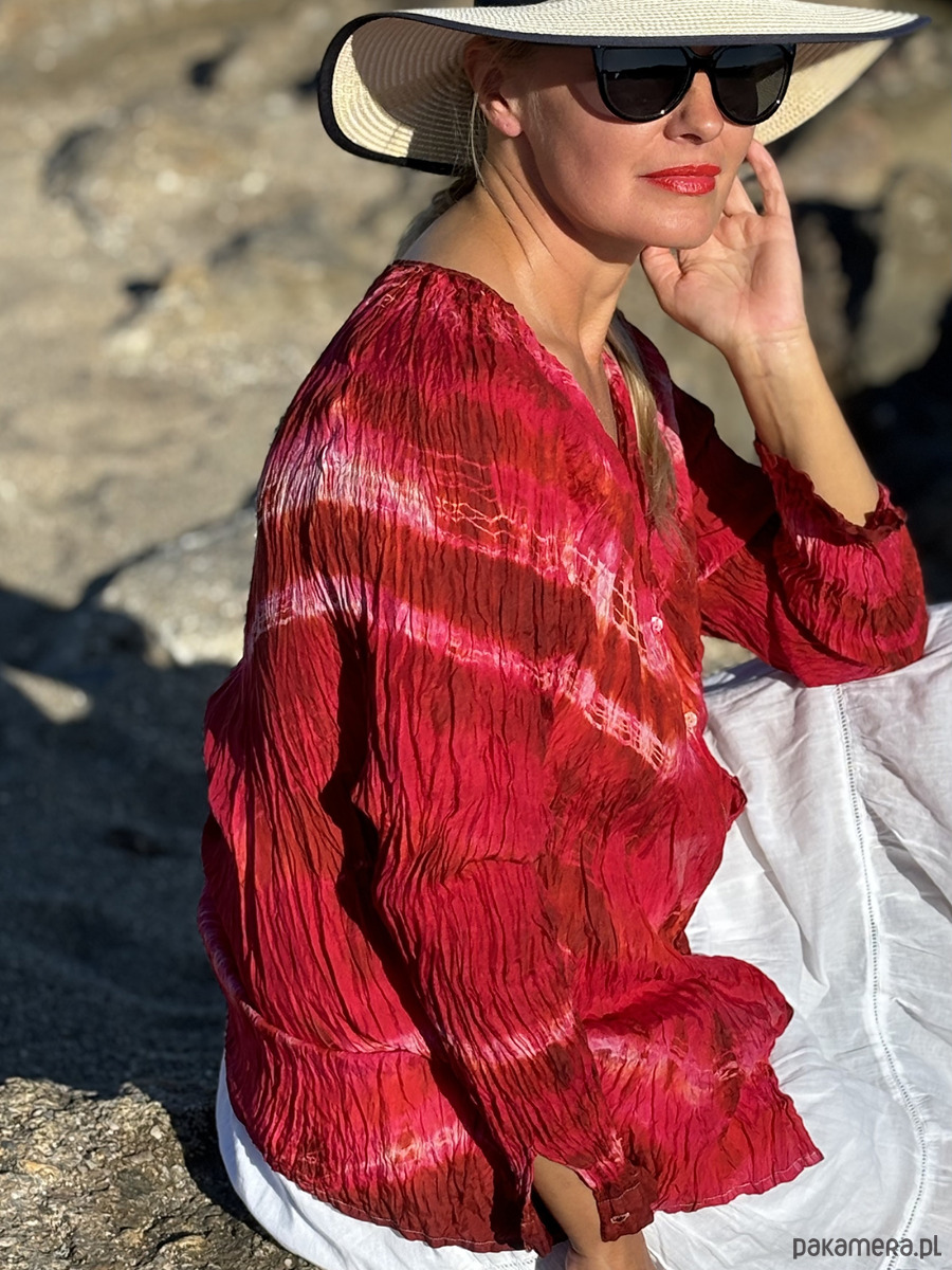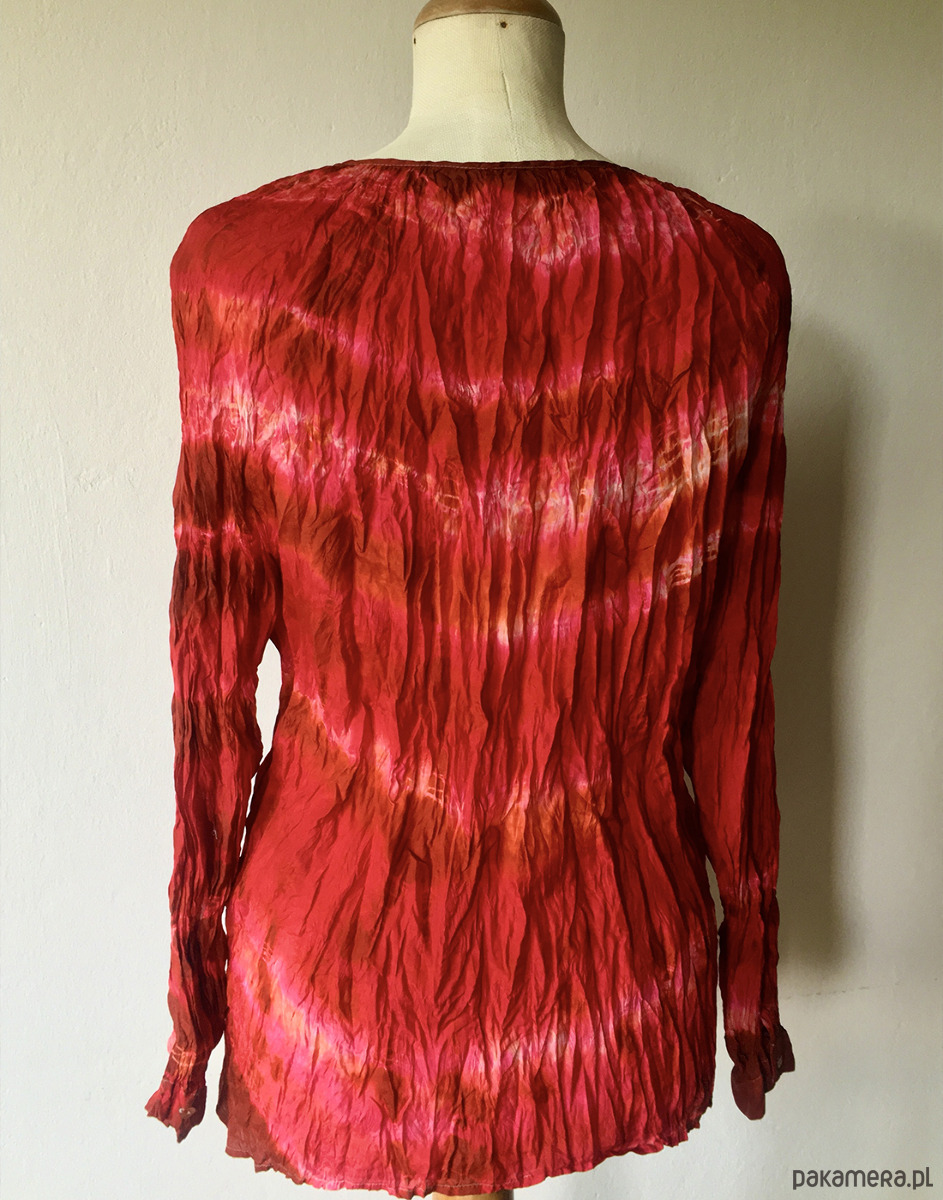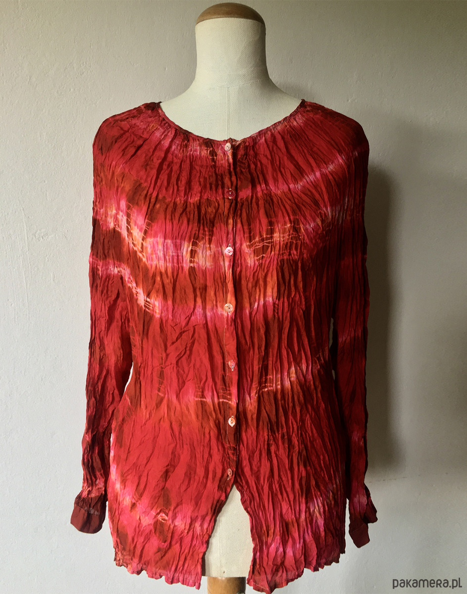 Koszula jedwabna ( 100%pure Silk ) LOHITHA w energetycznej buddyjskiej czerwieni ( od ciepłej ceglanej do nuty różu - amarantu ). Bardzo nie lubię prasowania : ( dlatego wymyśliłam gnieciuchy - pierzesz, suszysz w starej rajtuzie, zwijasz, nakładasz recepturkę i wrzucasz do szuflady - ( zobacz zdjęcie ) Nic nie waży i nie zajmuje miejsca, wepchniesz do najbardziej wypakowanej walizki. Rękaw kimonowy i dość uniwersalny rozmiar ( według mnie od S do L będzie ok ) Wymiary : długość 68 cm, szerokość w biuście 106 cm, długość rękawa 59 cm, obwód rękawa w mankiecie 20 cm. Pokazuję na manekinie rozmiar 38. Można narzucić na bikini na plaży, ale można też wystąpić na imprezie w wersji eleganckiej. : ) I co jest idealne - po zdjęciu gumki zawsze jest gotowa do włożenia w ostatniej chwili : )