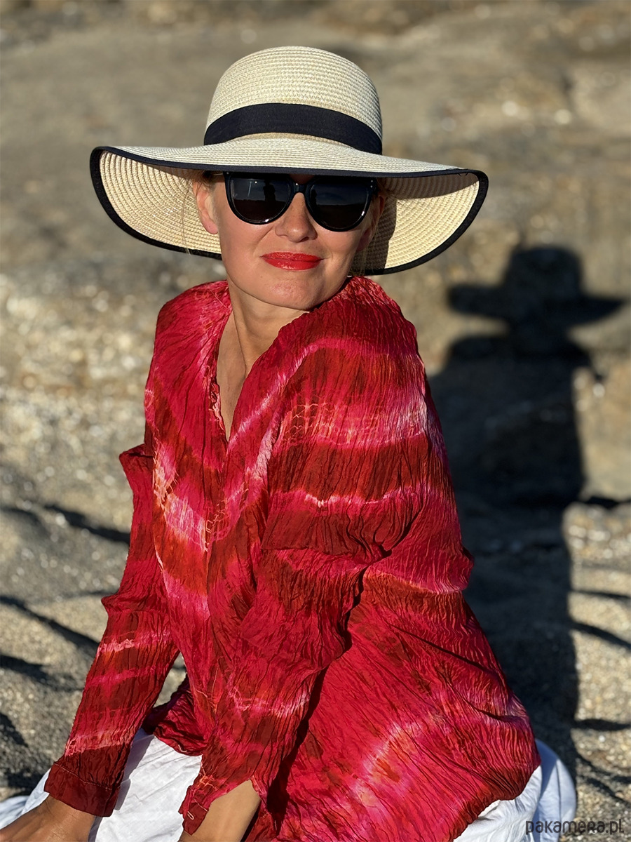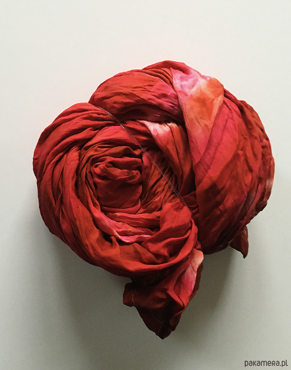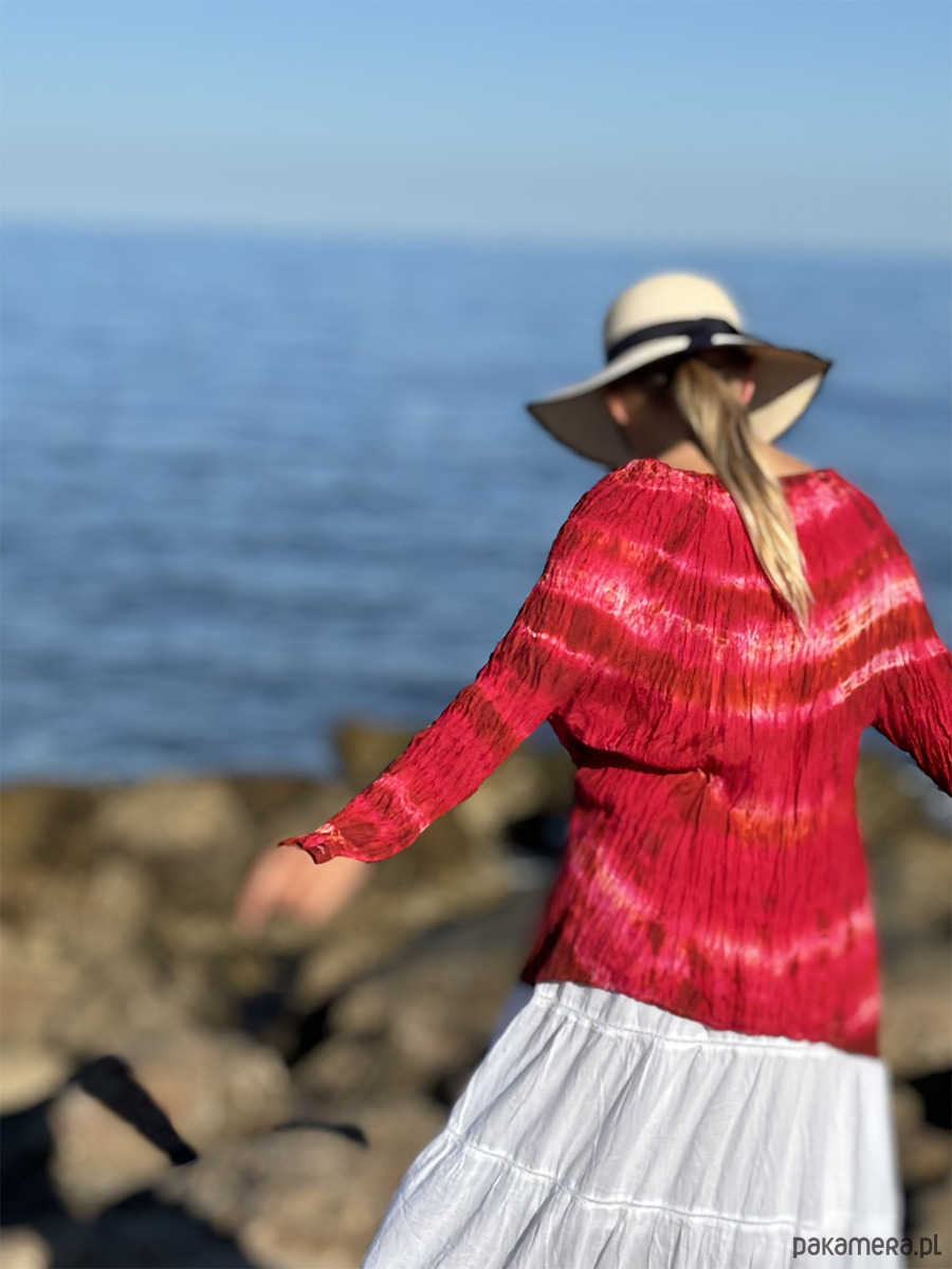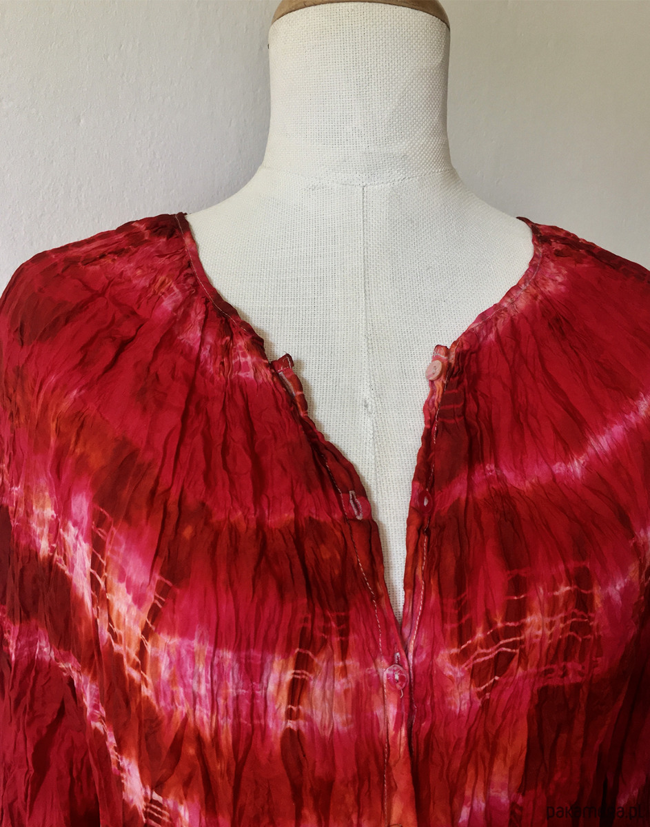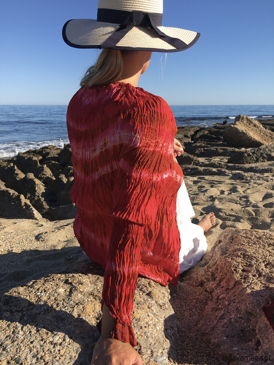 Koszula jedwabna ( 100%pure Silk ) LOHITHA w energetycznej buddyjskiej czerwieni ( od ciepłej ceglanej do nuty różu - amarantu ). Bardzo nie lubię prasowania : ( dlatego wymyśliłam gnieciuchy - pierzesz, suszysz w starej rajtuzie, zwijasz, nakładasz recepturkę i wrzucasz do szuflady - ( zobacz zdjęcie ) Nic nie waży i nie zajmuje miejsca, wepchniesz do najbardziej wypakowanej walizki. Rękaw kimonowy i dość uniwersalny rozmiar ( według mnie od S do L będzie ok ) Wymiary : długość 68 cm, szerokość w biuście 106 cm, długość rękawa 59 cm, obwód rękawa w mankiecie 20 cm. Pokazuję na manekinie rozmiar 38. Można narzucić na bikini na plaży, ale można też wystąpić na imprezie w wersji eleganckiej. : ) I co jest idealne - po zdjęciu gumki zawsze jest gotowa do włożenia w ostatniej chwili : )