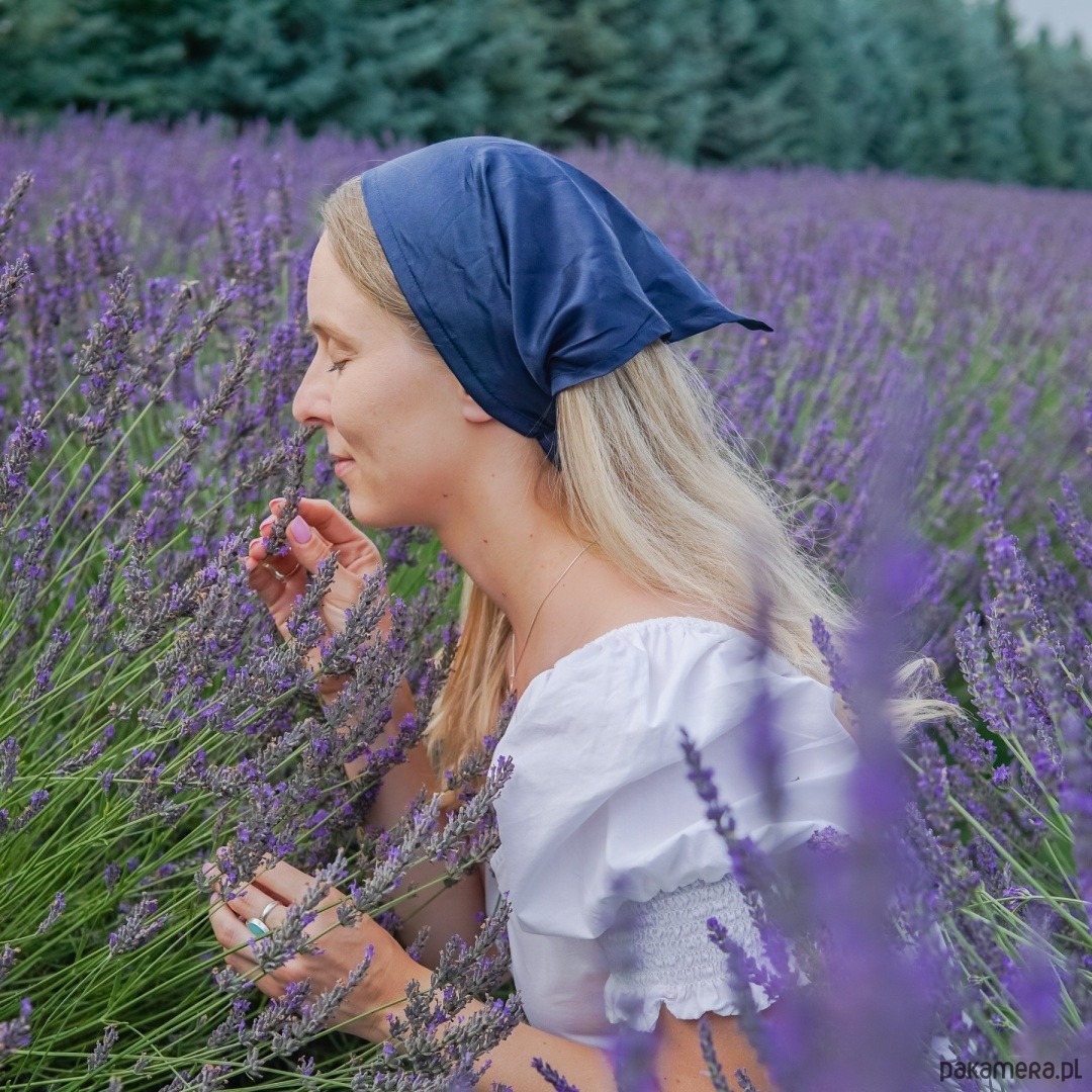 Grafitowa chusta o trójkątnym kroju to minimalistyczny luksus na co dzień. Gładka, satynowa powierzchnia miękko opływa głowę, a subtelny połysk pięknie łapie światło. Od spodu wszyłam elastyczną gumkę, dzięki czemu chusta sama się trzyma – bez ciasnego wiązania i bez ryzyka splątanych włosów. Końce możesz zostawić luźno dla efektu vintage albo lekko związać z tyłu. Ręcznie szyta w Polsce.