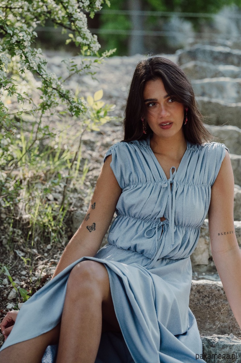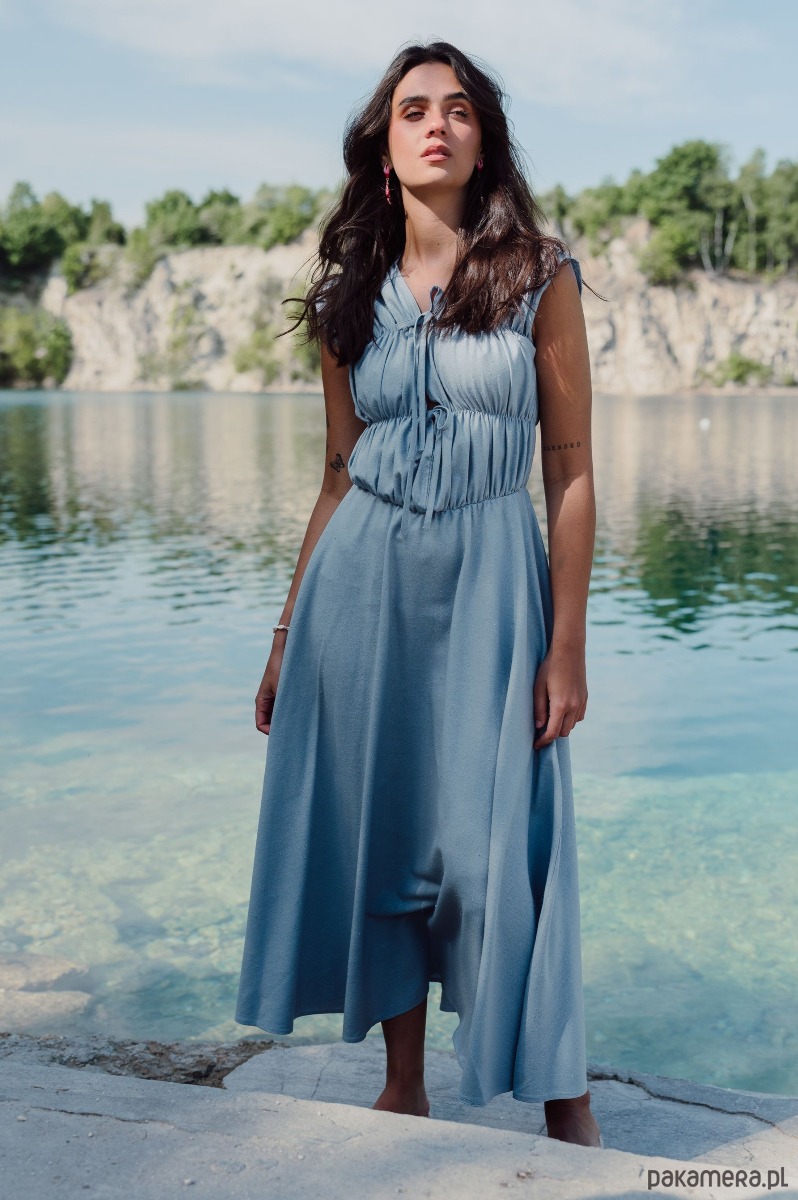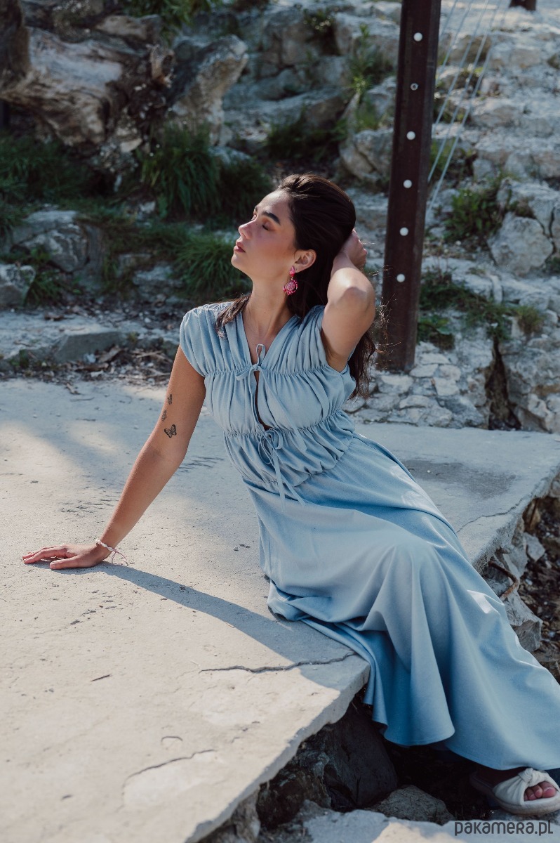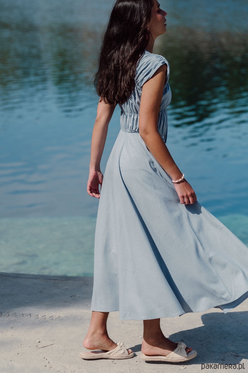 • Subtelny niebieski: Przygaszony odcień niebieskiego nadaje sukience wyrafinowany i ponadczasowy charakter, dodając każdej chwili delikatności i subtelnej elegancji.
