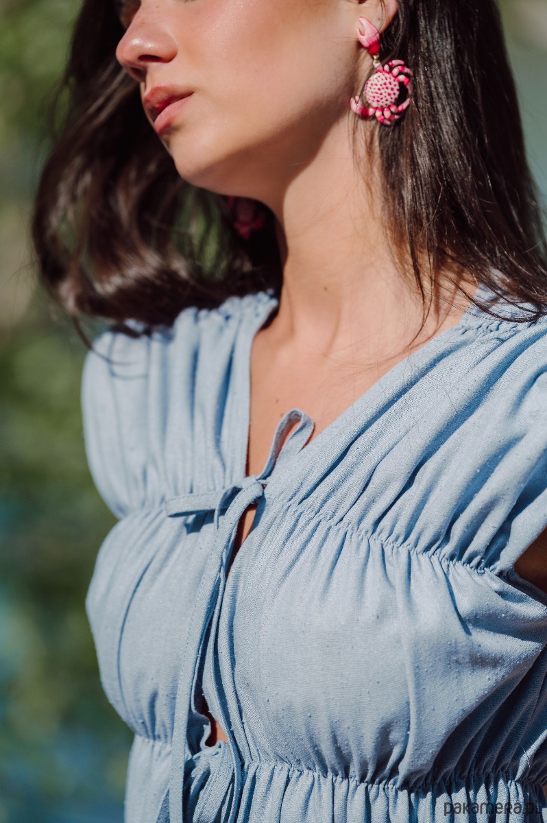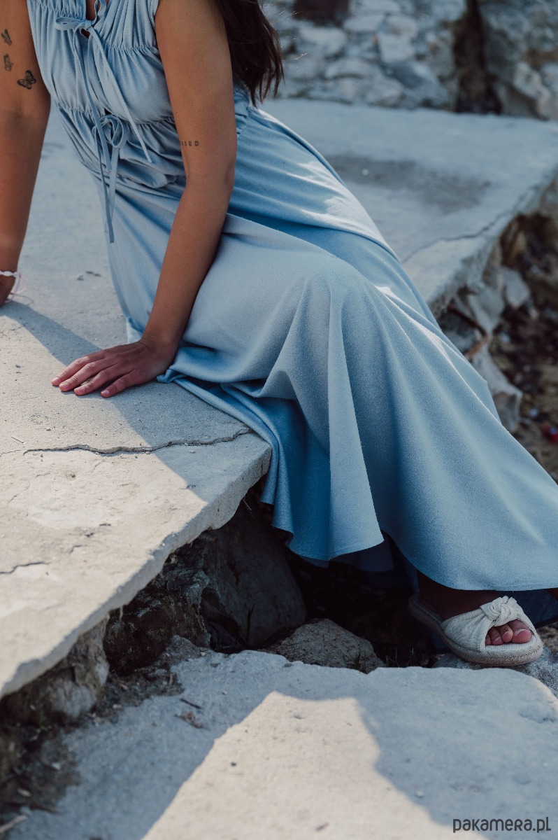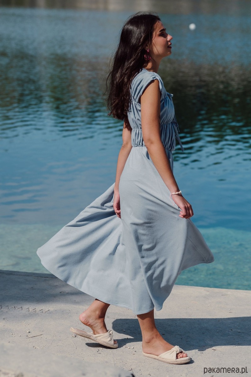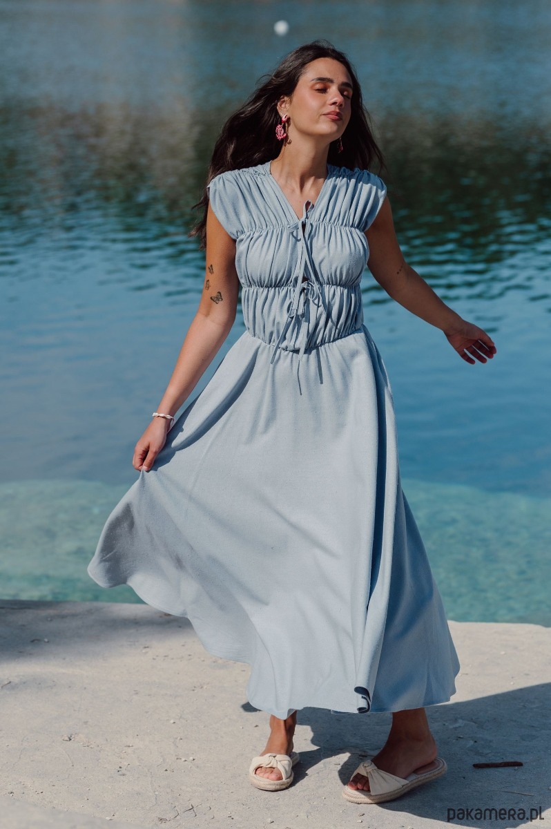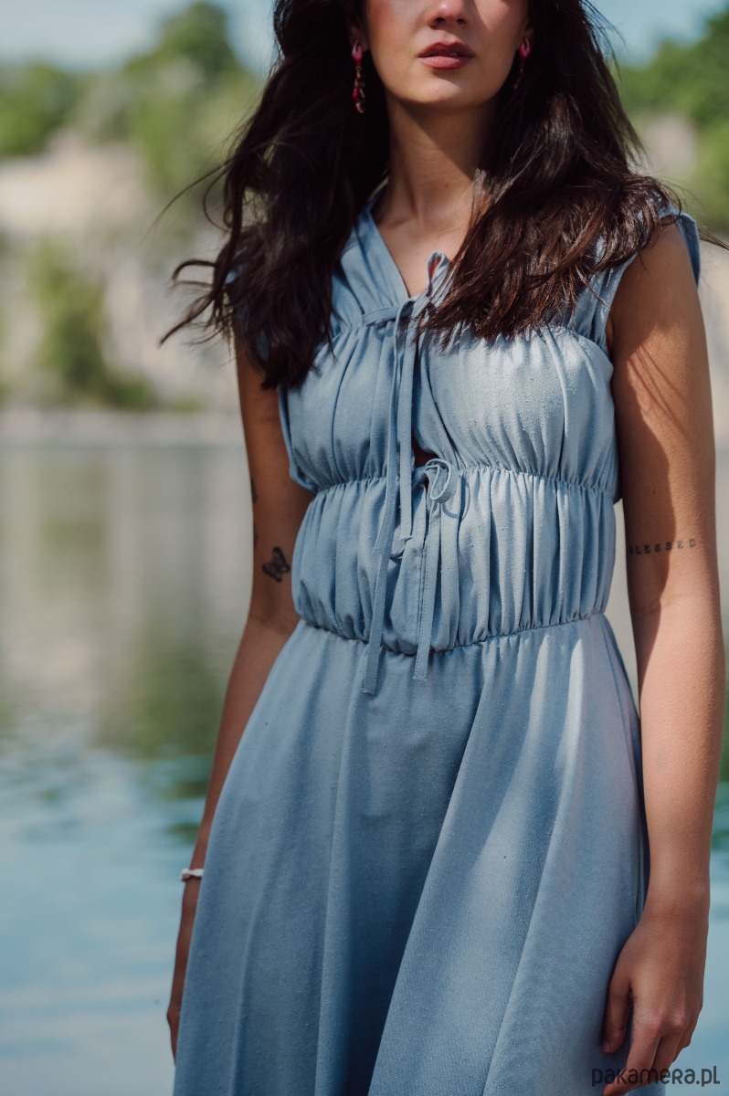 • Subtelny niebieski: Przygaszony odcień niebieskiego nadaje sukience wyrafinowany i ponadczasowy charakter, dodając każdej chwili delikatności i subtelnej elegancji.