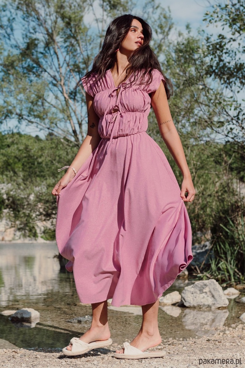 • Subtelny róż: Przygaszony odcień różu nadaje sukience wyrafinowany i ponadczasowy charakter, dodając każdej chwili delikatności i subtelnej elegancji.