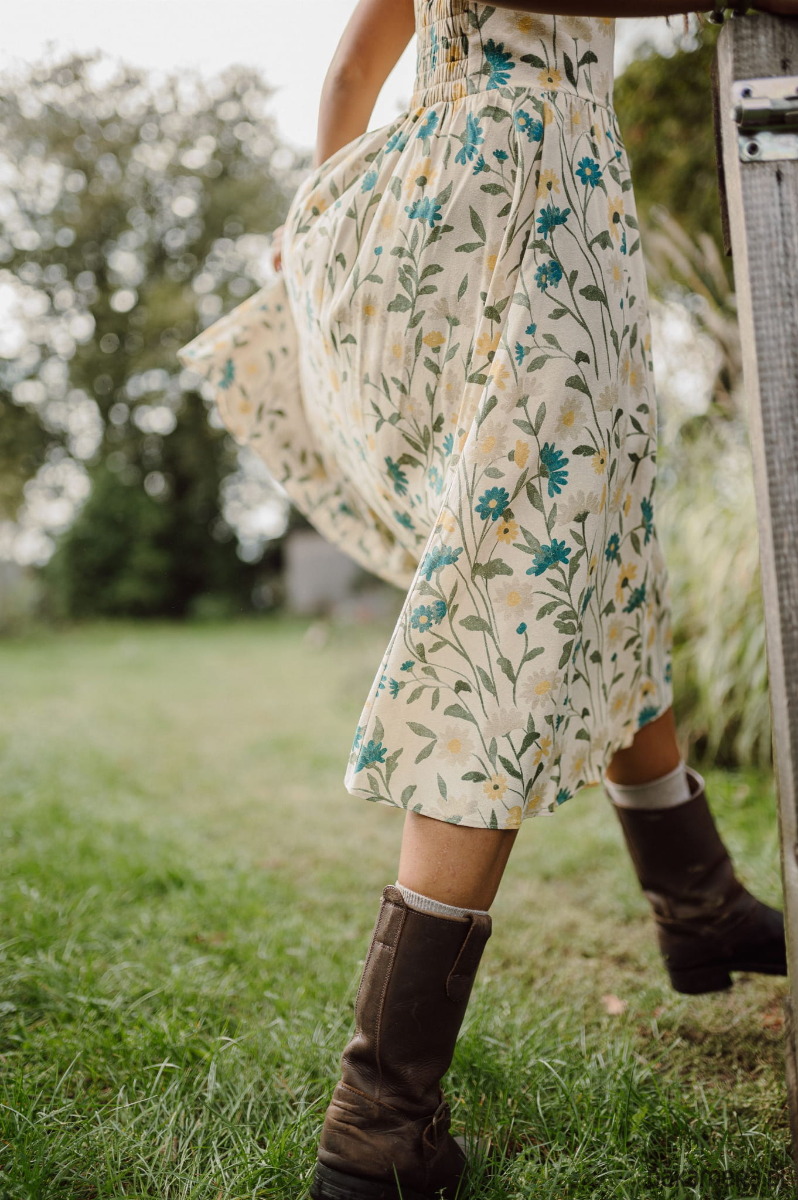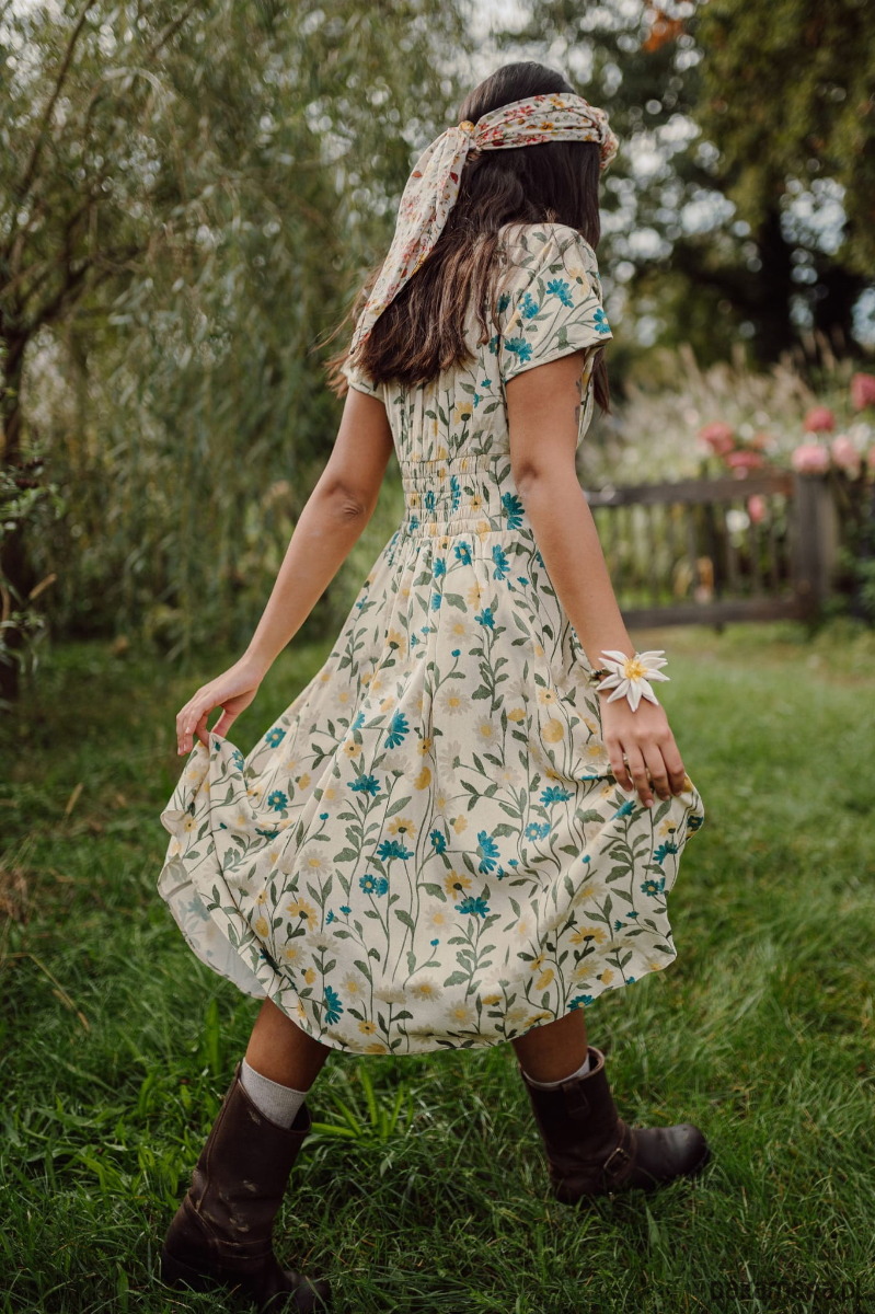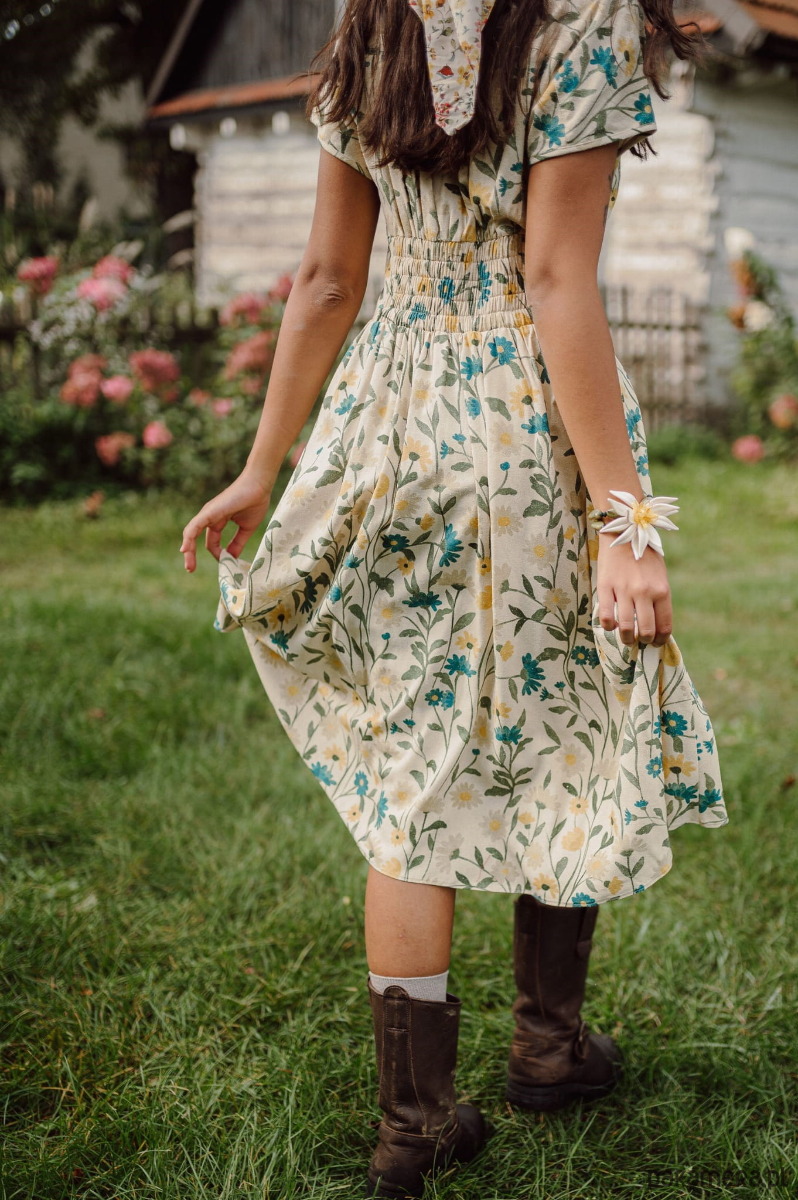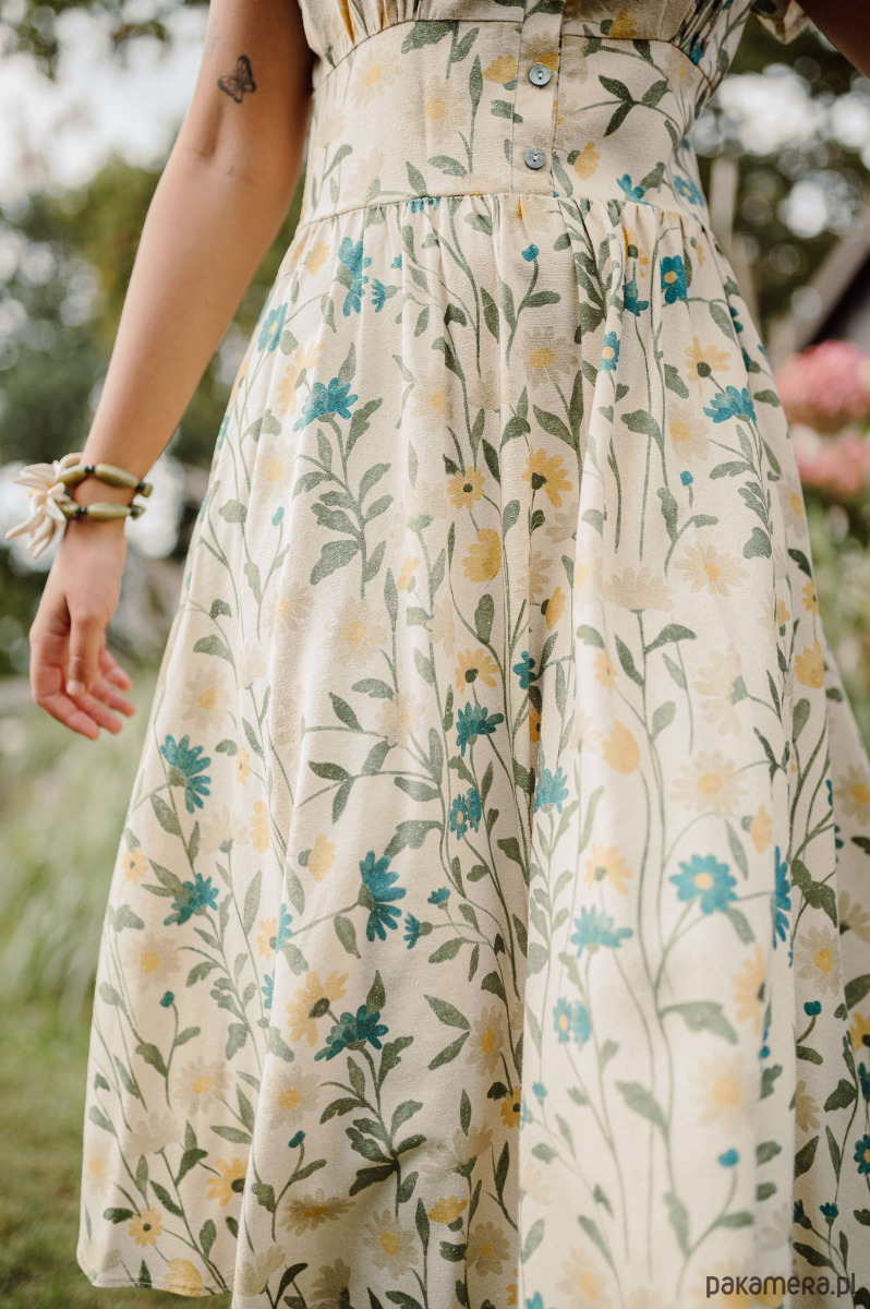 Sukienka z jedwabiu surowego naturalnego drukowanego w piękny kwiecisty wzór.
