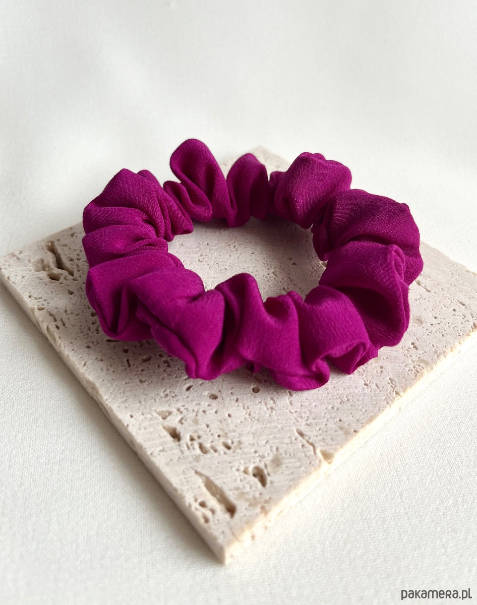 Jedwabna scrunchie Fuksja Chic w wersji mini 8 cm to subtelny dodatek na każdą okazję. Milutka i delikatna, pięknie przyozdobi Twoje włosy. Scrunchie ta doda charakteru każdej stylizacji – od codziennej po bardziej elegancką.
