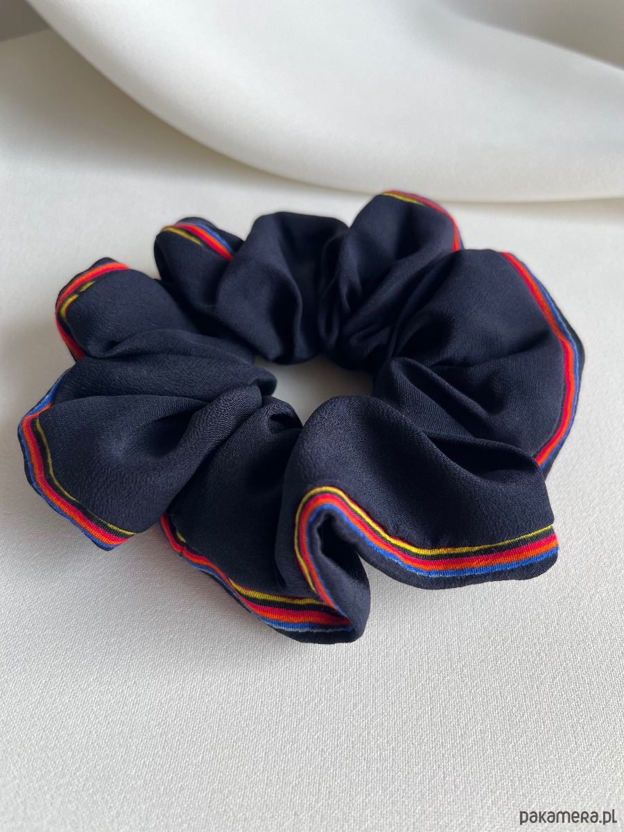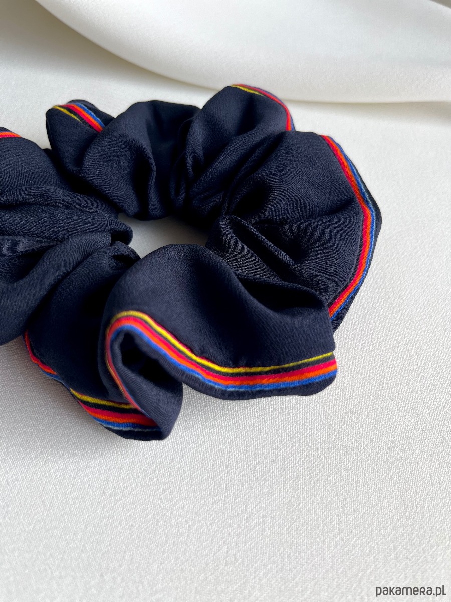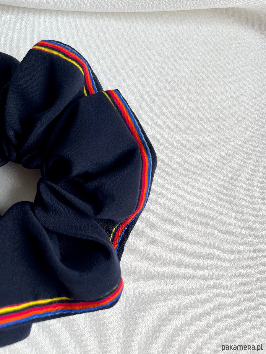 Jedwabna scrunchie Navy Blue Chic w granatowym odcieniu z ozdobną lamówką to subtelny dodatek, który pięknie przyozdobi Twoje włosy. Niezwykle wyjątkowa, ponieważ dostępna jest tylko jedna sztuka.
