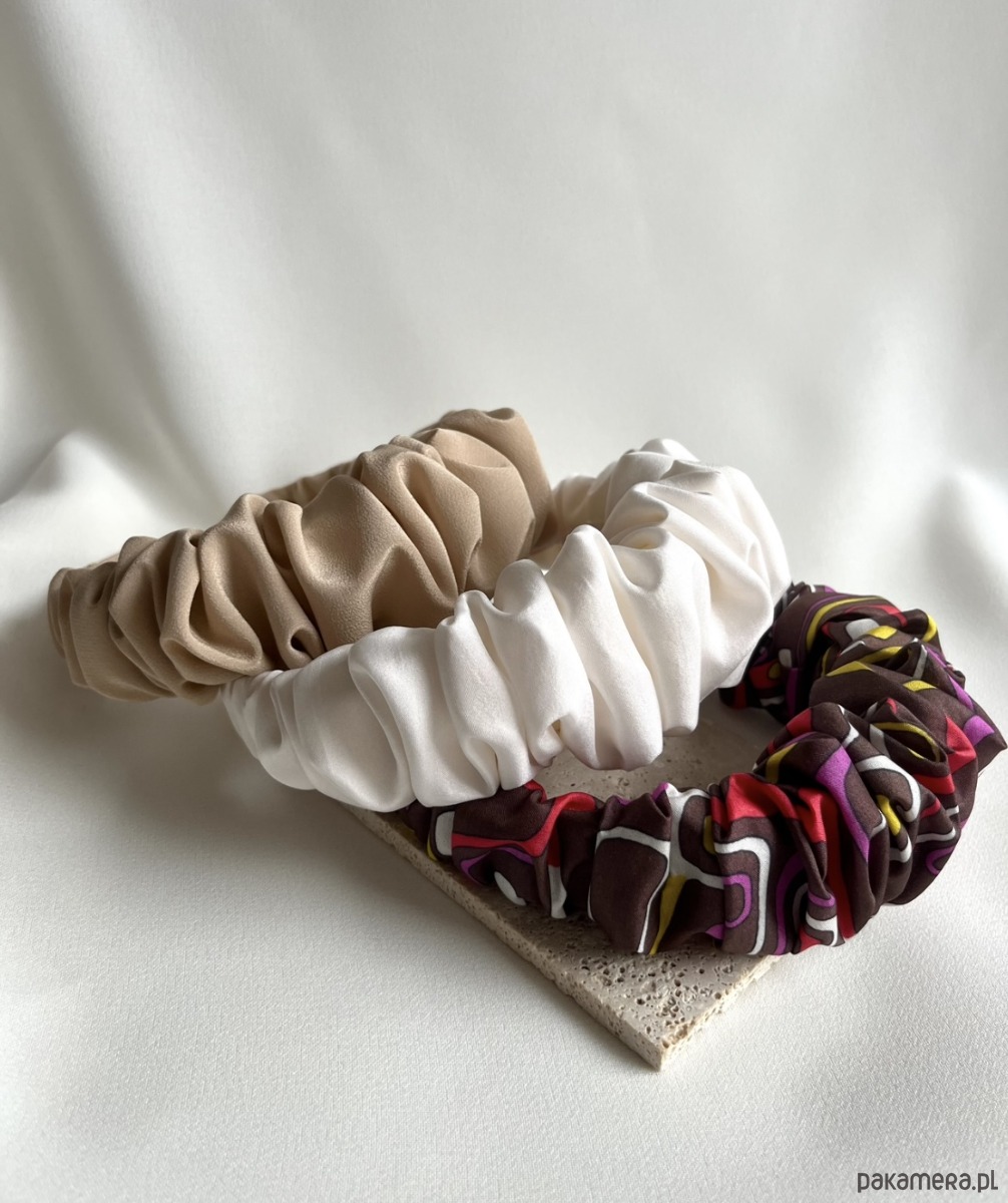 Jedwabna marszczona opaska Amy w wersji maxi w kolorze ecru to oryginalny i wyrazisty dodatek, który doda charakteru każdej stylizacji – od codziennej po bardziej elegancką.