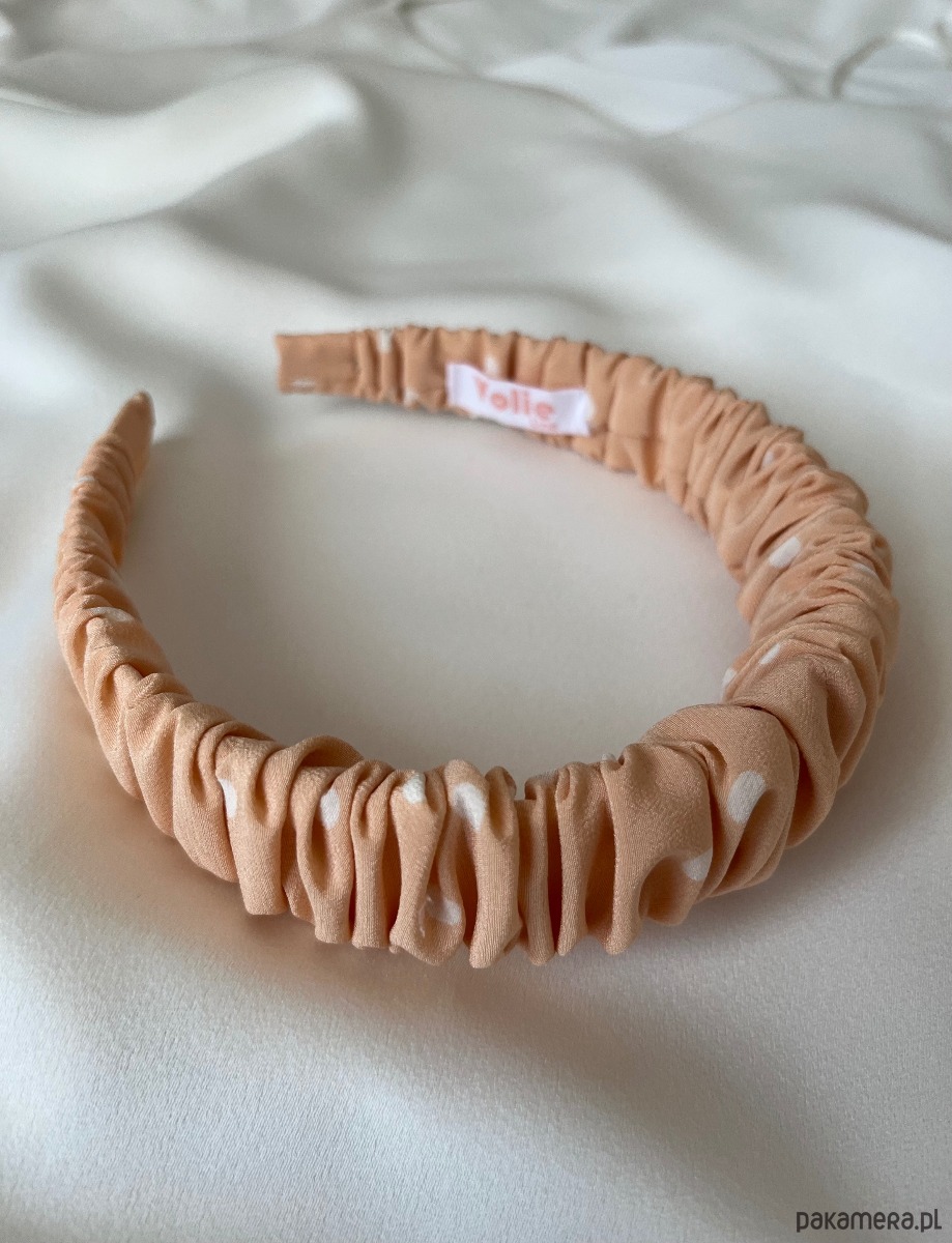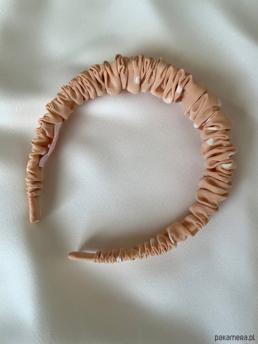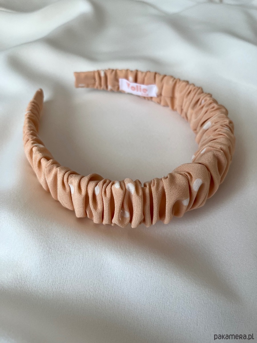 Jedwabna marszczona opaska Peach w wersji standard w uroczym brzoskwiniowym kolorze w białe groszko to oryginalny dodatek, który doda charakteru każdej stylizacji – od codziennej po bardziej elegancką.