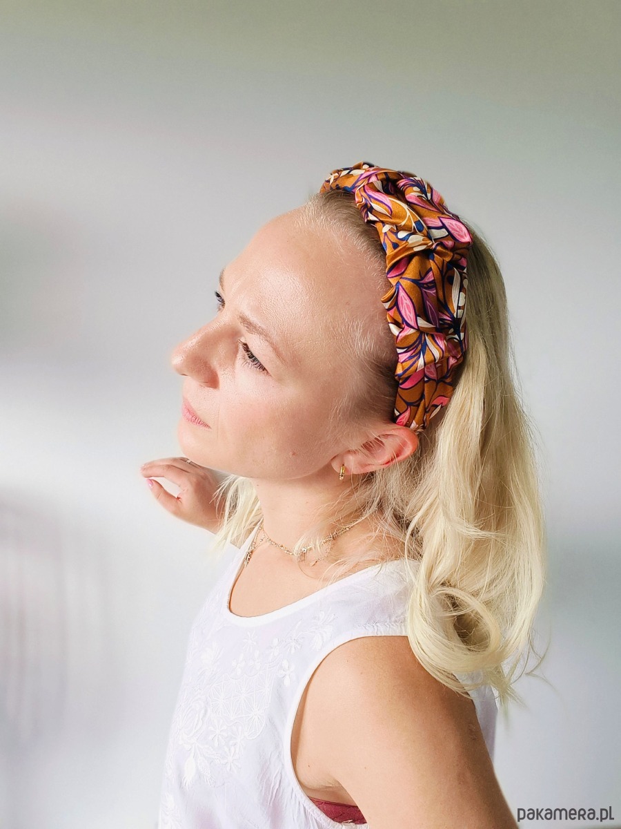 ✨ Design – klasyczna opaska na twardej bazie, starannie obszyta marszczonym jedwabiem; stabilna, a jednocześnie delikatna dla głowy.