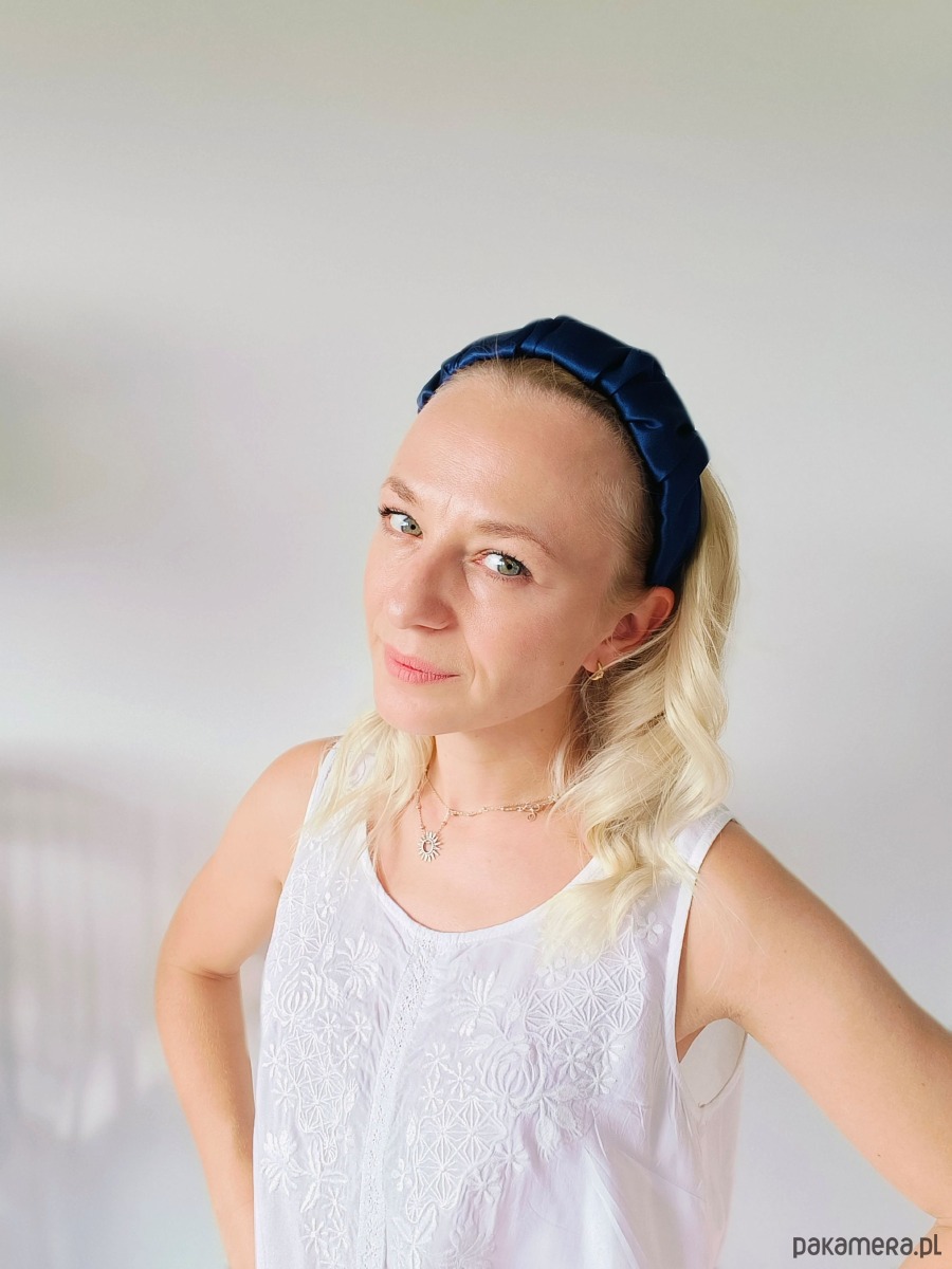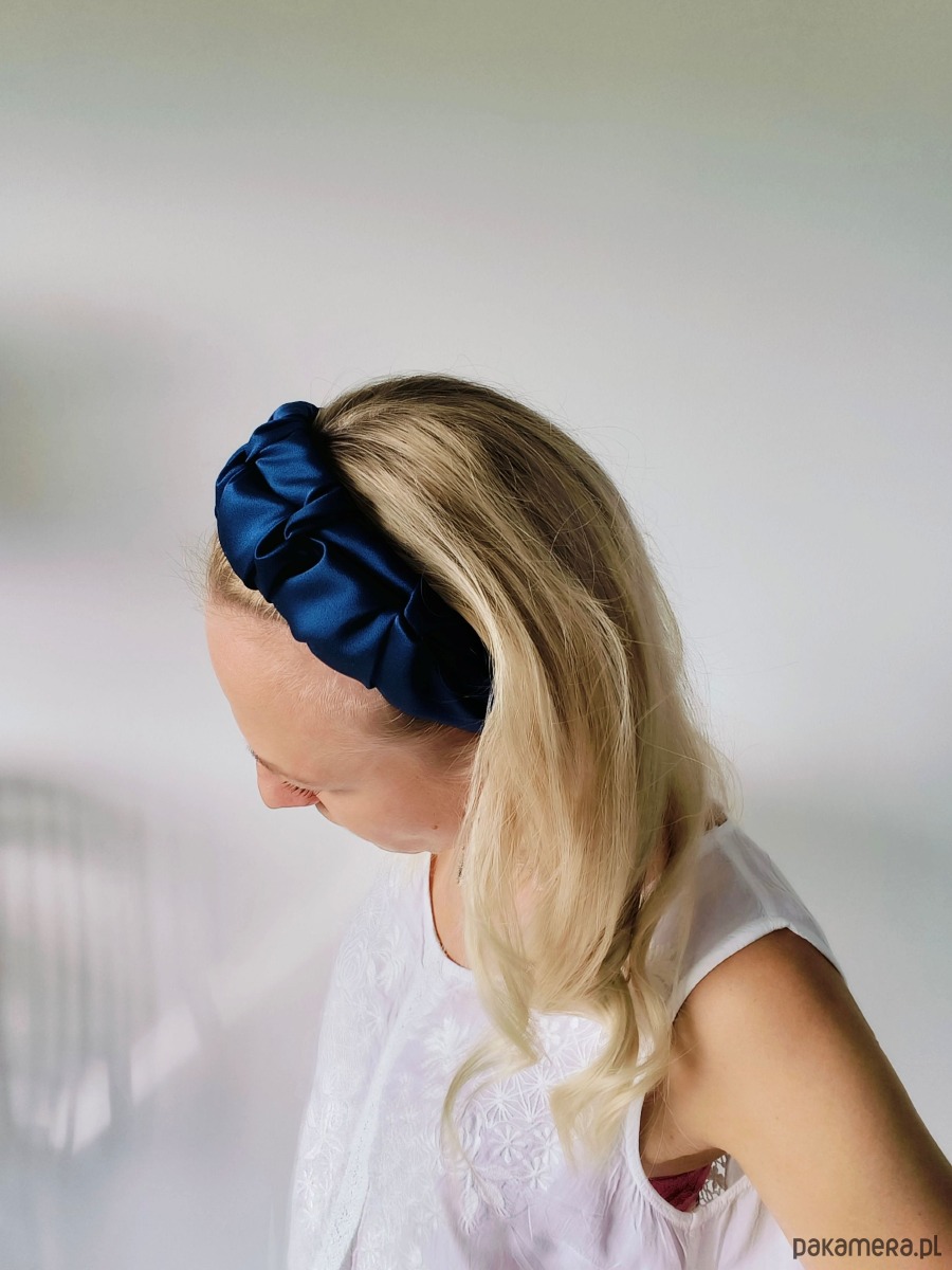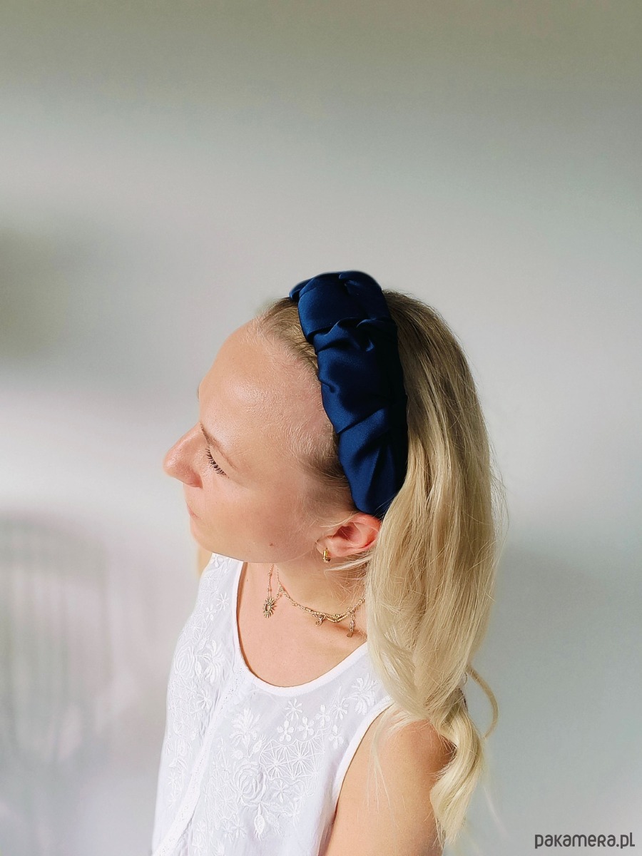 ✨ Design – klasyczna opaska na twardej bazie, starannie obszyta marszczonym jedwabiem; stabilna, a jednocześnie delikatna dla głowy.
