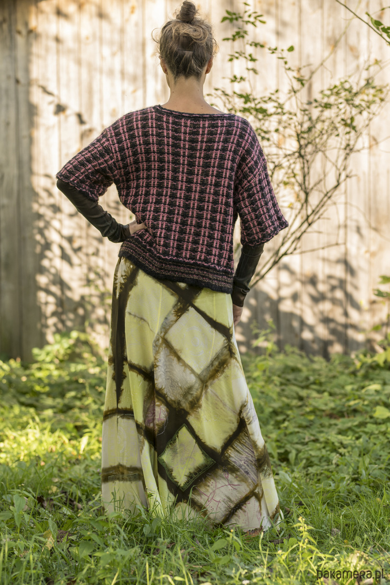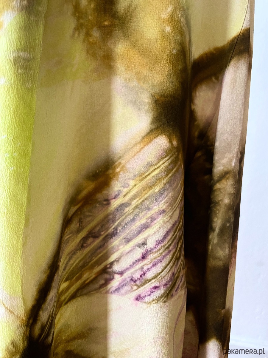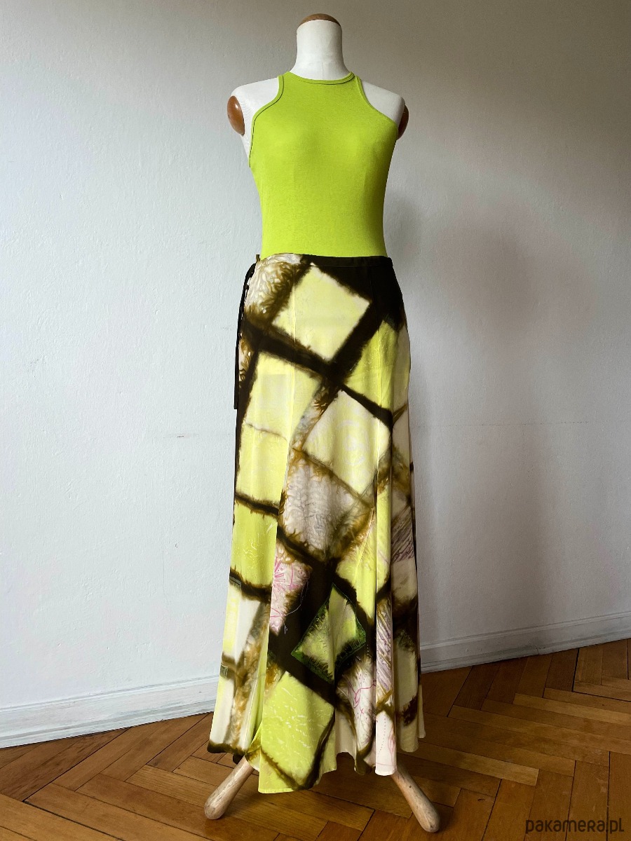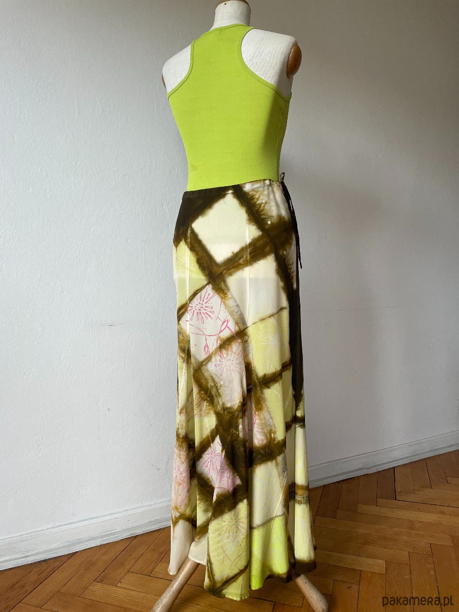 Długa jedwabna spódnica z jedwabiu naturalnego ( 100% krepa pure Silk ) Uszyta z 6 klinów, tak jak były szyte spódnice bananowe w latach 70 tych. Kliny mają specjalny krój , który sprawia że spódnica jest dość wąska na biodrach i płynnie poszerza się do dołu. Wyrafinowane zestawienie koloru khaki z zielonym i różowym. Barwiona techniką shibori, malowana i drukowana. Wymiary : długość 99 cm, pas ( regulowany ) max 85 cm, biodra obwód 98 cm, dół szerokość aż 244 cm ! bananowa