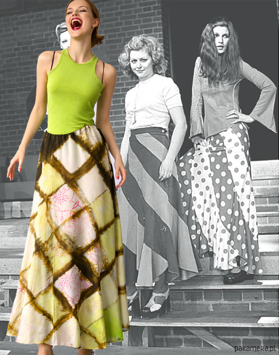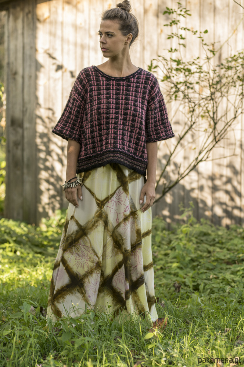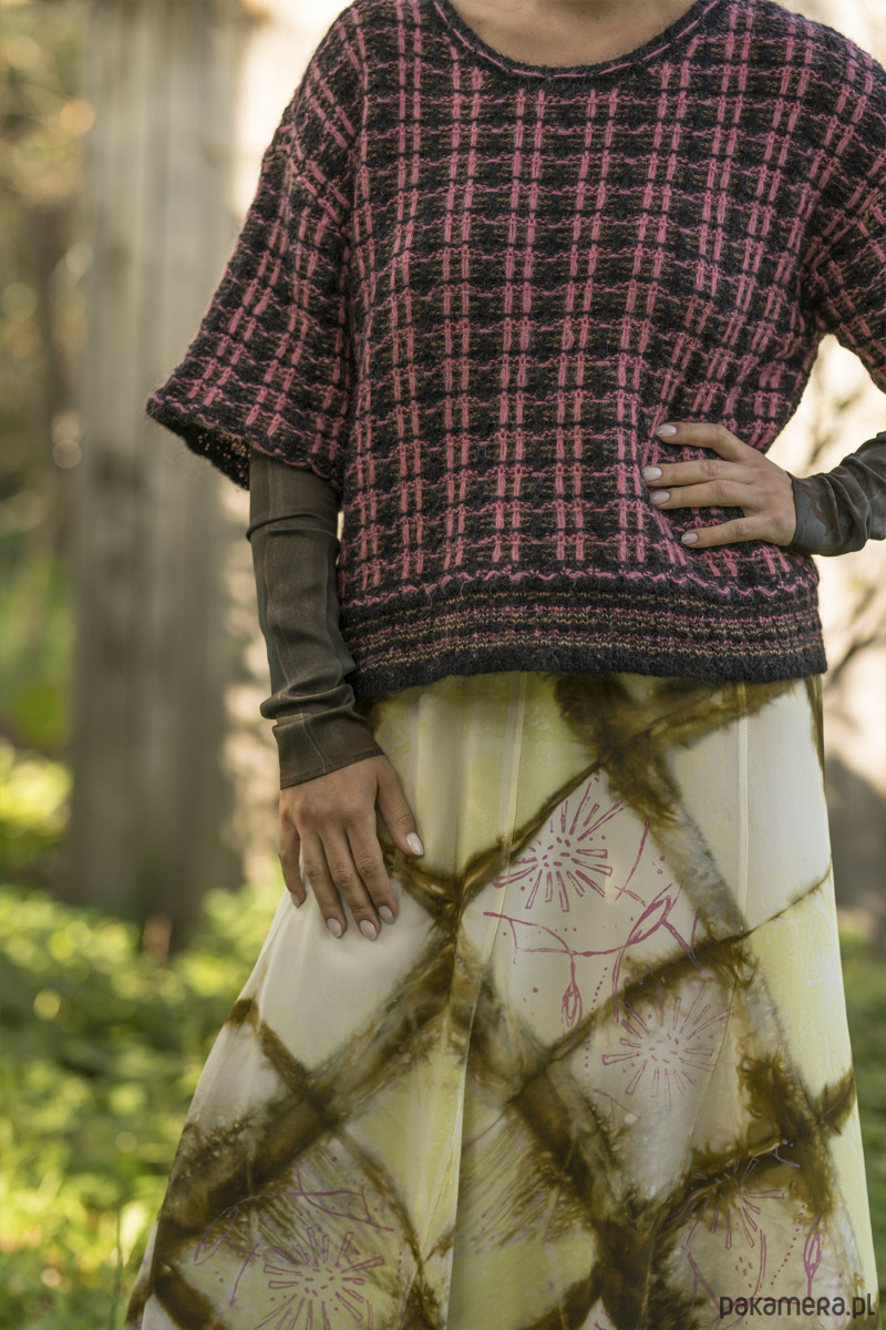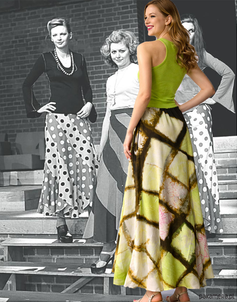 Długa jedwabna spódnica z jedwabiu naturalnego ( 100% krepa pure Silk ) Uszyta z 6 klinów, tak jak były szyte spódnice bananowe w latach 70 tych. Kliny mają specjalny krój , który sprawia że spódnica jest dość wąska na biodrach i płynnie poszerza się do dołu. Wyrafinowane zestawienie koloru khaki z zielonym i różowym. Barwiona techniką shibori, malowana i drukowana. Wymiary : długość 99 cm, pas ( regulowany ) max 85 cm, biodra obwód 98 cm, dół szerokość aż 244 cm ! bananowa