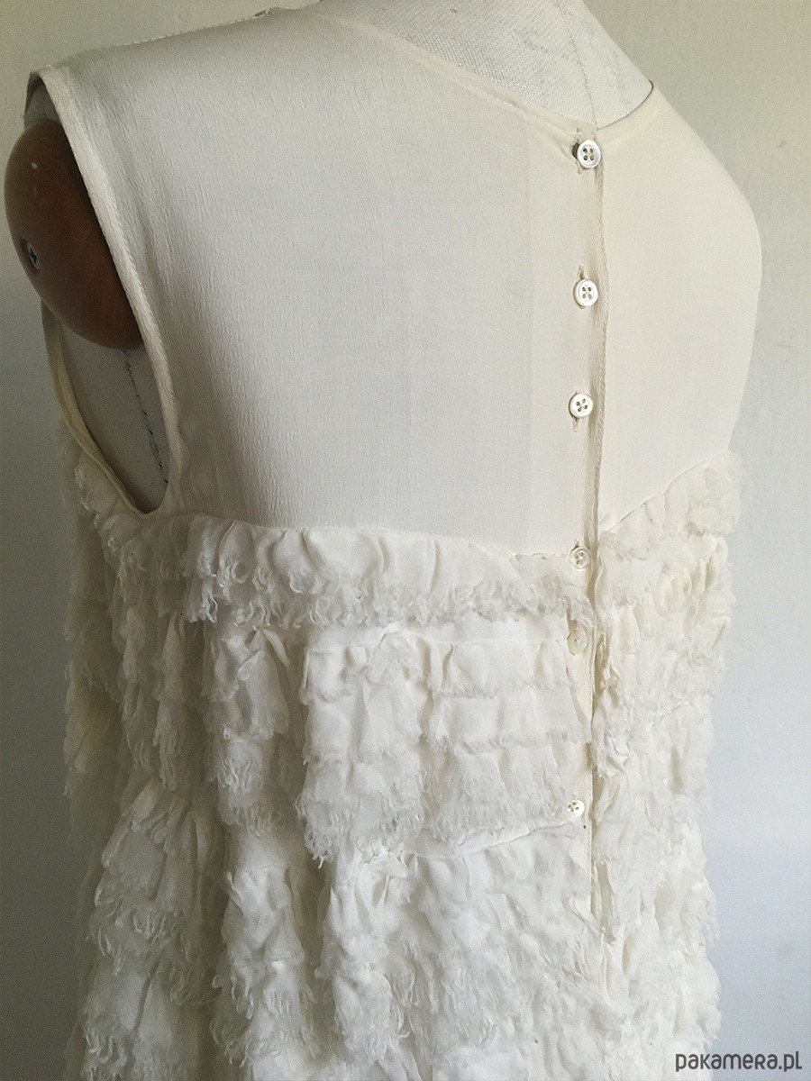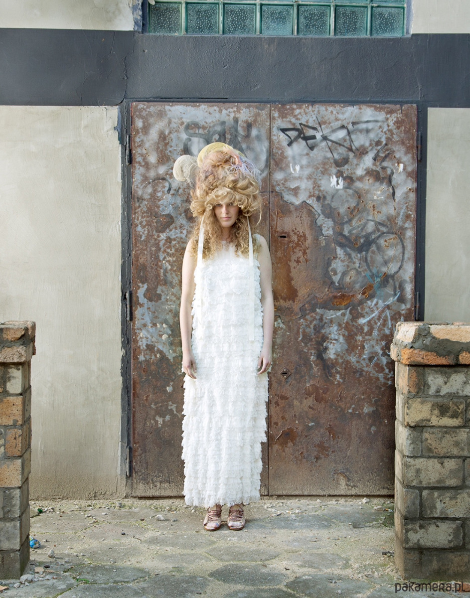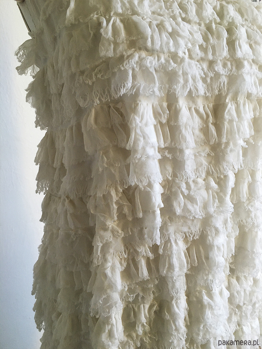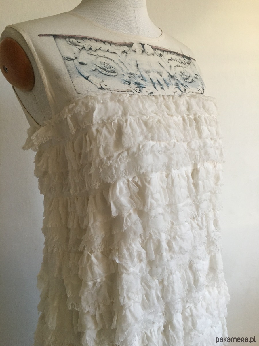 Bardzo, bardzo niekonwencjonalna suknia ślubna. Dla szczupłej, ekstrawaganckiej i …. odważnej. Suknia ślubna PUTTO. 100% jedwab naturalny. Uszyta z krepy jedwabnej i organzy jedwabnej. W kolorze biaałokremowym z efektem jakby futerka w wyniku naszycia nieskończonej ilości wystrzępionych falbanek- niesamowity efekt : ) Na karczku nadrukowany portal z łódzkiej kamienicy. Tył cały rozpinany na guziczki z masy perłowej. Można zrobić dowolnej długości rozporek z tyłu. Rozmiar moim zdaniem 34/36. Wymiary : Długość 143 cm, szerokość w biuście 86 cm i taka jest szerokość całej sukienki. Suknia ma bardzo atrakcyjną cenę ponieważ uczestniczyła w sesji zdjęciowej i nie jest całkiem nowa.