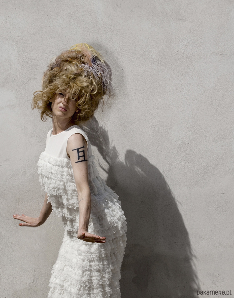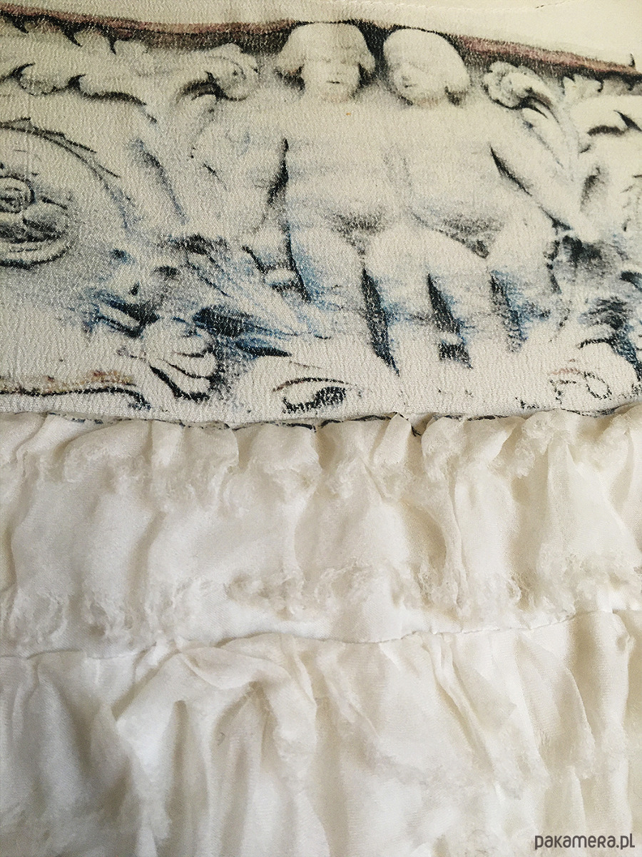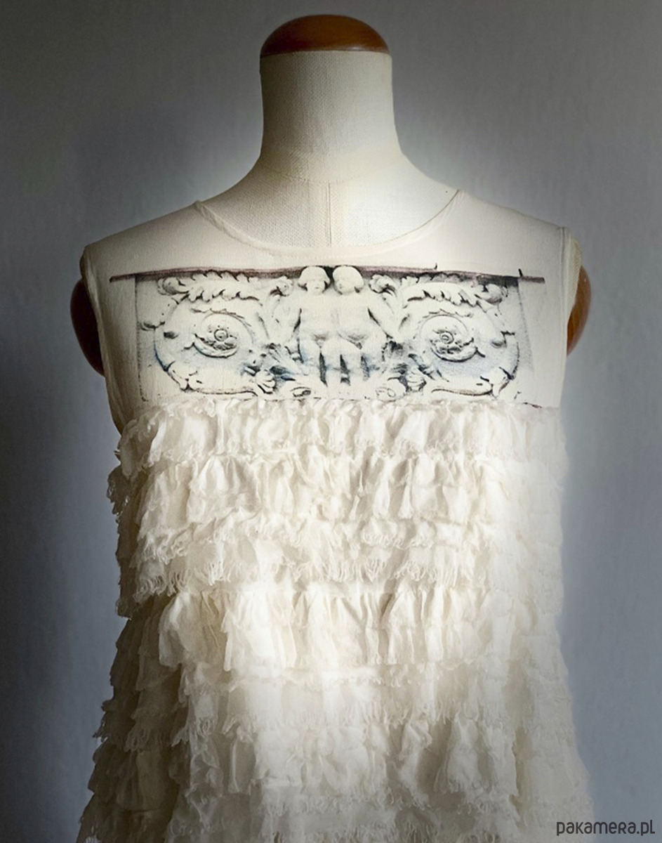 Bardzo, bardzo niekonwencjonalna suknia ślubna. Dla szczupłej, ekstrawaganckiej i …. odważnej. Suknia ślubna PUTTO. 100% jedwab naturalny. Uszyta z krepy jedwabnej i organzy jedwabnej. W kolorze biaałokremowym z efektem jakby futerka w wyniku naszycia nieskończonej ilości wystrzępionych falbanek- niesamowity efekt : ) Na karczku nadrukowany portal z łódzkiej kamienicy. Tył cały rozpinany na guziczki z masy perłowej. Można zrobić dowolnej długości rozporek z tyłu. Rozmiar moim zdaniem 34/36. Wymiary : Długość 143 cm, szerokość w biuście 86 cm i taka jest szerokość całej sukienki. Suknia ma bardzo atrakcyjną cenę ponieważ uczestniczyła w sesji zdjęciowej i nie jest całkiem nowa.