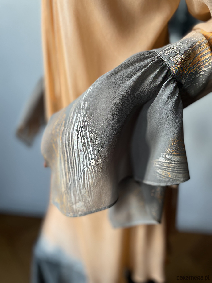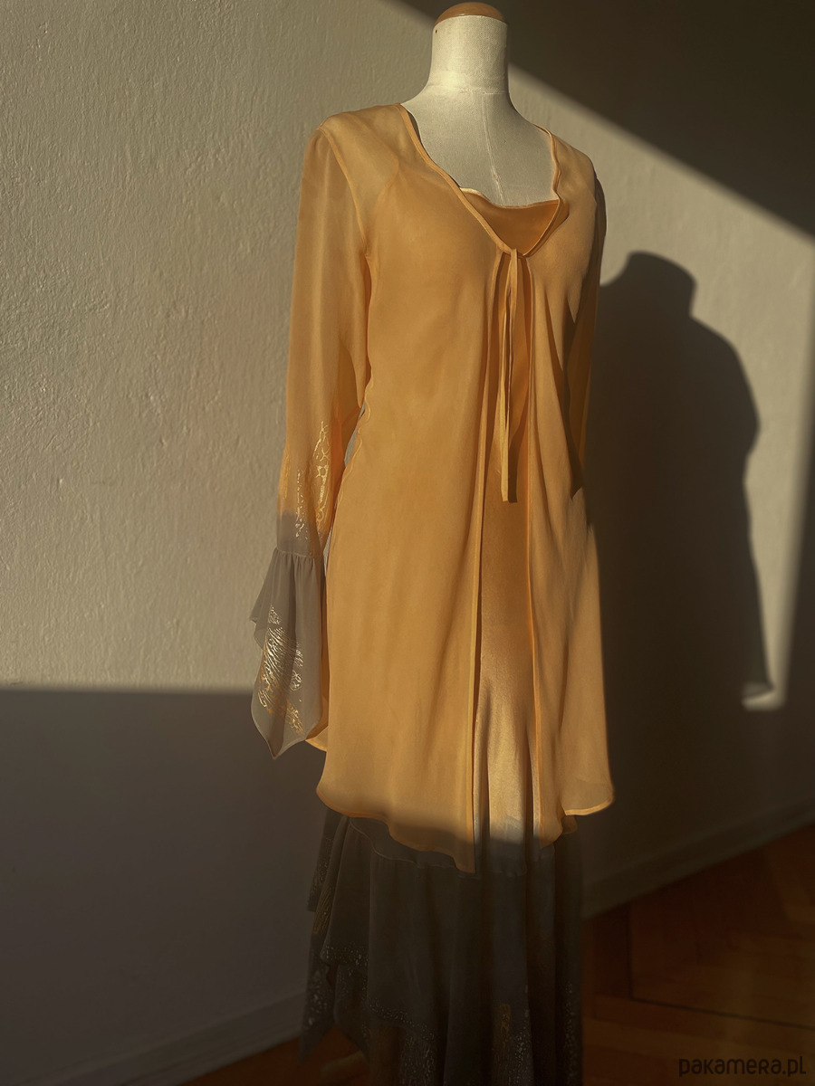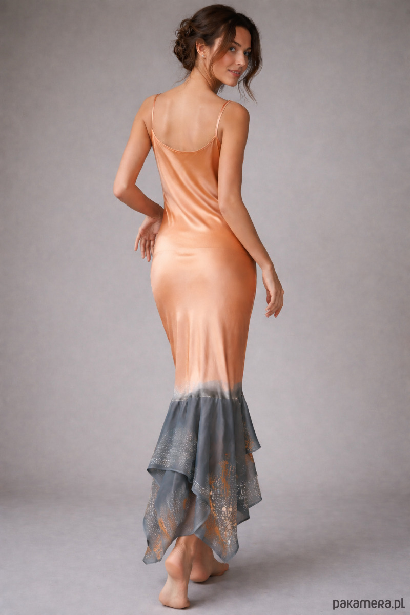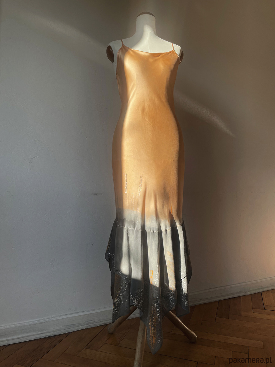Ekskluzywny komplet jedwabny : suknia Baga uszyta z atłasu jedwabnego ( 100% pure Silk ) z falbaną z jedwabnej żorżety i cardigan Baga uszyty z jedwabnej żorżetty. Suknia uszyta jest ze skosu, dzięki czemu układa się do figury i idealnie podkreśla sylwetkę. A jakby było coś do ukrycia - przykrycia do sukni jest w komplecie cardigan żorżetowy. Kolor jasna brzoskwinia zestawiona z monochromatyczną szarością malowana perłowymi kolorami w tej samej tonacji. Kreacja idealna na wesele albo inną większą uroczystość .