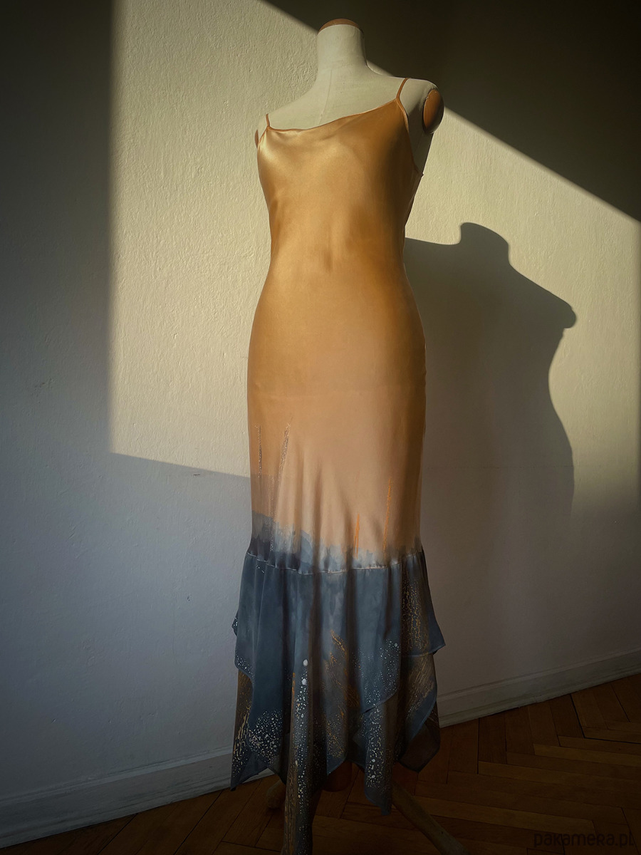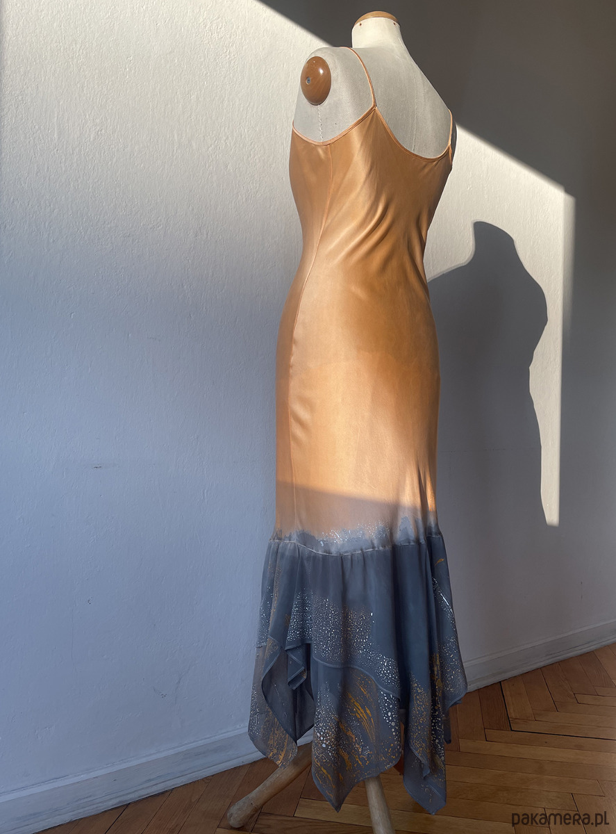 Wymiary ( przybliżone ponieważ sukienka jest ze skosu ) długość ramiączek 27 cm, biust max 100 cm, talia max 87 cm, biodra max 110 cm, długość sukienki 148 cm najdłuższy trójkąt i 130 cm najkrótszy trójkąt. Manekin krawiecki na którym pokazuję sukienkę ma wymiary : biust 93 cm, talia 76 cm, biodra 100 cm. Według mnie będzie dobra na rozmiar 38 - 40 - 42 . Cardigan żorżeta jedwabna : wymiary : długość tyłu 92 cm, długość przodu 97 cm, biust 100 cm, szerokość pleców 36 cm, długość rękawa 63/79 cm ponieważ jest wiązany reszta wymiarów nie ma praktycznie znaczenia. Z powodu całkowicie ręcznego wykonania i farbowania kompletu kolory nie są jednolite ( jak przy farbowaniu fabrycznym, szczególnie widać to na żorżecie jedwabnej. Zobacz zdjęcia : ) Komplet jest absolutnie unikatowy, jedyny i niepowtarzalny. Projekt i wykonanie Matylda Leśnikowska