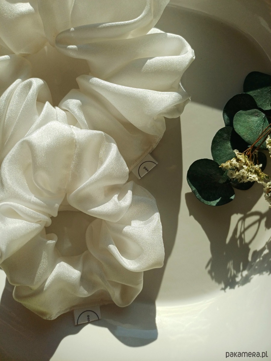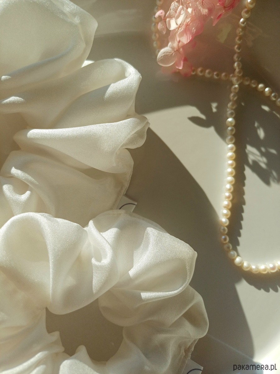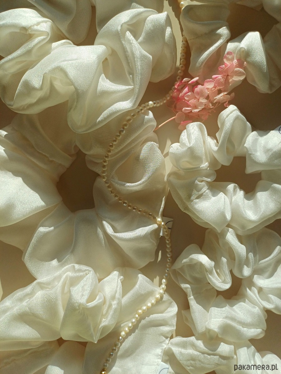 Bardzo delikatny zestaw scrunchie do włosów : wersja duża i mniejsza, kolor ecru, idealna,aby podkreślić piękno Twoich włosów,dbając przy tym o ich odpowiednią ochronę.