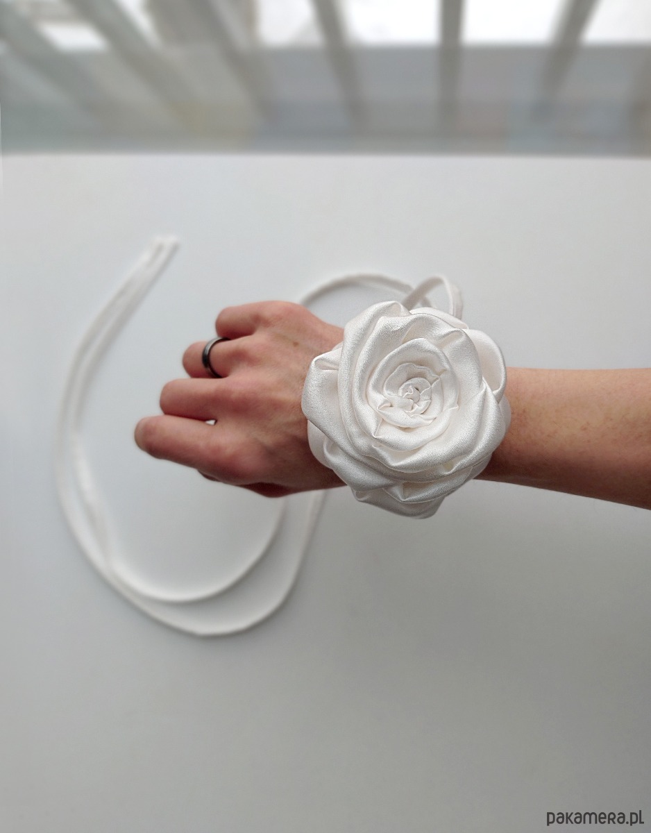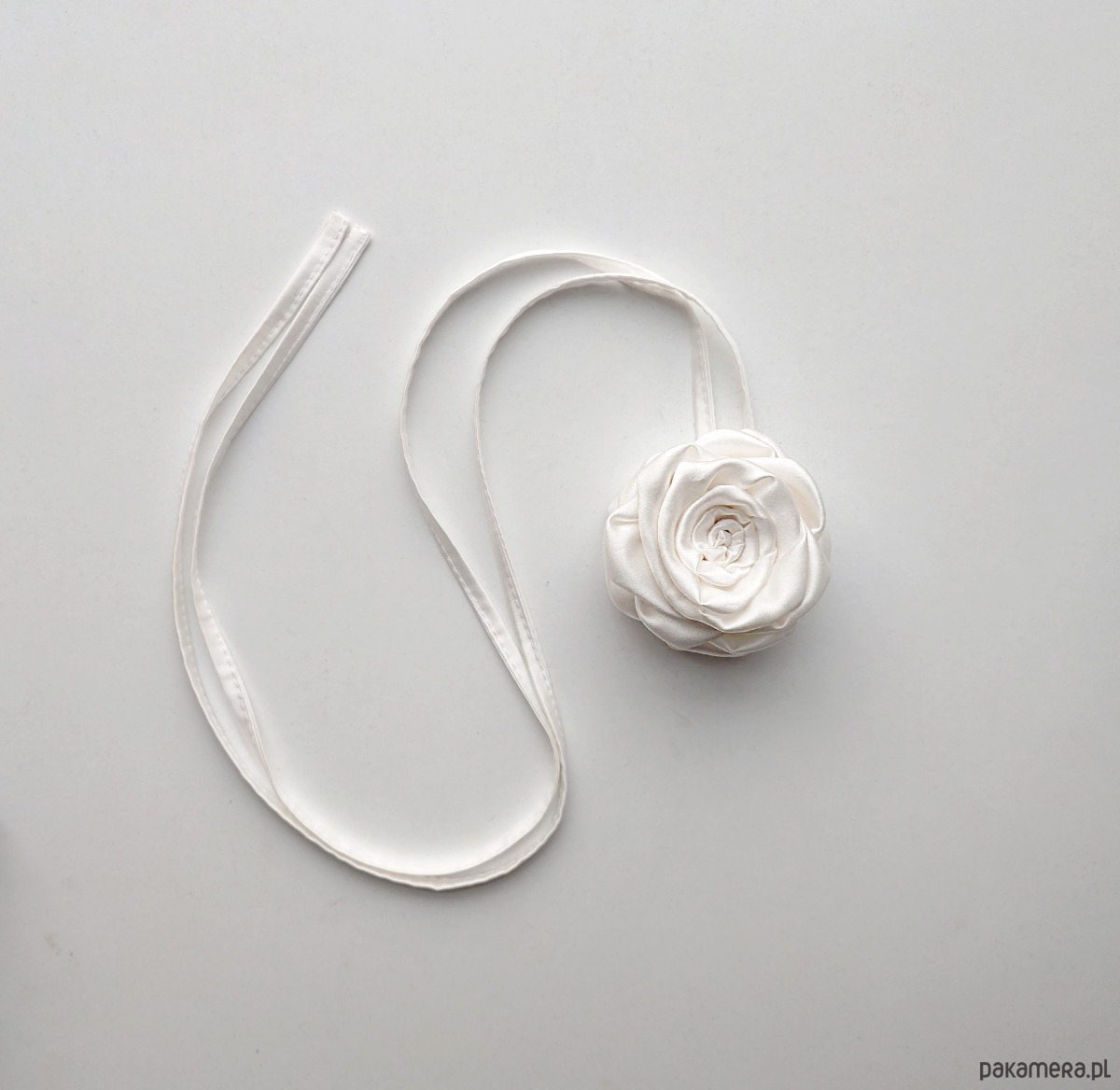 Piękny dodatek do stylizacji - jedwabny choker z różą w kolorze mlecznej bieli. Zachwycająco wymodelowana, subtelna, lecz niebagatelna ozdoba, która podbije każdą stylizację. Choker wkomponuje się w wiele stylizacji codziennych jak i tych na wielkie wyjście. Możesz go nosić zarówno na szyi jak i na nadgarstku, albo przyczepić go do ulubionej torebki, jako luksusowy dodatek, czy obwiązać wokół włosów.