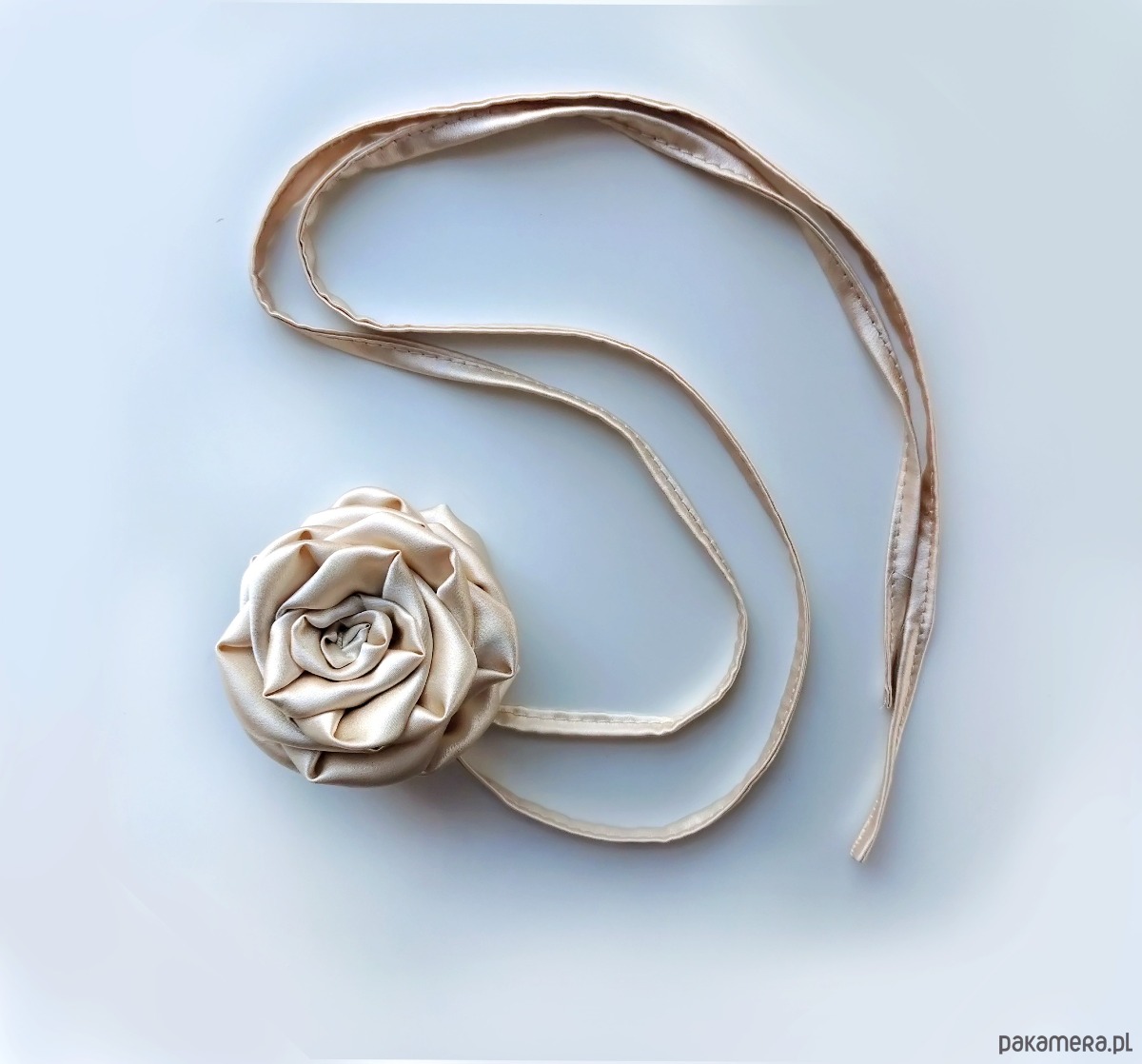 Piękny dodatek do stylizacji - jedwabny choker z różą . Zachwycająco wymodelowana, subtelna, lecz niebagatelna ozdoba, która podbije każdą stylizację. Choker w kolorze szampańskim (do wyboru toczek pod kolor lub czarny) wkomponuje się w wiele stylizacji codziennych jak i tych na wielkie wyjście. Możesz go nosić zarówno na szyi jak i na nadgarstku, albo przyczepić go do ulubionej torebki, jako luksusowy dodatek, czy obwiązać wokół włosów.