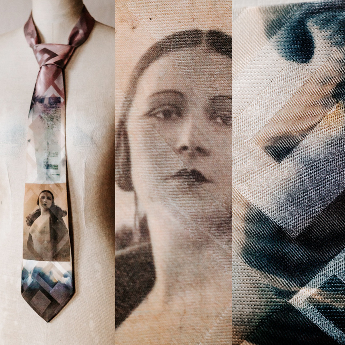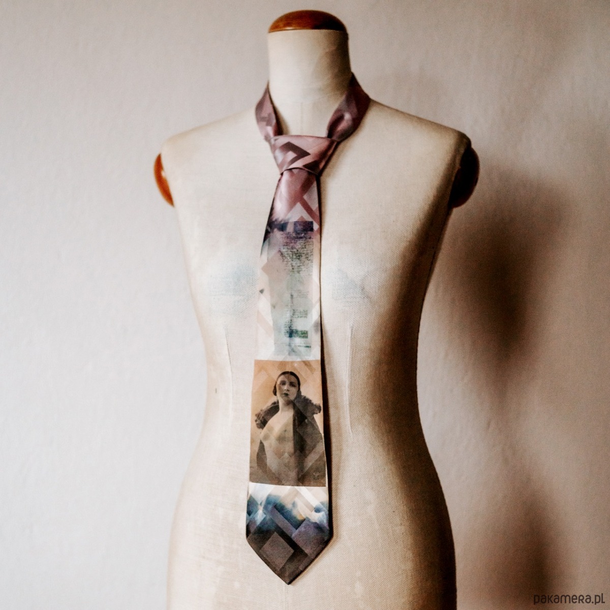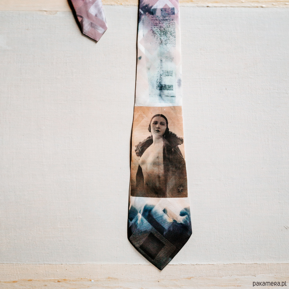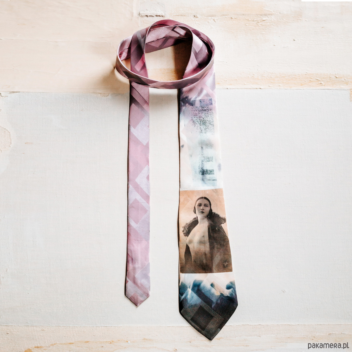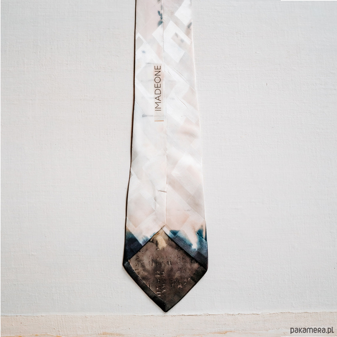 Krawat AKT dla niej ( jako pasek, jako naszyjnik, miękka biżuteria - akcent do wieczornej stylizacji ) lub dla niego. Wykonany autorską techniką w jednym egzemplarzu z atłasu jedwabnego żakardowego. Ze starym aktem z albumu dziadka Karola. Kolory: jasny, perłowy róż, perłowa szarość, ecru, grafit - nieoczywiste i niedookreślone, grające światłem i cieniem, błyskiem i matem. Wymiary: długość 150 cm, szerokość 9,5 cm ( szerszy koniec ) i 4 cm ( węższy ) Projekt i wykonanie Matylda Leśnikowska